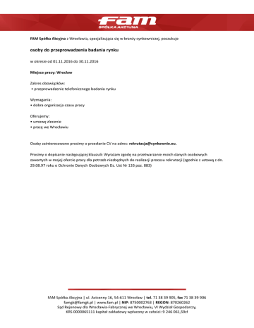 FAM Spółka Akcyjna z Wrocławia, specjalizująca się w branży cynkowniczej, poszukuje osoby do przeprowadzenia badania rynku w okresie od 01.11.2016 do 30.11.2016 Miejsce pracy: Wrocław Zakres obowiązków: • przeprowadzenie telefonicznego badania rynku Wymagania: • dobra organizacja czasu pracy Oferujemy: • umowę zlecenie • pracę we Wrocławiu Osoby zainteresowane prosimy o przesłanie CV na adres: [email protected]. Prosimy o dopisanie następującej klauzuli: Wyrażam zgodę na przetwarzanie moich danych osobowych zawartych w mojej ofercie pracy dla potrzeb niezbędnych do realizacji procesu rekrutacji (zgodnie z ustawą z dn. 29.08.97 roku o Ochronie Danych Osobowych Dz. Ust Nr 133 poz. 883) FAM Spółka Akcyjna | ul. Avicenny 16, 54-611 Wrocław | tel. 71 38 39 905, fax 71 38 39 906 [email protected] | www.fam.pl | NIP: 8750002763 | REGON: 870260262 Sąd Rejonowy dla Wrocławia-Fabrycznej we Wrocławiu, VI Wydział Gospodarczy, KRS 0000065111 kapitał zakładowy wpłacony w całości: 9 246 061,59zł