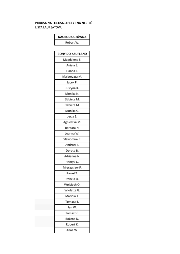 POKUSA NA FOCUSA, APETYT NA NESTLÉ LISTA LAUREATÓW: NAGRODA GŁÓWNA Robert W. BONY DO KAUFLAND Magdalena S. Aniela Ż. Hanna F. Małgorzata M. Jacek P. Justyna K. Monika N. Elżbieta M. Elżbieta M. Monika G. Jerzy S. Agnieszka M. Barbara N. Joanna W. Sławomira P. Andrzej B. Dorota B. Adrianna N. Henryk G. Mieczysław F. Paweł T. Izabela O. Wojciech O. Wioletta G. Mariola K. Tomasz B. Jan W. Tomasz C. Bożena N. Robert K. Anna W. Paweł L. Matylda K. Sylwia W. Piotr T. Elżbieta G. Piotr R. Marek R. Krzysztof J. Ewa K. Iwona L. Aneta S. Waldemar N. Zofia S. Katarzyna G. Łukasz Ś. Krystyna G. Jolanta B. Lidia W. Władysław Ś. Karina G. Sylwis K. Ilona R. Anna K. Krzysztof M. Marek K. Józef H. Michał P. Małgorzata J. Andzej K. Wojciech S. Piotr P. Katarzyna Ł. Beata R. Adam M. Bornisław P. Edyta D. Barbara H. Tomasz S. Zbigniew F. Maria P. Bogusław Z. Piotr K. Rafał M. Iwona L.