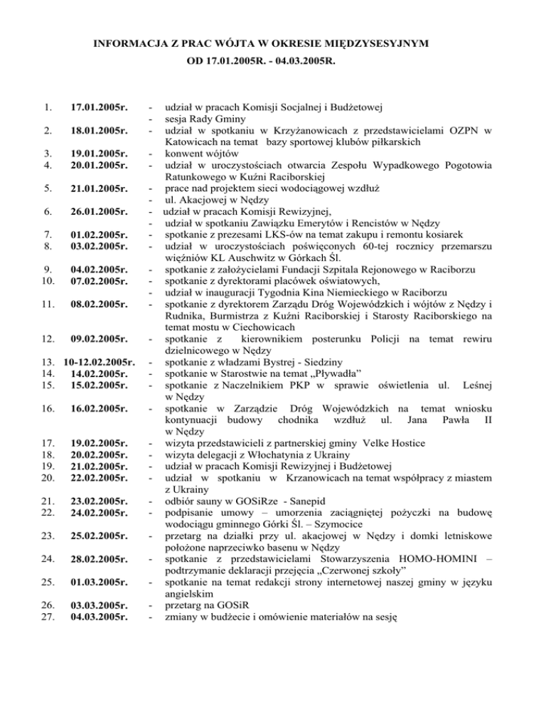 INFORMACJA Z PRAC WÓJTA W OKRESIE MIĘDZYSESYJNYM OD 17.01.2005R. - 04.03.2005R. 1. 17.01.2005r. 2. 18.01.2005r. - 3. 4. 19.01.2005r. 20.01.2005r. - 5. 21.01.2005r. 6. 26.01.2005r. 7. 8. 01.02.2005r. 03.02.2005r. - 9. 10. 04.02.2005r. 07.02.2005r. 11. 08.02.2005r. - 12. 09.02.2005r. - 13. 10-12.02.2005r. 14. 14.02.2005r. 15. 15.02.2005r. - 16. 16.02.2005r. - 17. 18. 19. 20. 19.02.2005r. 20.02.2005r. 21.02.2005r. 22.02.2005r. - 21. 22. 23.02.2005r. 24.02.2005r. - 23. 25.02.2005r. - 24. 28.02.2005r. - 25. 01.03.2005r. - 26. 27. 03.03.2005r. 04.03.2005r. - udział w pracach Komisji Socjalnej i BudŜetowej sesja Rady Gminy udział w spotkaniu w KrzyŜanowicach z przedstawicielami OZPN w Katowicach na temat bazy sportowej klubów piłkarskich konwent wójtów udział w uroczystościach otwarcia Zespołu Wypadkowego Pogotowia Ratunkowego w Kuźni Raciborskiej prace nad projektem sieci wodociągowej wzdłuŜ ul. Akacjowej w Nędzy udział w pracach Komisji Rewizyjnej, udział w spotkaniu Zawiązku Emerytów i Rencistów w Nędzy spotkanie z prezesami LKS-ów na temat zakupu i remontu kosiarek udział w uroczystościach poświęconych 60-tej rocznicy przemarszu więźniów KL Auschwitz w Górkach Śl. spotkanie z załoŜycielami Fundacji Szpitala Rejonowego w Raciborzu spotkanie z dyrektorami placówek oświatowych, udział w inauguracji Tygodnia Kina Niemieckiego w Raciborzu spotkanie z dyrektorem Zarządu Dróg Wojewódzkich i wójtów z Nędzy i Rudnika, Burmistrza z Kuźni Raciborskiej i Starosty Raciborskiego na temat mostu w Ciechowicach spotkanie z kierownikiem posterunku Policji na temat rewiru dzielnicowego w Nędzy spotkanie z władzami Bystrej - Siedziny spotkanie w Starostwie na temat „Pływadła” spotkanie z Naczelnikiem PKP w sprawie oświetlenia ul. Leśnej w Nędzy spotkanie w Zarządzie Dróg Wojewódzkich na temat wniosku kontynuacji budowy chodnika wzdłuŜ ul. Jana Pawła II w Nędzy wizyta przedstawicieli z partnerskiej gminy Velke Hostice wizyta delegacji z Włochatynia z Ukrainy udział w pracach Komisji Rewizyjnej i BudŜetowej udział w spotkaniu w Krzanowicach na temat współpracy z miastem z Ukrainy odbiór sauny w GOSiRze - Sanepid podpisanie umowy – umorzenia zaciągniętej poŜyczki na budowę wodociągu gminnego Górki Śl. – Szymocice przetarg na działki przy ul. akacjowej w Nędzy i domki letniskowe połoŜone naprzeciwko basenu w Nędzy spotkanie z przedstawicielami Stowarzyszenia HOMO-HOMINI – podtrzymanie deklaracji przejęcia „Czerwonej szkoły” spotkanie na temat redakcji strony internetowej naszej gminy w języku angielskim przetarg na GOSiR zmiany w budŜecie i omówienie materiałów na sesję