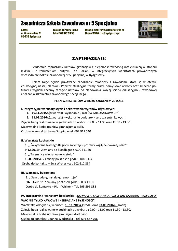 zaproszenie i terminy warsztatów - Zasadnicza Szkoła Zawodowa nr 5