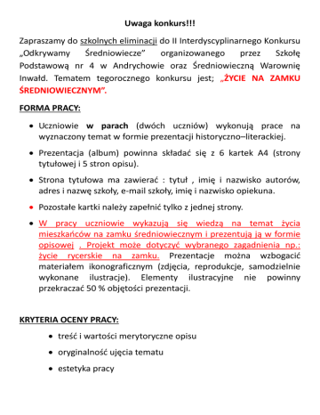 Uwaga konkurs!!! Zapraszamy do szkolnych eliminacji do II Interdyscyplinarnego Konkursu „Odkrywamy Średniowiecze” organizowanego przez Szkołę Podstawową nr 4 w Andrychowie oraz Średniowieczną Warownię Inwałd. Tematem tegorocznego konkursu jest; „ŻYCIE NA ZAMKU ŚREDNIOWIECZNYM”. FORMA PRACY: Uczniowie w parach (dwóch uczniów) wykonują prace na wyznaczony temat w formie prezentacji historyczno–literackiej. Prezentacja (album) powinna składać się z 6 kartek A4 (strony tytułowej i 5 stron opisu). Strona tytułowa ma zawierać : tytuł , imię i nazwisko autorów, adres i nazwę szkoły, e-mail szkoły, imię i nazwisko opiekuna. Pozostałe kartki należy zapełnić tylko z jednej strony. W pracy uczniowie wykazują się wiedzą na temat życia mieszkańców na zamku średniowiecznym i prezentują ją w formie opisowej . Projekt może dotyczyć wybranego zagadnienia np.: życie rycerskie na zamku. Prezentacje można wzbogacić materiałem ikonograficznym (zdjęcia, reprodukcje, samodzielnie wykonane ilustracje). Elementy ilustracyjne nie powinny przekraczać 50 % objętości prezentacji. KRYTERIA OCENY PRACY: treść i wartości merytoryczne opisu oryginalność ujęcia tematu estetyka pracy W naszych szkolnych eliminacjach wyłonimy zwycięski album, który weźmie udział w preeliminacjach do II Interdyscyplinarnego Konkursu „Odkrywamy Średniowiecze”. Prace należy dostarczyć do dnia 24 października do p. Anety Wilczak