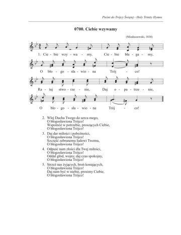 Pieśni do Trójcy Świętej - Holy Trinity Hymns 0700. Ciebie wzywamy (Mioduszewski, 1838) 1. Cie - bie wzy - wa - my, Cie - bie bła - ga - my, O bło - go - sła - wio - na Trój - co! Ra - tuj stwo - rze - nie, Daj o - pa - trze - nie, O bło - go - sła - wio - na Trój - co! 2. Wlej Ducha Twego do serca mego, O błogosławiona Trójco! Wspomóż w potrzebie, proszących Ciebie, O błogosławiona Trójco! 3. Daj dar miłości i pobożności, O błogosławiona Trójco! Szczęść zebranemu ludowi Twemu, O błogosławiona Trójco! 4. Odpuść nam złości dla Twej miłości, O błogosławiona Trójco! Oddal głód, wojny, daj czas spokojny, O błogosławiona Trójco! 5. Strzeż nas żyjących, broń konających, O błogosławiona Trójco! Daj nam być w niebie, prosimy Ciebie, O błogosławiona Trójco!