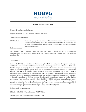 Raport Bieżący nr 75/2014 Numer i Data Raportu Bieżącego: Raport Bieżący nr 75/2014 z dnia 6 listopad 2014 roku. Temat Raportu Bieżącego: ROBYG S.A. – Podstawa prawna: Uzyskanie zgody Prezesa Urzędu Ochrony Konkurencji i Konsumentów na dokonanie koncentracji z NCRE II Investments Limited w odniesieniu do projektu deweloperskiego powadzonego przez spółkę ROBYG Mokotów Investment Sp. z o.o. Art. 56 ust. 1 pkt 1 ustawy z dnia 29 lipca 2005 roku o ofercie publicznej i warunkach wprowadzania instrumentów finansowych do zorganizowanego obrotu oraz o spółkach publicznych. Treść raportu: Zarząd ROBYG S.A. z siedzibą w Warszawie („Spółka”) w nawiązaniu do raportu bieżącego nr 66/2014 z 19 września 2014 roku niniejszym, informuje, że w dniu 5 listopada 2014 roku Spółka otrzymała decyzję Prezesa Urzędu Ochrony Konkurencji i Konsumentów wyrażającą zgodę na utworzenie przez Spółkę z NCRE II Investments Limited z siedzibą w Limassol na Cyprze (“NCRE”) w ramach spółki ROBYG Mokotów Investment Sp. z o.o. („RMI”) wspólnego przedsięwzięcia. W konsekwencji, NCRE zgodnie z warunkową umową sprzedaży udziałów w RMI, o której Spółka informowała w.w. raportem bieżącym, nabędzie 49% udziałów w kapitale zakładowym RMI, a projekt deweloperski prowadzony przez tę spółkę będzie prowadzony jako wspólne przedsięwzięcie Spółki i NCRE. Jednakże, uwzględniając zapisy umowy o wspólnym przedsięwzięciu, o której Spółka informowała w.w. raportem bieżącym, Spółka ma kontrolę nad RMI i w związku z tym RMI będzie konsolidowana metodą pełną w skonsolidowanym sprawozdaniu finansowym Grupy Kapitałowej Spółki. Podpisy osób zarządzających: Zbigniew Okoński – Prezes Zarządu ROBYG S.A. Artur Ceglarz – Wiceprezes Zarządu ROBYG S.A.