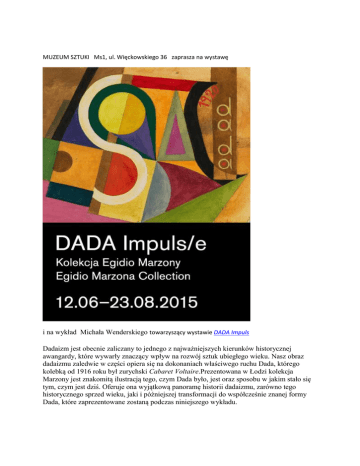 MUZEUM SZTUKI Ms1, ul. Więckowskiego 36 zaprasza na wystawę i na wykład Michała Wenderskiego towarzyszący wystawie DADA Impuls Dadaizm jest obecnie zaliczany to jednego z najważniejszych kierunków historycznej awangardy, które wywarły znaczący wpływ na rozwój sztuk ubiegłego wieku. Nasz obraz dadaizmu zaledwie w części opiera się na dokonaniach właściwego ruchu Dada, którego kolebką od 1916 roku był zurychski Cabaret Voltaire.Prezentowana w Łodzi kolekcja Marzony jest znakomitą ilustracją tego, czym Dada było, jest oraz sposobu w jakim stało się tym, czym jest dziś. Oferuje ona wyjątkową panoramę historii dadaizmu, zarówno tego historycznego sprzed wieku, jaki i późniejszej transformacji do współcześnie znanej formy Dada, które zaprezentowane zostaną podczas niniejszego wykładu.