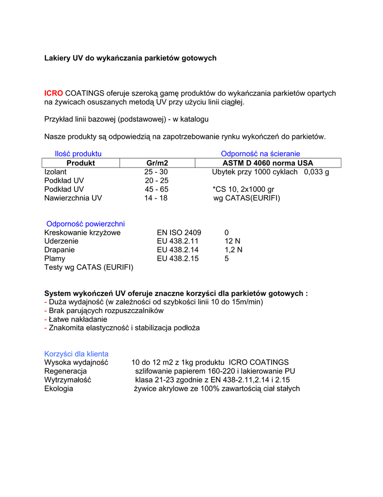 Lakiery UV do wykańczania parkietów gotowych ICRO COATINGS oferuje szeroką gamę produktów do wykańczania parkietów opartych na żywicach osuszanych metodą UV przy użyciu linii ciągłej. Przykład linii bazowej (podstawowej) - w katalogu Nasze produkty są odpowiedzią na zapotrzebowanie rynku wykończeń do parkietów. Ilość produktu Produkt Izolant Podkład UV Podkład UV Nawierzchnia UV Gr/m2 25 - 30 20 - 25 45 - 65 14 - 18 Odporność powierzchni Kreskowanie krzyżowe Uderzenie Drapanie Plamy Testy wg CATAS (EURIFI) EN ISO 2409 EU 438.2.11 EU 438.2.14 EU 438.2.15 Odporność na ścieranie ASTM D 4060 norma USA Ubytek przy 1000 cyklach 0,033 g *CS 10, 2x1000 gr wg CATAS(EURIFI) 0 12 N 1,2 N 5 System wykończeń UV oferuje znaczne korzyści dla parkietów gotowych : - Duża wydajność (w zależności od szybkości linii 10 do 15m/min) - Brak parujących rozpuszczalników - Łatwe nakładanie - Znakomita elastyczność i stabilizacja podłoża Korzyści dla klienta Wysoka wydajność Regeneracja Wytrzymałość Ekologia 10 do 12 m2 z 1kg produktu ICRO COATINGS szlifowanie papierem 160-220 i lakierowanie PU klasa 21-23 zgodnie z EN 438-2.11,2.14 i 2.15 żywice akrylowe ze 100% zawartością ciał stałych