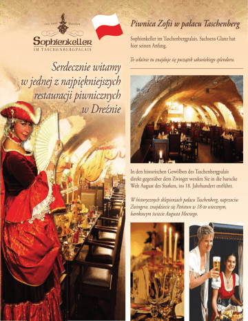 Piwnica Zofii w pałacu Taschenberg Sophienkeller im Taschenbergpalais. Sachsens Glanz hat hier seinen Anfang. Serdecznie witamy w jednej z najpiękniejszych restauracji piwnicznych w Dreźnie To właśnie tu znajduje się początek saksońskiego splendoru. In den historischen Gewölben des Taschenbergpalais direkt gegenüber dem Zwinger werden Sie in die barocke Welt August des Starken, ins 18. Jahrhundert entführt. W historycznych sklepieniach pałacu Taschenberg, naprzeciw Zwingera, znajdziecie się Państwo w 18-to wiecznym, barokowym świecie Augusta Mocnego. Das „Zeithainer Lustlager“ bot einst prächtige Kulisse für August den Starken, als er 1730 dem preußischen König bei Zeithain seine reformierte Armee präsentierte. In der offenen Feldküche brutzelten Köstlichkeiten am Spieß und dufteten, dass es eine Lust war. So ist es heute wieder, auch das bunte Treiben in den preußischen Pavillons, der badischen Galerie oder am sich drehenden Karussell. Okazałym kulisami dla Augusta Mocnego był tzw. „Obóz rozrywkowy w Zeithain“, w którym zaprezentowano w roku 1730 pruskiemu królowi zreformowaną armię saksońską. W otwartej kuchni polowej skwierczały smakołyki na rożnie i kusiły do ich spożycia. Dziś znajdziecie ten barwny zgiełk w pawilonie pruskim, galerii badeńskiej i przy karuzeli. Kurfürst August der Starke, Gräfin Cosel, Zauberer, Gaukler und allerlei Künstlervolk sorgen all abendlich augenzwinkernd für Unterhaltung und gute Stimmung. Książę elektor August Mocny, hrabina Cosel, magicy, sztukmistrze i rozmaici artyści troszczą się z przymrużeniem oka co wieczór o rozrywkę i dobry nastrój. Liebliche Mägde tafeln Ihnen beste sächsische Spezialitäten auf. Urocze panny ugoszczą Państwa najlepszymi saksońskimi specjałami. Der „Alchimistenkeller“ erinnert an den Apotheker Johann Friedrich Böttger, der das Geheimnis des Porzellans löste und das „Weiße Gold“ erfand. Hier können Sie den Alchimistenschmaus genießen. Bei einem selbstgezapften Bier oder sächsischem Wein schmeckt dieser natürlich noch besser. In der Klosterbäckerei mit historischen Backofen, im Museum mit der großen Freiherrentafel, dem großen und kleinen Zunftgewölbe oder aber im Wächtergang lassen sich viele interessante Zeugnisse entdecken, die Auskunft geben über das Leben vergangener Zeit. „Piwnica alchemika“ przypomina nam aptekarza Jana Fryderyka Boettgera, któremu udało się rozwiązać tajemicę porcelany i to on wynalazł „białe złoto”. Tu możecie delektować się rozkoszną „ucztą alchemika”. Przy włanoręcznie utoczonym piwie beczkowym lub saksońskim winie smakują te specjalności o wiele lepiej. W piekarni klasztornej z historycznym piekarnikiem, w muzeum z dużym biesiadnym stołem , w dużym i małym sklepieniu cechowym można odnaleźć interesujące ślady historii, które informują nas o życiu w minionych czasach. Ein Muss bei jedem Dresdenbesuch: Das berühmte „Dresdner Trichtertrinken“ dürfen Sie sich auf keinen Fall entgehen lassen. Koniecznością podczas wizyty w Dreźnie jest sławne „ picie z drezdeńskiego lejka”. Takiej okazji nie powinniście Państwo zaprzepaścić. Mauerteile der ersten „Einsiedelschen Häuser“ aus dem 14. Jahrhundert lassen erahnen: Von hier nahm vieles überhaupt seinen Anfang, was heute Sachsens Glanz ausmacht. Części murów pierwszego domu hrabiego Einsiedel z 14-tego wieku pozwalają nam się domyślać, że to tu znajduje się początek saksońskiego nimbu. Sophienkeller im Taschenbergpalais Taschenberg 3 • 01067 Dresden Tel.: +49 (0)351 - 4 97 26 - 0 Fax: +49 (0)351 - 4 97 26 - 11 E-Mail: [email protected] Internet: www.sophienkeller-dresden.de Sie finden uns im historischen Zentrum von Dresden, in den Gewölben des „Taschenbergpalais“ direkt gegenüber dem Glockenspielpavillon des „Dresdner Zwingers“. In der näheren Umgebung und ganz einfach zu Fuß zu erreichen sind die „Semperoper“, der „Goldene Reiter“, die „Brühlsche Terrasse“ und die „Frauenkirche“. Znajdziecie nas Państwo w historycznym centrum Drezna, w sklepieniach pałacu „Taschenberg”. Ten znajduje się dosłownie naprzeciw pawilonu z kurantem w drezdeńskim Zwingerze. W bezpośrednim sąsiedztwie znajduje się Opera Sempera, „Złoty Jeździec”, „Tarasy Bruehla” i kościół „Frauenkirche”, do których można pieszo dotrzeć. Piwnica Zofii posiada 450 miejsc i jest codziennie otwarta w godzinach do 11.00 – do 01.00. Nasze urocze panny i grenadierzy serdecznie Was ugoszczą.
