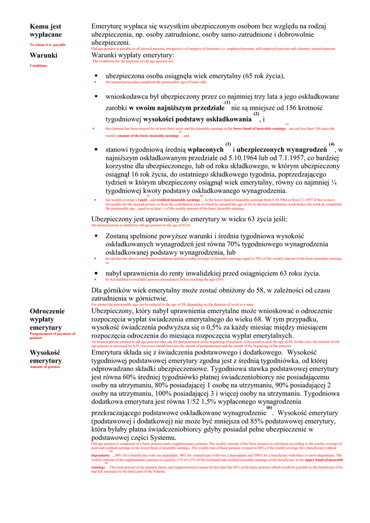 Komu jest wypłacane To whom it is payable Emeryturę wypłaca się wszystkim ubezpieczonym osobom bez względu na rodzaj ubezpieczenia, np. osoby zatrudnione, osoby samo-zatrudnione i dobrowolnie ubezpieczeni. Old age pension is payable to all insured persons, irrespective of category of insurance i.e. employed persons, self-employed persons and voluntary insured persons. Warunki Warunki wypłaty emerytury: The conditions for the payment of old age pension are: Conditions ubezpieczona osoba osiągnęła wiek emerytalny (65 rok życia), the insured person has completed the pensionable age (65years old), wnioskodawca był ubezpieczony przez co najmniej trzy lata a jego oskładkowane (1) zarobki w swoim najniższym przedziale nie są mniejsze od 156 krotność tygodniowej wysokości podstawy oskładkowania (2) ,i (1) the claimant has been insured for at least three years and his insurable earnings in the lower band of insurable earnings are not less than 156 times the (2) weekly amount of the basic insurable earnings , and (3) (4) stanowi tygodniową średnią wpłaconych i ubezpieczonych wynagrodzeń , w najniższym oskładkowanym przedziale od 5.10.1964 lub od 7.1.1957, co bardziej korzystne dla ubezpieczonego, lub od roku składkowego, w którym ubezpieczony osiągnął 16 rok życia, do ostatniego składkowego tygodnia, poprzedzającego tydzień w którym ubezpieczony osiągnął wiek emerytalny, równy co najmniej ¼ tygodniowej kwoty podstawy oskładkowanego wynagrodzenia. has weekly average of paid and credited insurable earnings , in the lower band of insurable earnings from 5.10.1964 or from 7.1.1957 if this is more favourable for the insured person, or from the contribution year in which he attained the age of 16, to the last contribution week before the week he completed the pensionable age , equal to at least ¼ of the weekly amount of the basic insurable earnings. (3) (4) Ubezpieczony jest uprawniony do emerytury w wieku 63 życia jeśli: An insured person is entitled to old age pension at the age of 63 if: Zostaną spełnione powyższe warunki i średnia tygodniowa wysokość oskładkowanych wynagrodzeń jest równa 70% tygodniowego wynagrodzenia oskładkowanej podstawy wynagrodzenia, lub he satisfies the above contribution conditions and has weekly average of insurable earnings equal to 70% of the weekly amount of the basic insurable earnings, or nabył uprawnienia do renty inwalidzkiej przed osiągnięciem 63 roku życia. he was entitled to invalidity pension immediately before reaching the age of 63. Dla górników wiek emerytalny może zostać obniżony do 58, w zależności od czasu zatrudnienia w górnictwie. For miners the pensionable age can be reduced to the age of 58, depending on the duration of work to a mine. Odroczenie wypłaty emerytury Postponement of payment of pension Ubezpieczony, który nabył uprawnienia emerytalne może wnioskować o odroczenie rozpoczęcia wypłat świadczenia emerytalnego do wieku 68. W tym przypadku, wysokość świadczenia podwyższa się o 0,5% za każdy miesiąc między miesiącem rozpoczęcia odroczenia do miesiąca rozpoczęcia wypłat emerytalnych. An insured person entitled to old age pension may ask for postponement of the beginning of payment of his pension until the age of 68. In this case, the amount of old age pension is increased by 0,5% for every month between the month of postponement and the month of the beginning of the pension. Wysokość emerytury Amount of pension Emerytura składa się z świadczenia podstawowego i dodatkowego. Wysokość tygodniowej podstawowej emerytury zgodna jest z średnią tygodniówka, od której odprowadzano składki ubezpieczeniowe. Tygodniowa stawka podstawowej emerytury jest równa 60% średniej tygodniówki płatnej świadczeniobiorcy nie posiadającemu osoby na utrzymaniu, 80% posiadającej 1 osobę na utrzymaniu, 90% posiadającej 2 osoby na utrzymaniu, 100% posiadającej 3 i więcej osoby na utrzymaniu. Tygodniowa dodatkowa emerytura jest równa 1/52 1,5% wypłaconego wynagrodzenia (6) przekraczającego podstawowe oskładkowane wynagrodzenie . Wysokość emerytury (podstawowej i dodatkowej) nie może być mniejsza od 85% podstawowej emerytury, która byłaby płatna świadczeniobiorcy gdyby posiadał pełne ubezpieczenie w podstawowej części Systemu. Old age pension is composed of a basic pension and a supplementary pension. The weekly amount of the basic pension is calculated according to the weekly average of paid and credited earnings in the lower band of insurable earnings. The weekly rate of basic pension is equal to 60% of the weekly average for a beneficiary without (5) dependants , 80% for a beneficiary with one dependant, 90% for a beneficiary with two 2 dependants and 100% for a beneficiary with three or more dependants. The weekly amount of the supplementary pension is equal to 1/52 of 1,5% of the total paid and credited insurable earnings of the beneficiary in the upper band of insurable (6) earnings . The total amount of the pension (basic and supplementary) cannot be less than the 85% of the basic pension which would be payable to the beneficiary if he had full insurance to the basic part of the Scheme. Dla celów prawidłowego naliczenia świadczenia emerytalnego, oskładkowane wynagrodzenia ubezpieczonego są rewaloryzowane zależnie od wysokości podstawowego oskładkowanego wynagrodzenia na dzień, w którym świadczeniobiorca osiągnął wiek emerytalny. For the purpose of calculating the amount of the pension, the insurable earnings of the insured person are revalued according to the amount of the basic insurable earnings on the day they reach the pensionable age. Wysokość miesięcznej emerytury oblicza się mnożąc tygodniową jej wysokość przez cztery. The monthly amount of old age pension is calculated after multiplying the weekly amount by four. Każdego roku w grudniu wypłacana jest trzynasta emerytura równa 1/12 jej rocznej wysokości. th In Decemb