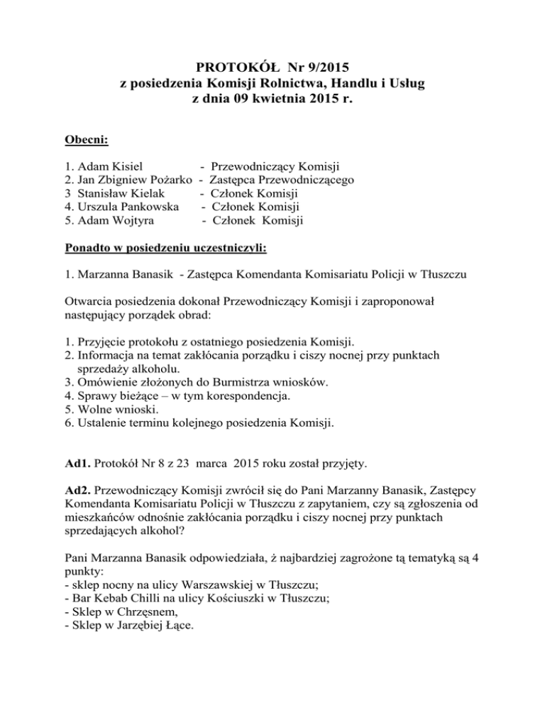 PROTOKÓŁ Nr 9/2015 z posiedzenia Komisji Rolnictwa, Handlu i Usług z dnia 09 kwietnia 2015 r. Obecni: 1. Adam Kisiel 2. Jan Zbigniew Pożarko 3 Stanisław Kielak 4. Urszula Pankowska 5. Adam Wojtyra - Przewodniczący Komisji - Zastępca Przewodniczącego - Członek Komisji - Członek Komisji - Członek Komisji Ponadto w posiedzeniu uczestniczyli: 1. Marzanna Banasik - Zastępca Komendanta Komisariatu Policji w Tłuszczu Otwarcia posiedzenia dokonał Przewodniczący Komisji i zaproponował następujący porządek obrad: 1. Przyjęcie protokołu z ostatniego posiedzenia Komisji. 2. Informacja na temat zakłócania porządku i ciszy nocnej przy punktach sprzedaży alkoholu. 3. Omówienie złożonych do Burmistrza wniosków. 4. Sprawy bieżące – w tym korespondencja. 5. Wolne wnioski. 6. Ustalenie terminu kolejnego posiedzenia Komisji. Ad1. Protokół Nr 8 z 23 marca 2015 roku został przyjęty. Ad2. Przewodniczący Komisji zwrócił się do Pani Marzanny Banasik, Zastępcy Komendanta Komisariatu Policji w Tłuszczu z zapytaniem, czy są zgłoszenia od mieszkańców odnośnie zakłócania porządku i ciszy nocnej przy punktach sprzedających alkohol? Pani Marzanna Banasik odpowiedziała, ż najbardziej zagrożone tą tematyką są 4 punkty: - sklep nocny na ulicy Warszawskiej w Tłuszczu; - Bar Kebab Chilli na ulicy Kościuszki w Tłuszczu; - Sklep w Chrzęsnem, - Sklep w Jarzębiej Łące. Przy tych czterech punktach występuje największe zagrożenie zakłócania porządku i ciszy nocnej szczególnie w weekendy i są one objęte ścisłym nadzorem policji. Na każde zgłoszenie mieszkańców jest natychmiastowa reakcja policji. Osoby legitymowane w tych miejscach otrzymują mandaty, bądź są sporządzane wnioski o ukaranie do sądu grodzkiego. Przeprowadzane są również rozmowy z osobami prowadzącymi sklepy lub punkty gastronomiczne oraz pouczane są te osoby o obowiązkach i potrzebie dbania o porządek. Zwiększył się stan osobowy patrolu policyjnego. Do dyspozycji jest więcej policjantów i na naszą gminę i gminę Klembów są dwie załogi. Przewodniczący Komisji zapytał, czy wpływają skargi na punkty handlowe odnośnie sprzedaży alkoholu nieletnim. Pani Marzanna Banasik odpowiedziała, że nie wpłynęła żadna skarga, ani żadna informacja Dalsza dyskusja dotyczyła stanu bezpieczeństwa, ładu i porządku w gminie. Ad3. Przewodniczący Komisji poinformował, że rozmawiał z Burmistrzem na temat zgłoszenia kandydatury Pana Mirosława Szczotki do odznaczenia „Zasłużony dla rolnictwa” i uzyskał informację, że taki wniosek został już złożony do Ministerstwa Rolnictwa i Rozwoju Wsi. Ad4. Do Komisji wpłynęła następująca korespondencja: 1. Zarząd Stowarzyszenie Młodzieżowej Orkiestry Dętej w Tłuszczu wystosował pismo do Burmistrza i Rady Miejskiej w Tłuszczu, w którym opisał działalność Orkiestry i zwrócił się o zabezpieczenie w budżecie gminy środków finansowych niezbędnych do prawidłowego funkcjonowania Młodzieżowej Orkiestry Dętej. Jako priorytetowa i nadrzędną potrzebę stawiają znalezienie środków na zatrudnienie instruktora sekcji trąbek oraz sfinansowanie wyjazdu na najbliższy majowy festiwal Orkiestr Dętych w Gdańsku. Pismo stanowi załącznik nr 1 do niniejszego ogrodzenia. Komisja przychyla się do wniosku Stowarzyszenia Młodzieżowej Orkiestry Dętej o zwiększenie środków . 2. Firma PAKARD s.c. M.Dąbrowski, Z.Dąbrowski, P.Ciupa jest zainteresowana odkupieniem od Gminy Tłuszcz sąsiedniej działki nr 11 w Jaźwcu ( w całości lub w jej części), która przylega do działki nr 12, na której firma planuje budowę budynku produkcyjno-usługowo-magazynowego. 2 Pismo stanowi załącznik nr 2 do niniejszego protokołu. Radny Adam Wojtyra poinformował, że na tej działce znajdują się dwa budynki komunalne będące w zarządzie ZGKiM , w których mieszkają ludzie i należałoby zwrócić się do dyrektora ZGKIM w Tłuszczu o informacje w tym temacie. Komisja zapoznała się. 3. Mieszkanka ulicy Cichej zwraca się o rozważenie postawienia betonowego ogrodzenia pomiędzy jej posesją a działką, na której powstał plac zabaw dla dzieci. Na placu zabaw notorycznie organizowane są imprezy i spotkania towarzyskie młodzieży i dorosłych z całej okolicy. Często kończą się one libacjami alkoholowymi, co sprawia, że codzienne życie jest nie do zniesienia. Pismo stanowi załącznik nr 3 do niniejszego protokołu. Komisja zapoznała się. 4. Zarząd Spółdzielni Mieszkaniowej „Jedność” w Tłuszczu zwraca się z prośbą o przekazanie w wieczyste użytkowanie spółdzielni działki nr 1296/2 będącej własnością Gminy, na której usytuowany jest blok Kopernika 4 w zamian za będące w wieczystym użytkowaniu spółdzielni działki nr 1297/3; 1298/3; 1299/3; 1300/3; 1301/1; 1302/3, na których zlokalizowana jest ulica Kopernika. Pismo stanowi załącznik nr 4 do niniejszego protokołu. Komisja opiniuje pozytywnie Ad5. Radny Adam Wojtyra wnioskuje o zajęcie się Wspólnotami Wiejskimi w Jaźwiu, które są dopisane do Kozłów. Wniosek w załączeniu. Komisja popiera. Radny Adam Wojtyra wnioskuje o przyspieszenie prac równiarki na drodze w Zapolu sołectwo Kury. Radny Stanisław Kielak wnioskuje o przyspieszenie prac równiarki w Chrzęsnem na ulicach: Zygmuntowska, Zapolska, Platynowa, Srebrna, Widok i Zamkowa przez las. Komisja popiera. 3 Komisja zapoznała się ze sprawozdaniem rocznym z wykonania budżetu gminy Tłuszcz za 2014 rok i na kolejnych posiedzeniach będzie analizowała sprawozdanie wspólnie z Panią Skarbnik. Ad6. Termin kolejnego posiedzenia Komisji ustalono na dzień 21 kwietnia 2015 roku godzina 14.00, a następnie Komisja weźmie udział w naradzie z sołtysami. Na tym protokół zakończono. Przewodniczący Komisji Adam Kisiel Załączniki do wglądu w pokoju 38. Nagranie wideo z posiedzenia Komisji stanowi załącznik do niniejszego protokołu.. Dokument utworzyła: B