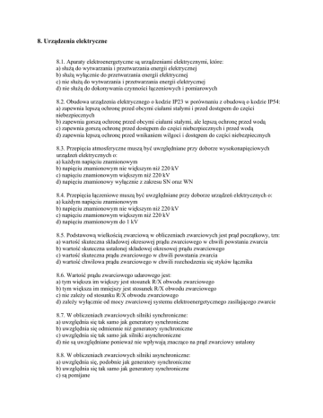 8. Urządzenia elektryczne 8.1. Aparaty elektroenergetyczne są urządzeniami elektrycznymi, które: a) służą do wytwarzania i przetwarzania energii elektrycznej b) służą wyłącznie do przetwarzania energii elektrycznej c) nie służą do wytwarzania i przetwarzania energii elektrycznej d) nie służą do dokonywania czynności łączeniowych i pomiarowych 8.2. Obudowa urządzenia elektrycznego o kodzie IP23 w porównaniu z obudową o kodzie IP54: a) zapewnia lepszą ochronę przed obcymi ciałami stałymi i przed dostępem do części niebezpiecznych b) zapewnia gorszą ochronę przed obcymi ciałami stałymi, ale lepszą ochronę przed wodą c) zapewnia gorszą ochronę przed dostępem do części niebezpiecznych i przed wodą d) zapewnia lepszą ochronę przed wnikaniem wilgoci i dostępem do części niebezpiecznych 8.3. Przepięcia atmosferyczne muszą być uwzględniane przy doborze wysokonapięciowych urządzeń elektrycznych o: a) każdym napięciu znamionowym b) napięciu znamionowym nie większym niż 220 kV c) napięciu znamionowym większym niż 220 kV d) napięciu znamionowy wyłącznie z zakresu SN oraz WN 8.4. Przepięcia łączeniowe muszą być uwzględniane przy doborze urządzeń elektrycznych o: a) każdym napięciu znamionowym b) napięciu znamionowym nie większym niż 220 kV c) napięciu znamionowym większym niż 220 kV d) napięciu znamionowym do 1 kV 8.5. Podstawową wielkością zwarciową w obliczeniach zwarciowych jest prąd początkowy, tzn: a) wartość skuteczna składowej okresowej prądu zwarciowego w chwili powstania zwarcia b) wartość skuteczna ustalonej składowej okresowej prądu zwarciowego c) wartość skuteczna prądu zwarciowego w chwili powstania zwarcia d) wartość chwilowa prądu zwarciowego w chwili rozchodzenia się styków łącznika 8.6. Wartość prądu zwarciowego udarowego jest: a) tym większa im większy jest stosunek R/X obwodu zwarciowego b) tym większa im mniejszy jest stosunek R/X obwodu zwarciowego c) nie zależy od stosunku R/X obwodu zwarciowego d) zależy wyłącznie od mocy zwarciowej systemu elektroenergetycznego zasilającego zwarcie 8.7. W obliczeniach zwarciowych silniki synchroniczne: a) uwzględnia się tak samo jak generatory synchroniczne b) uwzględnia się odmiennie niż generatory synchroniczne c) uwzględnia się tak samo jak silniki asynchroniczne d) nie są uwzględniane ponieważ nie wpływają znacząco na prąd zwarciowy ustalony 8.8. W obliczeniach zwarciowych silniki asynchroniczne: a) uwzględnia się, podobnie jak generatory synchroniczne b) uwzględnia się tak samo jak generatory synchroniczne c) są pomijane d) zwiększają prąd zwarciowy ustalony 8.9. Straty mocy Joule’a w torach prądowych aparatów elektroenergetycznych są: a) wprost proporcjonalne do wartości skutecznej prądu b) proporcjonalne do kwadratu wartości skutecznej prądu c) proporcjonalne do wartości skutecznej prądu w potędze >2 d) są pomijalnie małe przy analizie stanów ustalonych 8.10. Straty dielektryczne w bilansie cieplnym aparatów elektrycznych: a) nie odgrywają zasadniczej roli i są na ogół pomijane b) odgrywają zasadniczą rolę i są zawsze uwzględniane c) mogą odgrywać istotną rolę i są na ogół uwzględniane d) są istotne w urządzeniach o niskim napięciu znamionowym 8.11. Ilość ciepła oddawana z aparatu do otoczenia na drodze promieniowania jest: a) jest stała niezależnie do różnicy temperatur ciała promieniującego i pochłaniającego b) proporcjonalna do różnicy temperatur ciała promieniującego i pochłaniającego c) proporcjonalna do różnicy kwadratów temperatury ciała promieniującego i pochłaniającego d) proporcjonalna do różnicy czwartych potęg temperatury ciała promieniującego i pochłaniającego 8.12. Jeżeli Q jest ciepłem wytworzonym w torze prądowym, Q1 ciepłem oddawanym do otoczenia, a Q2 ciepłem akumulowanym w torze, to bilans cieplny tego toru ma postać: a) Q = Q1 + Q2 b) Q + Q2 = Q1 c) Q = Q1 – Q2 d) Q + Q1 = Q2 8.13. Dla materiałów przewodowych zmniejszenie wytrzymałości mechanicznej ze wzrostem temperatury jest: a) mniejsze przy nagrzewaniu długotrwałym (np. prądem roboczym) niż przy nagrzewaniu krótkotrwałym (np. prądem zwarciowym) b) mniejsze przy nagrzewaniu krótkotrwałym (np. prądem zwarciowym) niż przy nagrzewaniu długotrwałym (np. prądem roboczym) c) nie zależy od czasu nagrzewania d) większe przy obciążeniu dorywczym niż przy obciążeniu ciągłym 8.14. Siły działające na tory prądowe przy oddziaływaniach elektrodynamicznych są: a) nie zależą od odległości między torami prądowymi b) wprost proporcjonalne do wartości prądów płynących w torach c) proporcjonalne do kwadratu wartości prądów płynących w torach d) proporcjonalne do wartości prądów płynących w torach w potędze >2 8.15. Przy doborze aparatów i urządzeń ze względu na oddziaływanie elektrodynamiczne prądów zwarciowych istotna jest znajomość prądu: a) początkowego b) ustalonego c) udarowego d) aperiodycznego 8.16. Określenie zestyk zespołowy oznacza: a) zestyk złożony z zestyku podstawowego i zestyku opalnego b) zestyk wykonany z zestyku podstawowego i odpowiednich nakładek stykowych c) zestyk wykonany z więcej niż jednego materiału stykowego d) zestyk pracujący niezależnie od układu napędowego 8.17. Zestyki niełączeniowe nieruchome należy wykonywać jako zestyki: a) punktowe b) zespołowe c) liniowe d) powierzchniowe 8.18. Nagrzewanie zestyków łączeniowych prądem zwarciowym może prowadzić do ich zespawania. Największą wartość prądu jaką może załączyć wyłącznik bez trwałego sczepienia zestyku określa jego: a) znamionowy prąd cieplny n-sekundowy b) znamionowy prąd wyłączalny c) znamionowy prąd ustalony d) znamionowy prąd załączalny 8.19. W zestykach komór gaszeniowych wyłączników próżniowych zastosowanie znajdują styki wykonane z: a) miedzi b) srebra c) miedzi posrebr