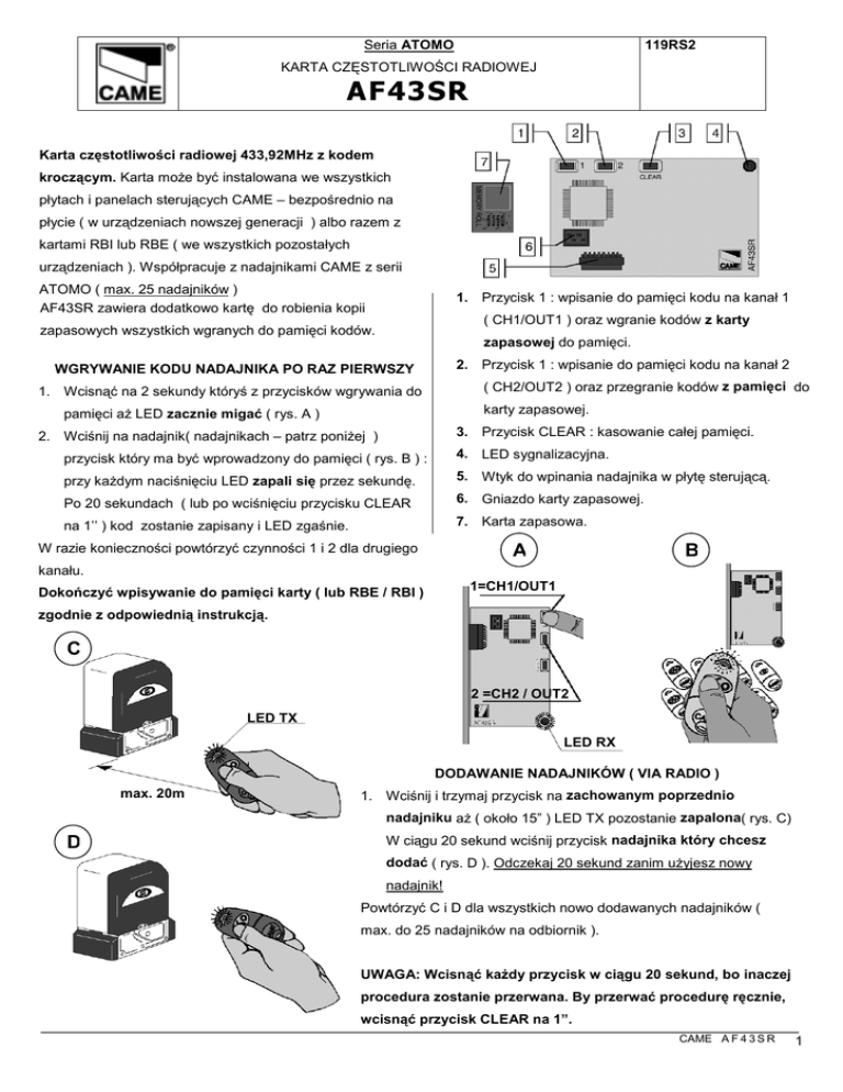 Seria ATOMO 119RS2 KARTA CZĘSTOTLIWOŚCI RADIOWEJ AF43SR Karta częstotliwości radiowej 433,92MHz z kodem kroczącym. Karta może być instalowana we wszystkich płytach i panelach sterujących CAME – bezpośrednio na płycie ( w urządzeniach nowszej generacji ) albo razem z kartami RBI lub RBE ( we wszystkich pozostałych urządzeniach ). Współpracuje z nadajnikami CAME z serii ATOMO ( max. 25 nadajników ) AF43SR zawiera dodatkowo kartę do robienia kopii 1. Przycisk 1 : wpisanie do pamięci kodu na kanał 1 ( CH1/OUT1 ) oraz wgranie kodów z karty zapasowych wszystkich wgranych do pamięci kodów. zapasowej do pamięci. 2. Przycisk 1 : wpisanie do pamięci kodu na kanał 2 WGRYWANIE KODU NADAJNIKA PO RAZ PIERWSZY ( CH2/OUT2 ) oraz przegranie kodów z pamięci do 1. Wcisnąć na 2 sekundy któryś z przycisków wgrywania do karty zapasowej. pamięci aż LED zacznie migać ( rys. A ) 3. Przycisk CLEAR : kasowanie całej pamięci. 2. Wciśnij na nadajnik( nadajnikach – patrz poniżej ) przycisk który ma być wprowadzony do pamięci ( rys. B ) : 4. LED sygnalizacyjna. przy każdym naciśnięciu LED zapali się przez sekundę. 5. Wtyk do wpinania nadajnika w płytę sterującą. Po 20 sekundach ( lub po wciśnięciu przycisku CLEAR 6. Gniazdo karty zapasowej. na 1’’ ) kod zostanie zapisany i LED zgaśnie. 7. Karta zapasowa. A W razie konieczności powtórzyć czynności 1 i 2 dla drugiego B kanału. 1=CH1/OUT1 Dokończyć wpisywanie do pamięci karty ( lub RBE / RBI ) zgodnie z odpowiednią instrukcją. C 2 =CH2 / OUT2 LED TX LED RX DODAWANIE NADAJNIKÓW ( VIA RADIO ) max. 20m 1. Wciśnij i trzymaj przycisk na zachowanym poprzednio nadajniku aż ( około 15” ) LED TX pozostanie zapalona( rys. C) D W ciągu 20 sekund wciśnij przycisk nadajnika który chcesz dodać ( rys. D ). Odczekaj 20 sekund zanim użyjesz nowy nadajnik! Powtórzyć C i D dla wszystkich nowo dodawanych nadajników ( max. do 25 nadajników na odbiornik ). UWAGA: Wcisnąć każdy przycisk w ciągu 20 sekund, bo inaczej procedura zostanie przerwana. By przerwać procedurę ręcznie, wcisnąć przycisk CLEAR na 1”. CAME A F 4 3 S R 1 PRZEGRYWANIE KODÓW Z PAMIĘCI DO KARTY PRZEGRYWANIE KODÓW Z KARTY ZAPASOWEJ ZAPASOWEJ DO PAMIĘCI - Wepnij kartę zapasową. - Wepnij kartę zapasową. - Wciśnij przycisk 2 i puść - Wciśnij przycisk 1 i puść gdy LED zacznie migać gdy LED zacznie migać ( 5’’ ) ( 5’’ ) KASOWANIE CAŁEJ PAMIĘCI - Wciśnij i trzymaj przycisk CLEAR aż zapali się LED ( ~5’’ ) Wszystkie dane skontrolowano z maksymalną starannością. Nie bierzemy jednak jakiejkolwiek odpowiedzialności za ewentualne błędy lub opuszczenia. CAME A F 4 3 S R 2