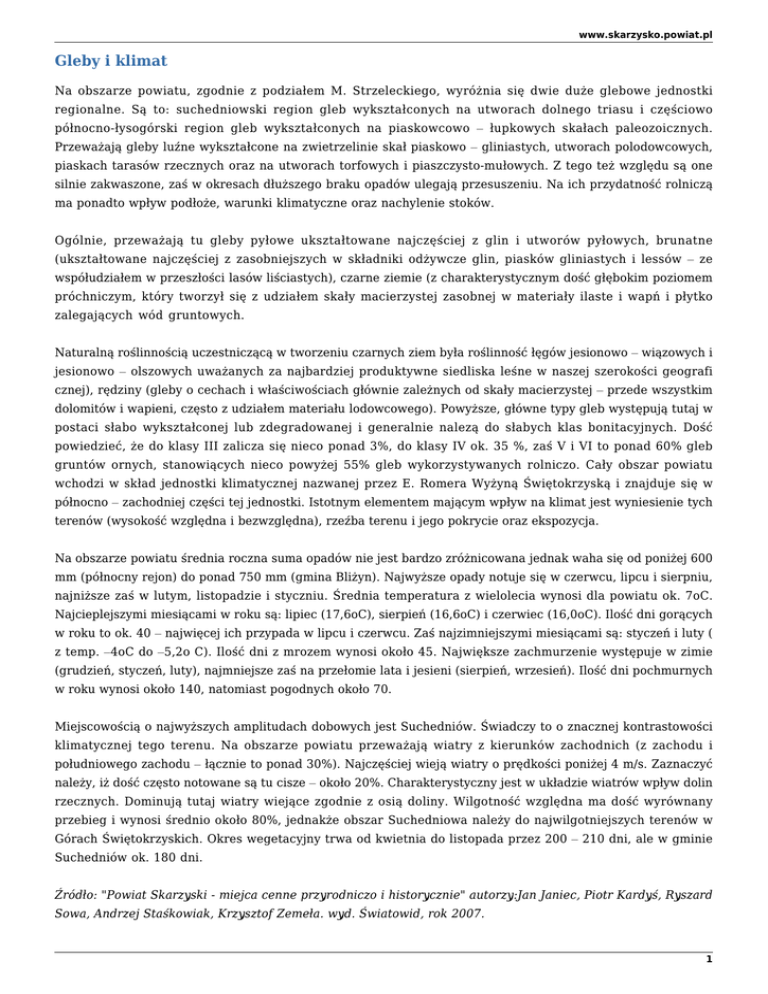 www.skarzysko.powiat.pl Gleby i klimat Na obszarze powiatu, zgodnie z podziałem M. Strzeleckiego, wyróżnia się dwie duże glebowe jednostki regionalne. Są to: suchedniowski region gleb wykształconych na utworach dolnego triasu i częściowo północno-łysogórski region gleb wykształconych na piaskowcowo – łupkowych skałach paleozoicznych. Przeważają gleby luźne wykształcone na zwietrzelinie skał piaskowo – gliniastych, utworach polodowcowych, piaskach tarasów rzecznych oraz na utworach torfowych i piaszczysto-mułowych. Z tego też względu są one silnie zakwaszone, zaś w okresach dłuższego braku opadów ulegają przesuszeniu. Na ich przydatność rolniczą ma ponadto wpływ podłoże, warunki klimatyczne oraz nachylenie stoków. Ogólnie, przeważają tu gleby pyłowe ukształtowane najczęściej z glin i utworów pyłowych, brunatne (ukształtowane najczęściej z zasobniejszych w składniki odżywcze glin, piasków gliniastych i lessów – ze współudziałem w przeszłości lasów liściastych), czarne ziemie (z charakterystycznym dość głębokim poziomem próchniczym, który tworzył się z udziałem skały macierzystej zasobnej w materiały ilaste i wapń i płytko zalegających wód gruntowych. Naturalną roślinnością uczestniczącą w tworzeniu czarnych ziem była roślinność łęgów jesionowo – wiązowych i jesionowo – olszowych uważanych za najbardziej produktywne siedliska leśne w naszej szerokości geografi cznej), rędziny (gleby o cechach i właściwościach głównie zależnych od skały macierzystej – przede wszystkim dolomitów i wapieni, często z udziałem materiału lodowcowego). Powyższe, główne typy gleb występują tutaj w postaci słabo wykształconej lub zdegradowanej i generalnie nalezą do słabych klas bonitacyjnych. Dość powiedzieć, że do klasy III zalicza się nieco ponad 3%, do klasy IV ok. 35 %, zaś V i VI to ponad 60% gleb gruntów ornych, stanowiących nieco powyżej 55% gleb wykorzystywanych rolniczo. Cały obszar powiatu wchodzi w skład jednostki klimatycznej nazwanej przez E. Romera Wyżyną Świętokrzyską i znajduje się w północno – zachodniej części tej jednostki. Istotnym elementem mającym wpływ na klimat jest wyniesienie tych terenów (wysokość względna i bezwzględna), rzeźba terenu i jego pokrycie oraz ekspozycja. Na obszarze powiatu średnia roczna suma opadów nie jest bardzo zróżnicowana jednak waha się od poniżej 600 mm (północny rejon) do ponad 750 mm (gmina Bliżyn). Najwyższe opady notuje się w czerwcu, lipcu i sierpniu, najniższe zaś w lutym, listopadzie i styczniu. Średnia temperatura z wielolecia wynosi dla powiatu ok. 7oC. Najcieplejszymi miesiącami w roku są: lipiec (17,6oC), sierpień (16,6oC) i czerwiec (16,0oC). Ilość dni gorących w roku to ok. 40 – najwięcej ich przypada w lipcu i czerwcu. Zaś najzimniejszymi miesiącami są: styczeń i luty ( z temp. –4oC do –5,2o C). Ilość dni z mrozem wynosi około 45. Największe zachmurzenie występuje w zimie (grudzień, styczeń, luty), najmniejsze zaś na przełomie lata i jesieni (sierpień, wrzesień). Ilość dni pochmurnych w roku wynosi około 140, natomiast pogodnych około 70. Miejscowością o najwyższych amplitudach dobowych jest Suchedniów. Świadczy to o znacznej kontrastowości klimatycznej tego terenu. Na obszarze powiatu przeważają wiatry z kierunków zachodnich (z zachodu i południowego zachodu – łącznie to ponad 30%). Najczęściej wieją wiatry o prędkości poniżej 4 m/s. Zaznaczyć należy, iż dość często notowane są tu cisze – około 20%. Charakterystyczny jest w układzie wiatrów wpływ dolin rzecznych. Dominują tutaj wiatry wiejące zgodnie z osią doliny. Wilgotność względna ma dość wyrównany przebieg i wynosi średnio około 80%, jednakże obszar Suchedniowa należy do najwilgotniejszych terenów w Górach Świętokrzyskich. Okres wegetacyjny trwa od kwietnia do listopada przez 200 – 210 dni, ale w gminie Suchedniów ok. 180 dni. Źródło: "Powiat Skarzyski - miejca cenne przyrodniczo i historycznie" autorzy:Jan Janiec, Piotr Kardyś, Ryszard Sowa, Andrzej Staśkowiak, Krzysztof Zemeła. wyd. Światowid, rok 2007. 1 www.skarzysko.powiat.pl 2
