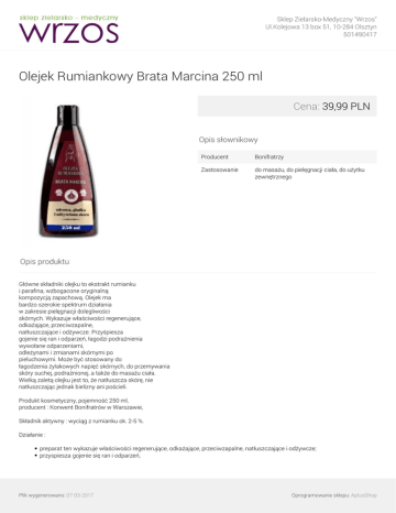 Sklep Zielarsko-Medyczny "Wrzos" Ul.Kolejowa 13 box 51, 10-284 Olsztyn 501490417 Olejek Rumiankowy Brata Marcina 250 ml Cena: 39,99 PLN Opis słownikowy Producent Bonifratrzy Zastosowanie do masażu, do pielęgnacji ciała, do użytku zewnętrznego Opis produktu Główne składniki olejku to ekstrakt rumianku i parafina, wzbogacone oryginalną kompozycją zapachową. Olejek ma bardzo szerokie spektrum działania w zakresie pielęgnacji dolegliwości skórnych. Wykazuje właściwości regenerujące, odkażające, przeciwzapalne, natłuszczające i odżywcze. Przyśpiesza gojenie się ran i odparzeń, łagodzi podrażnienia wywołane odparzeniami, odleżynami i zmianami skórnymi po pieluchowymi. Może być stosowany do łagodzenia żylakowych napięć skórnych, do przemywania skóry suchej, podrażnionej, a także do masażu ciała. Wielką zaletą olejku jest to, że natłuszcza skórę, nie natłuszczając jednak bielizny ani pościeli. Produkt kosmetyczny, pojemność 250 ml, producent : Konwent Bonifratrów w Warszawie, Składnik aktywny : wyciąg z rumianku ok. 2-5 %. Działanie : preparat ten wykazuje właściwości regenerujące, odkażające, przeciwzapalne, natłuszczające i odżywcze; przyspiesza gojenie się ran i odparzeń, Plik wygenerowano: 07-03-2017 Oprogramowanie sklepu: AptusShop Sklep Zielarsko-Medyczny "Wrzos" Ul.Kolejowa 13 box 51, 10-284 Olsztyn 501490417 łagodzi podrażnienia skórne przy zaczerwienieniach wywołanych odparzeniami, odleżynami, pieluszkowym zapaleniem skóry; może być stosowany do przemywania skóry suchej i podrażnionej oraz do masażu ciała. Plik wygenerowano: 07-03-2017 Powered by TCPDF (www.tcpdf.org) Oprogramowanie sklepu: AptusShop