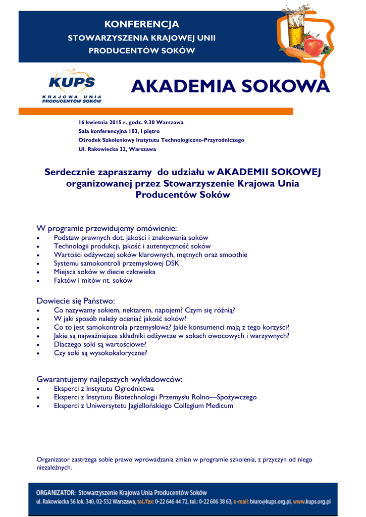 KONFERENCJA STOWARZYSZENIA KRAJOWEJ UNII PRODUCENTÓW SOKÓW AKADEMIA SOKOWA 16 kwietnia 2015 r. godz. 9.30 Warszawa Sala konferencyjna 103, I piętro Ośrodek Szkoleniowy Instytutu Technologiczno-Przyrodniczego Ul. Rakowiecka 32, Warszawa Serdecznie zapraszamy do udziału w AKADEMII SOKOWEJ organizowanej przez Stowarzyszenie Krajowa Unia Producentów Soków W programie przewidujemy omówienie: Podstaw prawnych dot. jakości i znakowania soków Technologii produkcji, jakość i autentyczność soków Wartości odżywczej soków klarownych, mętnych oraz smoothie Systemu samokontroli przemysłowej DSK Miejsca soków w diecie człowieka Faktów i mitów nt. soków Dowiecie się Państwo: Co nazywamy sokiem, nektarem, napojem? Czym się różnią? W jaki sposób należy oceniać jakość soków? Co to jest samokontrola przemysłowa? Jakie konsumenci mają z tego korzyści? Jakie są najważniejsze składniki odżywcze w sokach owocowych i warzywnych? Dlaczego soki są wartościowe? Czy soki są wysokokaloryczne? Gwarantujemy najlepszych wykładowców: Eksperci z Instytutu Ogrodnictwa Eksperci z Instytutu Biotechnologii Przemysłu Rolno—Spożywczego Eksperci z Uniwersytetu Jagiellońskiego Collegium Medicum Organizator zastrzega sobie prawo wprowadzania zmian w programie szkolenia, z przyczyn od niego niezależnych. KONFERENCJA STOWARZYSZENIA KRAJOWEJ UNII PRODUCENTÓW SOKÓW AKADEMIA SOKOWA 16 kwietnia 2015 r. godz. 9.30 Sala konferencyjna 103, I piętro Ośrodek Szkoleniowy Instytutu Technologiczno-Przyrodniczego Ul. Rakowiecka 32 , 02-532 Warszawa PROGRAM 9:00—9.30 Rejestracja uczestników z poranną kawą i sokiem 9.30—10.15 Przywitanie uczestników Podstawowe wymagania prawne dotyczące jakości handlowej i znakowania soków Barbara Groele—Stowarzyszenie Krajowa Unia Producentów Soków 10.15–10.45 Wartość odżywcza soków klarownych, mętnych oraz smoothie owocowych i warzywnych Dr Jarosław Markowski—Instytut Ogrodnictwa 10.45—11.15 Co jest sokiem, nektarem, napojem? Czym się różnią? Czy prawo dopuszcza dodatek cukru do soków owocowych. Dlaczego jest zakaz dodatku cukrów? Czy wiesz, że zgodnie z prawem nie wolno do soków i nektarów dodawać konserwantów i barwników. Dlaczego nie wolno podawać na opakowaniu soków i nektarów informacji „bez dodatku konserwantów i barwników” I wiele innych informacji Porównanie wartości odżywczej soków a napojów Obalimy mit niskiej wartości soków Dlaczego soki są wartościowe? Dlaczego sok może stanowić jedną z 5 porcji warzyw i owoców ? I wiele innych informacji Ocena jakości i autentyczności soków Dr Sylwia Skąpska — Instytut Biotechnologii Przemysłu Rolno—Spożywczego W jaki sposób należy oceniać jakość soków? Jakimi metodami badamy soki? Co to jest panel sensoryczny? W jaki sposób oceniamy smakowitość soków? I wiele innych informacji 11.15 – 11.45 Dyskusja 11.45—12.15 Przerwa na lunch KONFERENCJA STOWARZYSZENIA KRAJOWEJ UNII PRODUCENTÓW SOKÓW AKADEMIA SOKOWA 16 kwietnia 2015 r. godz. 9.30 Sala konferencyjna 103 , I piętro Ośrodek Szkoleniowy Instytutu Technologiczno-Przyrodniczego Ul. Rakowiecka 32 , 02-532 Warszawa PROGRAM 12.15—12.45 Samokontrola soków na przykładzie Dobrowolnego Systemu Kontroli soków i nektarów (DSK) Prof. dr hab. Witold Płocharski — Instytut Ogrodnictwa 12.45–13.15 Soki i ich miejsce w diecie człowieka Dr n. o zdr. Agnieszka Kozioł—Kozakowska — Klinika Pediatrii, Gastroenterologii i Żywienia, Uniwersytet Jagielloński Collegium Medicum 13.15—13.45 Które są najważniejsze składniki odżywcze w sokach owocowych i warzywnych? Ile można wypijać soku dziennie? Szklanka soku porcją warzyw i owoców Ile przeciętny Polak pije soków i nektarów dziennie? Czy to dużo czy mało? I wiele innych informacji Fakty i mity nt. soków Barbara Groele—Stowarzyszenie Krajowa Unia Producentów Soków 13.45 – 14.30 Co to jest samokontrola przemysłowa? Jakie konsumenci mają z tego korzyści? Czy producenci soków dostosowują się do wymagań DSK. Przepisy, procedury i certyfikat DSK Jak skutecznie kontrolować? Sukces DSK I wiele innych informacji Czy soki są wysokokaloryczne? Czy zagęszczony sok jest w pełni naturalny? Dlaczego soki maja różną konsystencję. Soki klarowne, naturalnie mętne, przecierowe. Dlaczego pasteryzujemy soki? I wiele innych informacji Dyskusja i podsumowanie