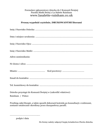 Formularz zgłoszeniowy dziecka do I Komunii Świętej Parafia Matki Bożej z La Salette Rainham www.lasalette-rainham.co.uk Proszę wypełnić czytelnie, DRUKOWANYMI literami Imię i Nazwisko Dziecka: …………………………………………………………….……………………. Data i miejsce urodzenia: ………………………………………………………………….………………. Imię i Nazwisko Ojca: ………………………………………………………………….……………………. Imię i Nazwisko Matki: ………………………………………….…………………………………………. Adres zamieszkania: Nr domu i ulica: ………………………………………………………………………………………………. Miasto: ……………………………………… Kod pocztowy: ……………………………… Email do kontaktu: …………………………………………………………………………………………… Tel. komórkowy do kontaktu: ……………………………………………………………………………. Dziecko przystąpi do Komunii Świętej w (zakreślić właściwe): Rainham / Polsce Przebieg całej liturgii, a także sposób dekoracji kościoła po konsultacji z rodzicami, zostanie ostatecznie określony przez duszpasterzy parafii. ………………………………………..… podpis i data Do formy należy załączyć kopię świadectwa Chrztu dziecka.