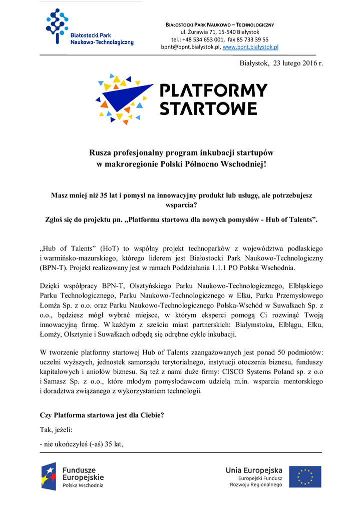 BIAŁOSTOCKI PARK NAUKOWO – TECHNOLOGICZNY ul. Żurawia 71, 15-540 Białystok tel.: +48 534 653 001, fax 85 733 39 55 [email protected], www.bpnt.bialystok.pl Białystok, 23 lutego 2016 r. Rusza profesjonalny program inkubacji startupów w makroregionie Polski Północno Wschodniej! Masz mniej niż 35 lat i pomysł na innowacyjny produkt lub usługę, ale potrzebujesz wsparcia? Zgłoś się do projektu pn. „Platforma startowa dla nowych pomysłów - Hub of Talents”. „Hub of Talents” (HoT) to wspólny projekt technoparków z województwa podlaskiego i warmińsko-mazurskiego, którego liderem jest Białostocki Park Naukowo-Technologiczny (BPN-T). Projekt realizowany jest w ramach Poddziałania 1.1.1 PO Polska Wschodnia. Dzięki współpracy BPN-T, Olsztyńskiego Parku Naukowo-Technologicznego, Elbląskiego Parku Technologicznego, Parku Naukowo-Technologicznego w Ełku, Parku Przemysłowego Łomża Sp. z o.o. oraz Parku Naukowo-Technologicznego Polska-Wschód w Suwałkach Sp. z o.o., będziesz mógł wybrać miejsce, w którym eksperci pomogą Ci rozwinąć Twoją innowacyjną firmę. W każdym z sześciu miast partnerskich: Białymstoku, Elblągu, Ełku, Łomży, Olsztynie i Suwałkach odbędą się odrębne cykle inkubacji. W tworzenie platformy startowej Hub of Talents zaangażowanych jest ponad 50 podmiotów: uczelni wyższych, jednostek samorządu terytorialnego, instytucji otoczenia biznesu, funduszy kapitałowych i aniołów biznesu. Są też z nami duże firmy: CISCO Systems Poland sp. z o.o i Samasz Sp. z o.o., które młodym pomysłodawcom udzielą m.in. wsparcia mentorskiego i doradztwa związanego z wykorzystaniem technologii. Czy Platforma startowa jest dla Ciebie? Tak, jeżeli: - nie ukończyłeś (-aś) 35 lat, BIAŁOSTOCKI PARK NAUKOWO – TECHNOLOGICZNY ul. Żurawia 71, 15-540 Białystok tel.: +48 534 653 001, fax 85 733 39 55 [email protected], www.bpnt.bialystok.pl - masz pomysł na innowacyjny produkt bądź usługę, które nie były przedmiotem prowadzonej wcześniej działalności biznesowej, - marzysz o zbudowaniu własnej firmy, - zarejestrujesz spółkę na terenie województwa podlaskiego lub warmińsko – mazurskiego. Jakie korzyści daje uczestnictwo w Platformie? - udział w innowacyjnym, kompleksowym programie akceleracyjnym, oferującym szkolenia, warsztaty, indywidualny mentoring, coaching biznesowy, pomoc technologiczną, obsługę księgową i prawną, doradztwo podatkowe oraz wsparcie marketingowe, - udostępnione przestrzenie do pracy biurowej, - przynależność do budowanej sieci powiązań młodych przedsiębiorców z władzami samorządowymi, doświadczonymi przedsiębiorcami, uczelniami, instytucjami otoczenia biznesu, - przygotowanie zweryfikowanego rynkowo, rentownego i skalowalnego modelu biznesowego Twojego produktu lub usługi, - mając dopracowany innowacyjny produkt/usługę i przygotowany model biznesowy, będziesz mógł/a ubiegać się o bezzwrotną dotację na wejście na rynek i początkową fazę funkcjonowania startupu w wysokości do 200 tys. euro z Poddziałania 1.1.2 Programu Operacyjnego Polska Wschodnia. Więcej informacji oraz rekrutacja na stronie: startupplatforms.gov.pl Informacji o programie udzielają: w Białymstoku: Milena Kulesza – Kierownik Działu Promocji i Rozwoju BPN-T, tel.: +48 85 733 39 55, e-mail: [email protected] w Olsztynie: Magdalena Ben-Rynkiewicz - Kierownik Inkubatora Przedsiębiorczości OPNT, tel.: +48 89 612 05 05, e-mail: [email protected] w Elblągu: Agnieszka Owsianko - Specjalista ds. kadrowo-administracyjnych EPT, tel.: +48 55 239 34 67, e-mail: [email protected] w Ełku: Ewa Wasilewska - Specjalista ds. rozwoju PNT w Ełku, tel.: +48 728 349 899, email: [email protected] w Łomży: Krzysztof Fabiszewski – Specjalista ds. promocji i szkoleń PPŁ, tel.: +48 86 219 93 22, e-mail: [email protected] w Suwałkach: Mariusz Szmidt, tel.: +48 87 564 22 24, [email protected].