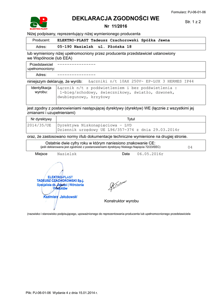 Formularz: PJ-06-01-06 DEKLARACJA ZGODNOŚCI WE Nr 11/2016 Str. 1 z 2 Niżej podpisany, reprezentujący niżej wymienionego producenta Producent: Adres: ELEKTRO-PLAST Tadeusz Czachorowski Spółka Jawna 05-190 Nasielsk ul. Płońska 18 lub wymieniony niżej upełnomocniony przez producenta przedstawiciel ustanowiony we Wspólnocie (lub EEA) Przedstawiciel ---------------upełnomocniony: Adres: ---------------- niniejszym deklaruję, że wyrób: Identyfikacja wyrobu: Łączniki n/t 10AX 250V~ EP-LUX 3 HERMES IP44 Łącznik n/t z podświetleniem i bez podświetlenia : 1-bieg/schodowy, świecznikowy, światło, dzwonek, dwubiegunowy, krzyżowy jest zgodny z postanowieniami następującej dyrektywy (dyrektyw) WE (łącznie z wszystkimi jej zmianami i uzupełnieniami) Nr dyrektywy 2014/35/UE Tytuł Dyrektywa Niskonapięciowa – LVD Dziennik urzędowy UE L96/357-374 z dnia 29.03.2014r oraz, że zastosowano normy i/lub dokumentacje techniczne wymienione na drugiej stronie. Ostatnie dwie cyfry roku w którym naniesiono znakowanie CE: (jeśli deklarowana jest zgodność z postanowieniami dyrektywy Niskiego Napięcia 72/23/EEC) Miejsce Nasielsk Data 04 06.05.2016r Konstruktor wyrobu (nazwisko i stanowisko podpisującego, upoważnionego do reprezentowania producenta lub upełnomocnionego przedstawiciela Plik: PJ-06-01-06 Wydanie 4 z dnia 15.01.2014 r. Formularz: PJ-06-01-06 DEKLARACJA ZGODNOŚCI WE Str. 2 z 2 Nr 11/2016 Normy i/lub dokumentacje techniczne lub ich części zastosowane do wyrobu, którego dotyczy niniejsza deklaracja zgodności: - normy zharmonizowane: Nr Wydanie PN-EN 606692-6 2012 Tytuł Część*) Łączniki do stałych instalacji elektrycznych i podobnych. - inne normy i/lub dokumentacje techniczne: Nr Wydanie Część*) Tytuł Inne dokumenty nie występują - inne rozwiązania techniczne, szczegóły, które zostały włączone do dokumentacji technicznej lub konstrukcyjnej: ŁNT ŁNT ŁNT ŁNT ŁNT ŁNT ŁNT ŁNT ŁNT ŁNT ŁNT ŁNT HERMES HERMES HERMES HERMES HERMES HERMES HERMES HERMES HERMES HERMES HERMES HERMES 1-bieg./schodowy 10AX 250V~ IP44 świecznikowy 10AX 250V~ IP44 2-biegunowy 10AX 250V~ IP44 zwierny światło 10AX 250V~ IP44 zwierny dzwonek 10AX 250V~ IP44 krzyżowy 10AX 250V~ IP44 1-bieg./schod podśw.10AX 250V~IP44 świecznikowy podśw.10AX 250V~ IP44 2-biegunowy podśw.10AX 250V~ IP44 zwierny światło podśw.10AX250V~IP44 zwierny dzwonek podśw.10AX250V~IP44 krzyżowy podśw.10AX 250V~IP44 nr.kat. nr.kat. nr/kat. nr.kat. nr.kat. nr.kat. nr.kat. nr.kat. nr/kat. nr.kat. nr.kat. nr.kat. 0331-XX 0332-XX 0333-XX 0336-XX 0337-XX 0338-XX 0341-XX 0342-XX 0343-XX 0346-XX 0347-XX 0348-XX XX – 3wersje kolorów: 01-dymny, 02-biały, 06-brązowy - inne dokumenty lub informacje wymagane właściwą dyrektywą (dyrektywami) WE: Inne dokumenty nie występują *) Należy wypełnić w przypadku powoływania się na części lub rozdziały normy lub dokumentacji technicznej Plik: PJ-06-01-06 Wydanie 4 z dnia 15.01.2014 r.