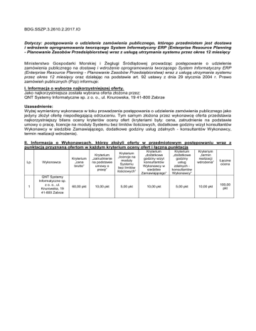 BDG.SSZP.3.2610.2.2017.IO Dotyczy: postępowania o udzielenie zamówienia publicznego, którego przedmiotem jest dostawa i wdrożenie oprogramowania tworzącego System Informatyczny ERP (Enterprise Resource Planning - Planowanie Zasobów Przedsiębiorstwa) wraz z usługą utrzymania systemu przez okres 12 miesięcy Ministerstwo Gospodarki Morskiej i Żeglugi Śródlądowej prowadząc postępowanie o udzielenie zamówienia publicznego na dostawę i wdrożenie oprogramowania tworzącego System Informatyczny ERP (Enterprise Resource Planning - Planowanie Zasobów Przedsiębiorstwa) wraz z usługą utrzymania systemu przez okres 12 miesięcy oraz działając na podstawie art. 92 ustawy z dnia 29 stycznia 2004 r. Prawo zamówień publicznych (Pzp) informuje: I. Informacja o wyborze najkorzystniejszej oferty. Jako najkorzystniejsza została wybrana oferta złożona przez: QNT Systemy Informatyczne sp. z o. o., ul. Knurowska, 19 41-800 Zabrze Uzasadnienie: Wyżej wymieniony wykonawca w toku prowadzenia postępowania o udzielenie zamówienia publicznego jako jedyny złożył ofertę niepodlegającą odrzuceniu. Tym samym złożona przez wykonawcę oferta przedstawia najkorzystniejszy bilans oceny kryteriów oceny ofert (kryteriami były: cena, zatrudnienie na podstawie umowy o pracę, licencje na moduły Systemu bez limitów ilościowych, dodatkowe godziny wizyt konsultantów Wykonawcy w siedzibie Zamawiającego, dodatkowe godziny usług zdalnych - konsultantów Wykonawcy, termin realizacji wdrożenia). II. Informacja o Wykonawcach, którzy złożyli oferty w przedmiotowym postępowaniu wraz z punktacją przyznaną ofertom w każdym kryterium oceny ofert i łączną punktacją Lp. 1 Wykonawca QNT Systemy Informatyczne sp. z o. o., ul. Knurowska, 19 41-800 Zabrze Kryterium „cena brutto” Kryterium „zatrudnienie na podstawie umowy o pracę” Kryterium „licencje na moduły Systemu bez limitów ilościowych” Kryterium „dodatkowe godziny wizyt konsultantów Wykonawcy w siedzibie Zamawiającego” Kryterium „dodatkowe godziny usług zdalnych konsultantów Wykonawcy” Kryterium „termin realizacji wdrożenia” 60,00 pkt 10,00 pkt 5,00 pkt 10,00 pkt 5,00 pkt 10,00 pkt Łączna ocena 100,00 pkt