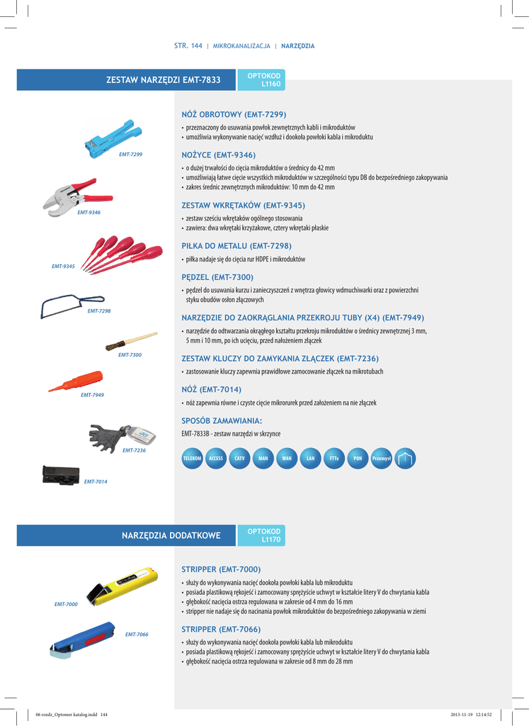 STR. 144 | MIKROKANALIZACJA | NARZĘDZIA OPTOKOD L1160 ZESTAW NARZĘDZI EMT-7833 Nóż obrotowy (EMT-7299) • przeznaczony do usuwania powłok zewnętrznych kabli i mikroduktów • umożliwia wykonywanie nacięć wzdłuż i dookoła powłoki kabla i mikroduktu EMT-7299 Nożyce (EMT-9346) • o dużej trwałości do cięcia mikroduktów o średnicy do 42 mm • umożliwiają łatwe cięcie wszystkich mikroduktów w szczególności typu DB do bezpośredniego zakopywania • zakres średnic zewnętrznych mikroduktów: 10 mm do 42 mm Zestaw wkrętaków (EMT-9345) EMT-9346 • zestaw sześciu wkrętaków ogólnego stosowania • zawiera: dwa wkrętaki krzyżakowe, cztery wkrętaki płaskie Piłka do metalu (EMT-7298) • piłka nadaje się do cięcia rur HDPE i mikroduktów EMT-9345 Pędzel (EMT-7300) • pędzel do usuwania kurzu i zanieczyszczeń z wnętrza głowicy wdmuchiwarki oraz z powierzchni styku obudów osłon złączowych EMT-7298 Narzędzie do zaokrąglania przekroju tuby (x4) (EMT-7949) • narzędzie do odtwarzania okrągłego kształtu przekroju mikroduktów o średnicy zewnętrznej 3 mm, 5 mm i 10 mm, po ich ucięciu, przed nałożeniem złączek EMT-7300 Zestaw kluczy do zamykania złączek (EMT-7236) • zastosowanie kluczy zapewnia prawidłowe zamocowanie złączek na mikrotubach Nóż (EMT-7014) EMT-7949 • nóż zapewnia równe i czyste cięcie mikrorurek przed założeniem na nie złączek SPOSÓB ZAMAWIANIA: EMT-7833B - zestaw narzędzi w skrzynce EMT-7236 TELEKOM ACCESS CATV MAN WAN LAN FTTx PON Przemysł EMT-7014 NARZĘDZIA DODATKOWE OPTOKOD L1170 Stripper (EMT-7000) • służy do wykonywania nacięć dookoła powłoki kabla lub mikroduktu • posiada plastikową rękojeść i zamocowany sprężyście uchwyt w kształcie litery V do chwytania kabla • głębokość nacięcia ostrza regulowana w zakresie od 4 mm do 16 mm • stripper nie nadaje się do nacinania powłok mikroduktów do bezpośredniego zakopywania w ziemi EMT-7000 EMT-7066 06 rozdz_Optomer katalog.indd 144 Stripper (EMT-7066) • służy do wykonywania nacięć dookoła powłoki kabla lub mikroduktu • posiada plastikową rękojeść i zamocowany sprężyście uchwyt w kształcie litery V do chwytania kabla • głębokość nacięcia ostrza regulowana w zakresie od 8 mm do 28 mm 2013-11-19 12:14:52 NARZĘDZIA | MIKROKANALIZACJA | STR. 145 OPTOKOD L1170 NARZĘDZIA DODATKOWE Stripper (EMT-7777) • służy do wykonywania nacięć dookoła powłok kabli lub mikroduktów o średnicach zewnętrznych od 29 mm do 35 mm • posiada plastikową rękojeść i zamocowany sprężyście uchwyt w kształcie litery V do chwytania kabla • głębokość nacięcia ostrza regulowana w zakresie od 29 mm do 35 mm • stripper nie nadaje się do nacinania powłok mikroduktów do bezpośredniego zakopywania w ziemi EMT-7777 Stripper (EMT-7065) • służy do wykonywania nacięć dookoła powłoki kabla lub mikroduktu • do powłok zewnętrznych o średnicach od 35 mm do 50 mm • posiada plastikową rękojeść i zamocowany sprężyście uchwyt w kształcie litery V do chwytania kabla • głębokość nacięcia ostrza regulowana w zakresie od 29 mm do 35 mm • stripper nie nadaje się do nacinania powłok mikroduktów do bezpośredniego zakopywania w ziemi EMT-7065 Nóż obrotowy (EMT-72799A) • nóż obrotowy do nacinania powłoki zewnętrznej wokół mikroduktu w celu uzyskania dostępu do tub pierwotnych Nóż (EMT-72799012) EMT-72799A • do cięcia mikroduktów • średnice mikroduktów: 3 mm do 14 mm Nożyce (EMT-7068) EMT-72799012 • umożliwiają łatwe cięcie wszystkich mikroduktów, szczególnie typu DB do bezpośredniego zakopywania • zakres średnic zewnętrznych mikroduktów: 10 mm do 42 mm • duża trwałość i odporność na uszkodzenia EMT-7068 Stripper (EMT-9342) • narzędzie do usuwania powłoki zewnętrznej z wiązek z dwoma lub czterema włóknami Stripper (EMT-7335) • służy do usuwania powłoki pierwotnej z włókien światłowodowych Stripper (EMT-7562) EMT-9342 • służy do zdejmowania powłok zewnętrznych z wiązek włókien • umożliwia zaciskanie na końcach wiązek włókien grotów do wdmuchiwania • kody produktów EMT-7318a i EMT-7512a EMT-7335 Stripper (EMT-7064) • umożliwia nacinanie wzdłużne mikroduktów • znajduje zastosowanie, gdy kabel nie jest wyposażony w linkę do rozcinania powłoki zewnętrznej • stripper przecina powłoki o grubości 3 mm (wraz ze wzmocnieniem z włókna szklanego) Pończochy (EMT-708A) • stosowane do instalacji metodą wciągania mikroduktów o dowolnej średnicy • upleciony z drutu stalowego rękaw zaciska się ściśle na mikrodukcie po przyłożeniu siły ciągnącej EMT-7562 Groty (EMT-7318A) • nakładane są na końce wiązek włókien przed wdmuchiwaniem • grot ułatwia przejście wiązki włókien przez złączki i łuki o małym promieniu SPOSÓB ZAMAWIANIA: EMT-7068 - nożyce o dużej trwałości do mikroduktów o średnicy do 42 mm TELEKOM ACCESS CATV MAN WAN LAN FTTx PON Przemysł EMT-7064 06 rozdz_Optomer katalog.indd 145 2013-11-19 12:14:53