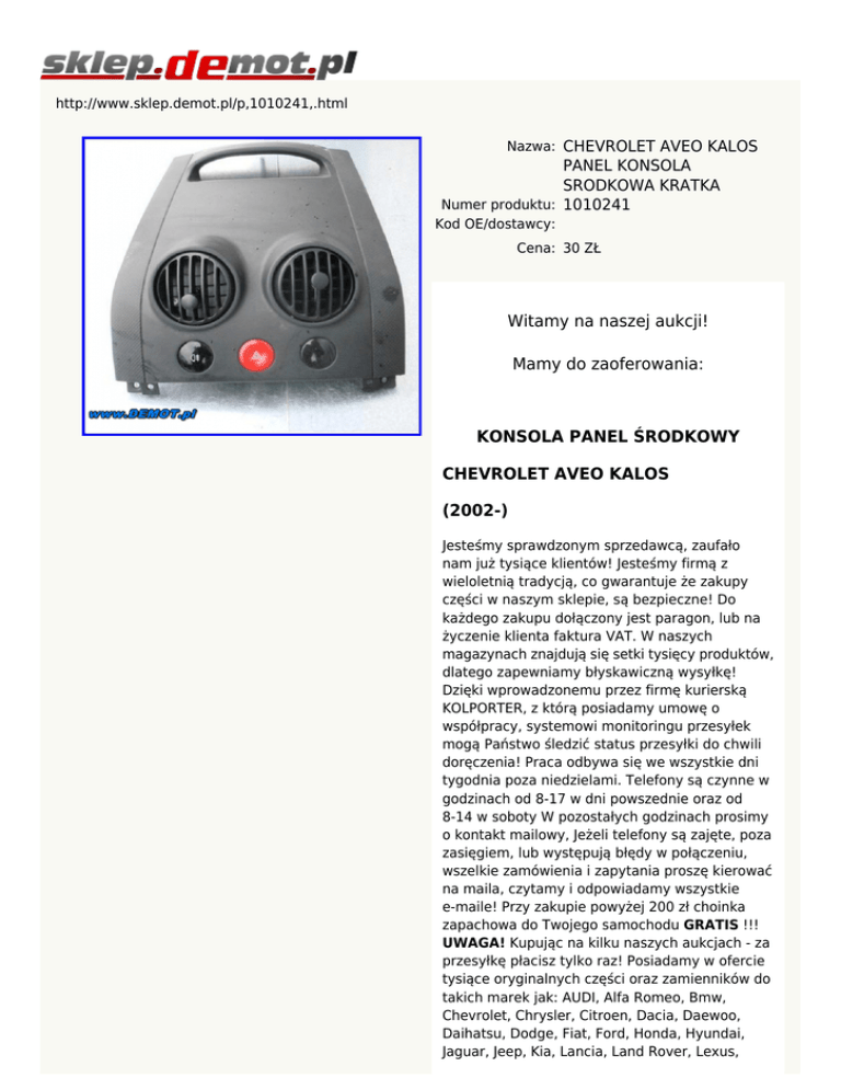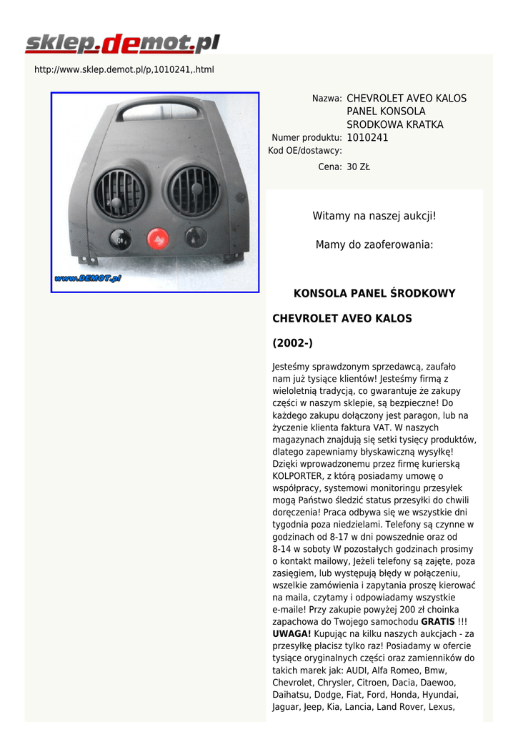 http://www.sklep.demot.pl/p,1010241,.html Nazwa: CHEVROLET AVEO KALOS PANEL KONSOLA SRODKOWA KRATKA Numer produktu: 1010241 Kod OE/dostawcy: Cena: 30 ZŁ Witamy na naszej aukcji! Mamy do zaoferowania: KONSOLA PANEL ŚRODKOWY CHEVROLET AVEO KALOS (2002-) Jesteśmy sprawdzonym sprzedawcą, zaufało nam już tysiące klientów! Jesteśmy firmą z wieloletnią tradycją, co gwarantuje że zakupy części w naszym sklepie, są bezpieczne! Do każdego zakupu dołączony jest paragon, lub na życzenie klienta faktura VAT. W naszych magazynach znajdują się setki tysięcy produktów, dlatego zapewniamy błyskawiczną wysyłkę! Dzięki wprowadzonemu przez firmę kurierską KOLPORTER, z którą posiadamy umowę o współpracy, systemowi monitoringu przesyłek mogą Państwo śledzić status przesyłki do chwili doręczenia! Praca odbywa się we wszystkie dni tygodnia poza niedzielami. Telefony są czynne w godzinach od 8-17 w dni powszednie oraz od 8-14 w soboty W pozostałych godzinach prosimy o kontakt mailowy, Jeżeli telefony są zajęte, poza zasięgiem, lub występują błędy w połączeniu, wszelkie zamówienia i zapytania proszę kierować na maila, czytamy i odpowiadamy wszystkie e-maile! Przy zakupie powyżej 200 zł choinka zapachowa do Twojego samochodu GRATIS !!! UWAGA! Kupując na kilku naszych aukcjach - za przesyłkę płacisz tylko raz! Posiadamy w ofercie tysiące oryginalnych części oraz zamienników do takich marek jak: AUDI, Alfa Romeo, Bmw, Chevrolet, Chrysler, Citroen, Dacia, Daewoo, Daihatsu, Dodge, Fiat, Ford, Honda, Hyundai, Jaguar, Jeep, Kia, Lancia, Land Rover, Lexus, Łada, Mazda, Mercedes, MG, Mini, Mitsubishi, Nissan, Opel, Peugeot, Polonez, Pontiac, Porsche, Renault, Rover, Saab, Seat, Skoda, Smart, Ssang Yong, Subaru, Suzuki, Tata, Toyota, Volkswagen, Volvo, ponadto posiadamy w ofercie części dla miłośników pojazdów zabytkowych i klasycznych. Zapraszamy na inne aukcje sklepu demot! Posiadamy w sprzedaży auto alarmy, zestawy słuchawkowe, radioodtwarzacze, mp3, DVD, TV, CB radio, CD, nawigacja GPS, aktualna mapa oraz filmy i gry o tematyce motoryzacyjnej. Jesteśmy autoryzowanym sprzedawcą produktów Castrol, posiadamy własny serwis zapewniający bezpłatną wymianę zakupionych u nas olejów. Staramy się aby klasa naszych usług była najwyższa! Oferujemy serwis wulkanizacyjny, oraz sprzedaż opon nowych, bieżnikowanych oraz używanych pochodzących ze stacji demontażu pojazdów. Przy zakupie kompletu opon używanych montaż gratis! W naszej firmie istnieje możliwość złomowania pojazdu. Złomowanie i kasacja samochodów oraz motocykli i skuterów jest możliwa dzięki uzyskanym zezwoleniom. Stacja demontażu wystawia zaświadczenia umożliwiające wyrejestrowanie pojazdu. Nasza oferta jest skierowana do wszystkich ceniących sobie wysoki standard oferowanych usług!