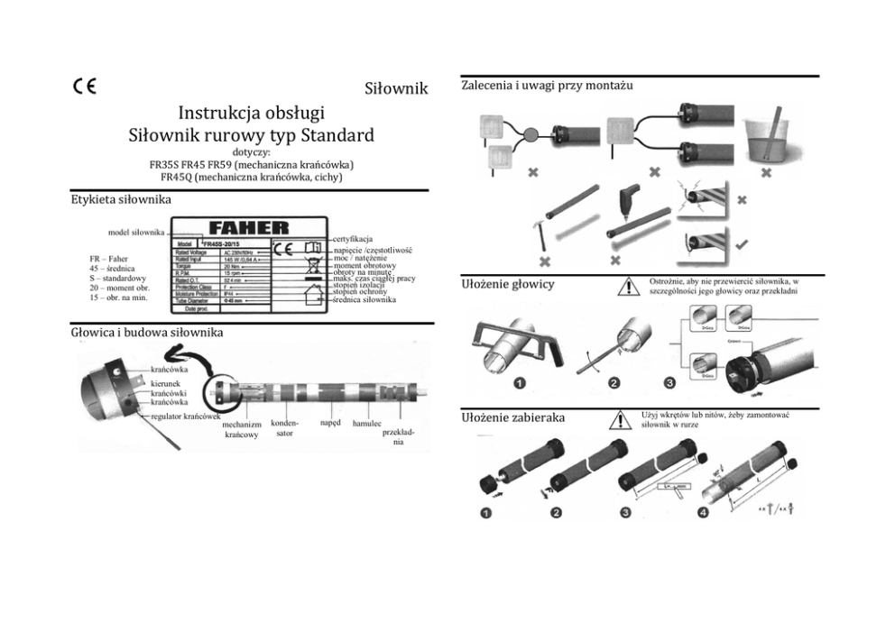 Siłownik Zalecenia i uwagi przy montażu Instrukcja obsługi Siłownik rurowy typ Standard dotyczy: FR35S FR45 FR59 (mechaniczna krańcówka) FR45Q (mechaniczna krańcówka, cichy) Etykieta siłownika model siłownika certyfikacja napięcie /częstotliwość moc / natężenie moment obrotowy obroty na minutę maks. czas ciągłej pracy stopień izolacji stopień ochrony średnica siłownika FR – Faher 45 – średnica S – standardowy 20 – moment obr. 15 – obr. na min. Ułożenie głowicy Ostrożnie, aby nie przewiercić siłownika, w szczególności jego głowicy oraz przekładni Głowica i budowa siłownika krańcówka kierunek krańcówki krańcówka regulator krańcówek mechanizm krańcowy kondensator napęd Ułożenie zabieraka hamulec przekładnia Użyj wkrętów lub nitów, żeby zamontować siłownik w rurze Zamocowania siłownika A Jeżeli pomimo regulowania danej krańcówki Ustawianie pozycji krańcosiłownik w dalszym ciągu nie pracuje, należy wych natychmiast przerwać regulację krańcówki w tym kierunku 1. 2. Włącz zasilanie siłownika Wciśnij przycisk góra na przełączniku lub pilocie. Po zatrzymaniu siłownika kręć regulatorem białą krańcówką do momentu uzyskania żądanej wysokości Zamocowania siłownika B 3. 4. 5. Wciśnij przycisk dół na przełączniku lub pilocie. Po zatrzymaniu siłownika kręć regulatorem czerwoną krańcówką do momentu uzyskania żądanej wysokości Wciśnij przycisk stop na przełączniku lub pilocie Koniec Częste problemy i ich rozwiązania Podłączenie siłownika 230V/50Hz: czarny – kierunek 1 brązowy – kierunek 2 niebieski – neutralny żółto-zielony – uziemienie 120V/60Hz: czerwony – kierunek 1 czarny – kierunek 2 biały – neutralny zielony – uziemienie AC L – napięcie (faza) N – neutralny (masa) Problem Po wciśnięciu przycisku góra, roleta opuszcza się Siłownik pracuje w jednym kierunku Źródło problemu Niepoprawne podłączenie przewodów kierunków siłownika Siłownik osiągnął swoje położenie krańcowe Siłownik pracuje wolno lub w ogóle nie pracuje 1. zbyt słabe zasilanie 2. niepoprawne podłączenie przewodów 3. przeciążenie siłownika 4. niewłaściwy montaż siłownika Przekroczenie maks. czasu ciągłej pracy Siłownik nagle przestał pracować Rozwiązanie Zamień miejscami przewód czarny i brązowy Wykonaj jeden obrót adapterem w kierunku, w którym siłownik kręci zabierakiem 1. zapewnij odpowiednie zasilanie 2. popraw podłączenie 3. sprawdź, czy moment obrotowy siłownika jest wystarczający w stosunku do obciążenia 4. ponownie zamontuj siłownik Odczekaj kilkanaście minut na ochłodzenie siłownika