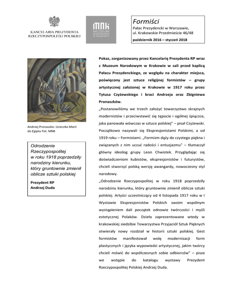 Formiści Pałac Prezydencki w Warszawie, ul. Krakowskie Przedmieście 46/48 październik 2016 – styczeń 2018 Pokaz, zorganizowany przez Kancelarię Prezydenta RP wraz z Muzeum Narodowym w Krakowie w sali przed kaplicą Pałacu Prezydenckiego, ze względu na charakter miejsca, poświęcony jest sztuce religijnej formistów – grupy artystycznej założonej w Krakowie w 1917 roku przez Tytusa Czyżewskiego i braci Andrzeja oraz Zbigniewa Pronaszków. „Postanowiliśmy we trzech założyć towarzystwo skrajnych modernistów i przeciwstawić się tępocie i ogólnej śpiączce, Andrzej Pronaszko: Ucieczka Marii do Egiptu Fot. MNK jaka panowała wówczas w sztuce polskiej” – pisał Czyżewski. Początkowo nazywali się Ekspresjonistami Polskimi, a od 1919 roku – Formistami. „Formizm dąży do czystego piękna i Odrodzenie Rzeczypospolitej w roku 1918 poprzedziły narodziny kierunku, który gruntownie zmienił oblicze sztuki polskiej związanych z nim uczuć radości i entuzjazmu” – tłumaczył Prezydent RP Andrzej Duda „Odrodzenie Rzeczypospolitej w roku 1918 poprzedziły główny ideolog grupy Leon Chwistek. Przyglądając się doświadczeniom kubistów, ekspresjonistów i futurystów, chcieli stworzyć polską wersję awangardy, nowoczesny styl narodowy. narodziny kierunku, który gruntownie zmienił oblicze sztuki polskiej. Artyści uczestniczący od 4 listopada 1917 roku w I Wystawie Ekspresjonistów Polskich swoim wspólnym wystąpieniem dali początek odnowie twórczości i myśli estetycznej Polaków. Dzieła zaprezentowane wtedy w krakowskiej siedzibie Towarzystwa Przyjaciół Sztuk Pięknych otwierały nowy rozdział w historii sztuki polskiej. Gest formistów manifestował wolę modernizacji form plastycznych i języka wypowiedzi artystycznej, jakim twórcy chcieli mówić do współczesnych sobie odbiorców” – pisze we wstępie do katalogu wystawy Prezydent Rzeczypospolitej Polskiej Andrzej Duda. 1 Formiści Pałac Prezydencki w Warszawie, ul. Krakowskie Przedmieście 46/48 październik 2016 – styczeń 2018 - Formiści od początku swojej działalności koncentrowali się na sztuce religijnej, widząc w niej zarówno inspirację do poszukiwania treści duchowych, nowej ekspresji opartej na intensyfikacji uczuć i zwrócenie się w stronę emocjonalnego przeżywania twórczości artystycznej. Celem wystawy jest pokazanie tego mniej znanego aspektu działalności formistów i podkreślenie, że artyści potrafili łączyć elementy narodowej tradycji (religijność katolicka) z awangardową formą – pisze kurator wystawy dr hab. Andrzej Szczerski, Zastępca Dyrektora MNK ds. Naukowych. Na wystawie znajdą się najważniejsze prace formistów – Tytusa Czyżewskiego, Jana Hrynkowskiego, Andrzeja i Zbigniewa Pronaszków, Władysława Skoczylasa i Konrada Winklera – o tematyce religijnej z trzech muzeów: MNK, MNW i Muzeum Sztuki w Łodzi. Niektóre – jak Pieta Zbigniewa Pronaszki – są najbardziej znanymi i najlepszymi dziełami polskiej sztuki awangardowej. Awangarda ze zbiorów MNK będzie też pokazana w 2017 roku na wystawie „#dziedzictwo” w Gmachu Głównym Muzeum. Prezentowane tam będą m.in. mało znane prace Władysława Strzemińskiego, rysunki Tadeusza Kantora, fotomontaże J.M. Brzeskiego i Kazimierza Podsadeckiego. Oprac. KB 2 Formiści Pałac Prezydencki w Warszawie, ul. Krakowskie Przedmieście 46/48 październik 2016 – styczeń 2018 Informacje dla zwiedzających: Wystawa Formiści Ekspozycja otwierająca Rok awangardy 2017 Pałac Prezydencki w Warszawie, ul. Krakowskie Przedmieście 46/48 Sala przed kaplicą, zwana „Salą formistów" Kurator: Andrzej Szczerski Koordynator: Katarzyna Pawłowska Aranżacja: Luiza Berdak MNK Media: KATARZYNA BIK (695 981 817) [email protected] MARTA BOSAK (606 207 728) [email protected] Pliki do pobrania: SERWER ftp.mnk.pl UŻYTKOWNIK: media HASŁO: fCZRRtme6w Organizatorzy: Kancelaria Prezydenta Rzeczypospolitej Polskiej Muzeum Narodowe w Krakowie 3