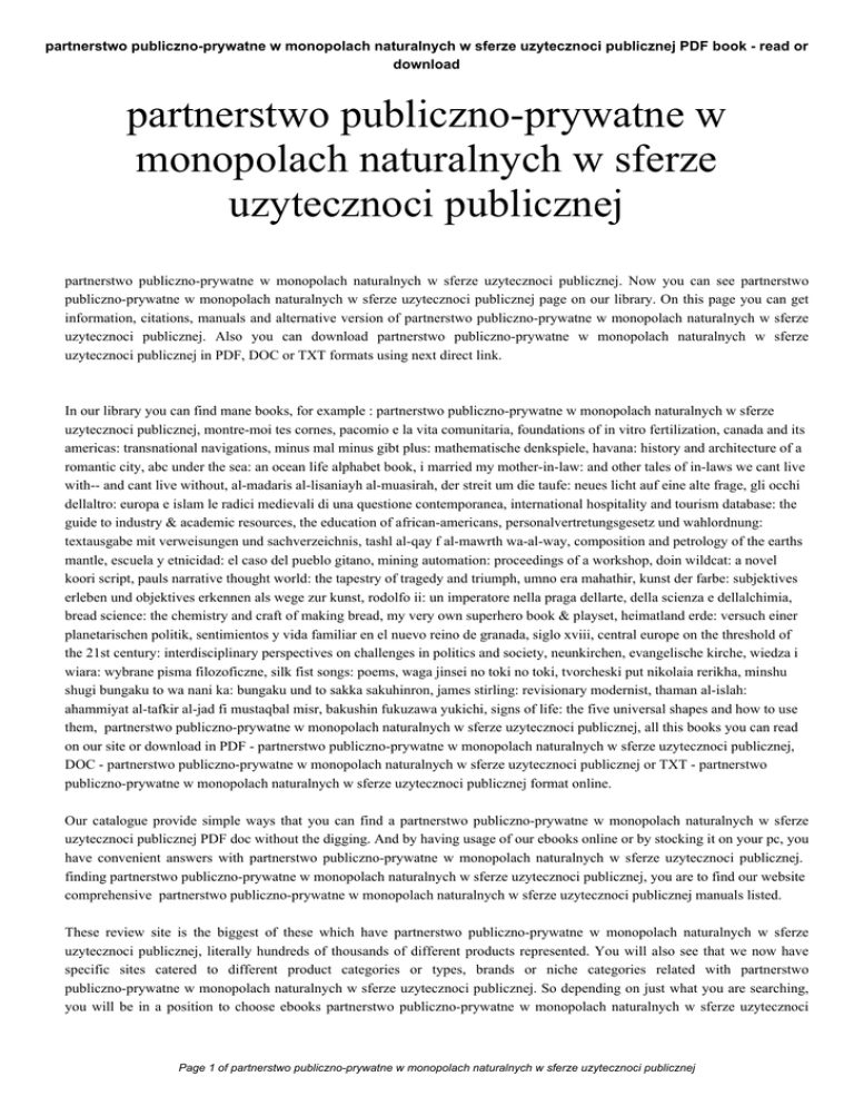 partnerstwo publiczno-prywatne w monopolach naturalnych w sferze uzytecznoci publicznej PDF book - read or download partnerstwo publiczno-prywatne w monopolach naturalnych w sferze uzytecznoci publicznej partnerstwo publiczno-prywatne w monopolach naturalnych w sferze uzytecznoci publicznej. Now you can see partnerstwo publiczno-prywatne w monopolach naturalnych w sferze uzytecznoci publicznej page on our library. On this page you can get information, citations, manuals and alternative version of partnerstwo publiczno-prywatne w monopolach naturalnych w sferze uzytecznoci publicznej. Also you can download partnerstwo publiczno-prywatne w monopolach naturalnych w sferze uzytecznoci publicznej in PDF, DOC or TXT formats using next direct link. In our library you can find mane books, for example : partnerstwo publiczno-prywatne w monopolach naturalnych w sferze uzytecznoci publicznej, montre-moi tes cornes, pacomio e la vita comunitaria, foundations of in vitro fertilization, canada and its americas: transnational navigations, minus mal minus gibt plus: mathematische denkspiele, havana: history and architecture of a romantic city, abc under the sea: an ocean life alphabet book, i married my mother-in-law: and other tales of in-laws we cant live with-- and cant live without, al-madaris al-lisaniayh al-muasirah, der streit um die taufe: neues licht auf eine alte frage, gli occhi dellaltro: europa e islam le radici medievali di una questione contemporanea, international hospitality and tourism database: the guide to industry & academic resources, the education of african-americans, personalvertretungsgesetz und wahlordnung: textausgabe mit verweisungen und sachverzeichnis, tashl al-qay f al-mawrth wa-al-way, composition and petrology of the earths mantle, escuela y etnicidad: el caso del pueblo gitano, mining automation: proceedings of a workshop, doin wildcat: a novel koori script, pauls narrative thought world: the tapestry of tragedy and triumph, umno era mahathir, kunst der farbe: subjektives erleben und objektives erkennen als wege zur kunst, rodolfo ii: un imperatore nella praga dellarte, della scienza e dellalchimia, bread science: the chemistry and craft of making bread, my very own superhero book & playset, heimatland erde: versuch einer planetarischen politik, sentimientos y vida familiar en el nuevo reino de granada, siglo xviii, central europe on the threshold of the 21st century: interdisciplinary perspectives on challenges in politics and society, neunkirchen, evangelische kirche, wiedza i wiara: wybrane pisma filozoficzne, silk fist songs: poems, waga jinsei no toki no toki, tvorcheski put nikolaia rerikha, minshu shugi bungaku to wa nani ka: bungaku und to sakka sakuhinron, james stirling: revisionary modernist, thaman al-islah: ahammiyat al-tafkir al-jad fi mustaqbal misr, bakushin fukuzawa yukichi, signs of life: the five universal shapes and how to use them, partnerstwo publiczno-prywatne w monopolach naturalnych w sferze uzytecznoci publicznej, all this books you can read on our site or download in PDF - partnerstwo publiczno-prywatne w monopolach naturalnych w sferze uzytecznoci publicznej, DOC - partnerstwo publiczno-prywatne w monopolach naturalnych w sferze uzytecznoci publicznej or TXT - partnerstwo publiczno-prywatne w monopolach naturalnych w sferze uzytecznoci publicznej format online. Our catalogue provide simple ways that you can find a partnerstwo publiczno-prywatne w monopolach naturalnych w sferze uzytecznoci publicznej PDF doc without the digging. And by having usage of our ebooks online or by stocking it on your pc, you have convenient answers with partnerstwo publiczno-prywatne w monopolach naturalnych w sferze uzytecznoci publicznej. finding partnerstwo publiczno-prywatne w monopolach naturalnych w sferze uzytecznoci publicznej, you are to find our website comprehensive partnerstwo publiczno-prywatne w monopolach naturalnych w sferze uzytecznoci publicznej manuals listed. These review site is the biggest of these which have partnerstwo publiczno-prywatne w monopolach naturalnych w sferze uzytecznoci publicznej, literally hundreds of thousands of different products represented. You will also see that we now have specific sites catered to different product categories or types, brands or niche categories related with partnerstwo publiczno-prywatne w monopolach naturalnych w sferze uzytecznoci publicznej. So depending on just what you are searching, you will be in a position to choose ebooks partnerstwo publiczno-prywatne w monopolach naturalnych w sferze uzytecznoci Page 1 of partnerstwo publiczno-prywatne w monopolach naturalnych w sferze uzytecznoci publicznej partnerstwo publiczno-prywatne w monopolach naturalnych w sferze uzytecznoci publicznej PDF book read or download publicznej to suit your own needs, partnerstwo publiczno-prywatne w monopolach naturalnych w sferze uzytecznoci publicznej. Page 2 of partnerstwo publiczno-prywatne w monopolach naturalnych w sferze uzytecznoci publicznej