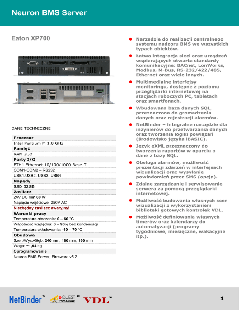 Neuron BMS Server Eaton XP700 Narzędzie do realizacji centralnego systemu nadzoru BMS we wszystkich typach obiektów. Łatwa integracja sieci oraz urządzeń wspierających otwarte standardy komunikacyjne: BACnet, LonWorks, Modbus, M-Bus, RS-232/422/485, Ethernet oraz wiele innych. Multimedialne interfejsy monitoringu, dostępne z poziomu przeglądarki internetowej na stacjach roboczych PC, tabletach oraz smartfonach. Wbudowana baza danych SQL, przeznaczona do gromadzenia danych oraz rejestracji alarmów. DANE TECHNICZNE Procesor Intel Pentium M 1.8 GHz Pamięć RAM 2GB Porty I/O ETH1 Ethernet 10/100/1000 Base-T COM1-COM2 – RS232 USB1,USB2, USB3, USB4 Napędy SSD 32GB Zasilacz 24V DC min 80 W Napięcie wejściowe: 250V AC Niezbędny zasilacz awaryjny! Warunki pracy Temperatura otoczenia: 0 – 60 °C Wilgotność względna: 0 – 90% bez kondensacji Temperatura składowania: -10 – 70 °C Obudowa Szer./Wys./Głęb: 240 mm, 180 mm, 100 mm Waga: ~1,94 kg Oprogramowanie Neuron BMS Server, Firmware v5.2 NetBinder – integralne narzędzie dla inżynierów do przetwarzania danych oraz tworzenia logiki powiązań (środowisko języka iBASIC). Język eXML przeznaczony do tworzenia raportów w oparciu o dane z bazy SQL. Obsługa alarmów, możliwość prezentacji zdarzeń w interfejsach wizualizacji oraz wysyłanie powiadomień przez SMS (opcja). Zdalne zarządzanie i serwisowanie serwera za pomocą przeglądarki internetowej. Możliwość budowania własnych scen wizualizacji z wykorzystaniem biblioteki gotowych kontrolek VDL. Możliwość definiowania własnych timerów oraz kalendarzy do automatyzacji (programy tygodniowe, miesięczne, wakacyjne itp.). 1 Neuron BMS Server Charakterystyka ogólna Bezpieczeństwo w sieci Internet Neuron BMS Server to kolektor danych przeznaczony do monitoringu sieci oraz urządzeń, automatyki wspierających otwarte standardy komunikacyjne we wszystkich typach budynków. Pod kontrolą serwera mogą znaleźć się podsystemy techniczne związane z oświetleniem, HVAC, liczniki zużycia mediów, zasilania, siłownie solarne i fotowoltaiczne, technologia wody oraz wiele innych. Serwer Neuron umożliwia prowadzenie nadzoru obiektu przez Internet, zapewniając pełne bezpieczeństwo obsługi. Oprogramowanie zainstalowane na serwerze ochrania wbudowany firewall oraz szereg mechanizmów kryptograficznych, używanych do zabezpieczania transmisji danych w połączeniach internetowych. System wykrywa wszelkie próby zgadywania haseł oraz pomyłki popełniane podczas logowań. Administrator może nadawać użytkownikom indywidualne lub grupowe uprawnienia do części administracyjnej oraz do obiektów na scenach monitoringu. Serwer umożliwia wielostanowiskowy monitoring obiektu przy pomocy stacji roboczych PC, paneli dotykowych, przenośnych tabletów oraz smartfonów. Personel techniczny budynku otrzymuje zintegrowany, multimedialny interfejs wizualizacji, pozwalający nadzorować aktualne stany urządzeń na scenach monitoringu oraz reagować na pojawiające się zdarzenia alarmowe. Rysunek 1. Przykładowy schemat integracji w serwerowni z wykorzystaniem Neuron BMS Server. Obsługa alarmów Serwer posiada łatwy w obsłudze, konfigurowalny interfejs do monitoringu alarmów. Każdy cyfrowy lub analogowy parametr może być zdefiniowany jako alarm a następnie rejestrowany w tabeli logowania w bazie danych SQL i wyświetlany na ekranie. Zdarzenia alarmowe mogą być filtrowane wg określonego priorytetu i wyświetlane wraz z towarzyszącymi sygnałami dźwiękowymi. Rysunek 3. Pełnoekranowa obsługa alarmów. W większych budynkach, wydzielone podsystemy HVAC można przekazać pod kontrolę lokalnym, wyspecjalizowanym serwerom Neuron Box. Analogicznie można wydzielić monitoring systemów bezpieczeństwa, realizowany wówczas przez serwer Astro SMS. 2 Neuron BMS Server W razie wystąpienia alarmu system wskazuje lokalizację obiektu na scenie monitoringu oraz wspiera operatora w podjęciu działań w celu usunięcia problemu, udostępniając niezbędną dokumentację techniczną oraz raporty. Rejestracja danych Informacje pochodzące z urządzeń mogą być dowolnie przetwarzane oraz rejestrowane w lokalnej bazie danych SQL serwera. Operatorzy mogą definiować własne tabele logowania w celu gromadzenia różnego rodzaju danych, np. pomiarowych z czujników temperatury, stany liczników, ciepłomierzy, zdarzenia alarmowe itp. Tak przygotowane informacje mogą być źródłem danych dla definiowanych przez operatorów raportów. Narzędzia dla integratorów Serwer posiada wbudowane oprogramowanie NetBinder przeznaczone dla integratorów, umożliwiające diagnostykę serwera, monitoring stanu drajwerów oraz kontrolę parametrów sieciowych. Oprócz wielu funkcji diagnostycznych narzędzie oferuje możliwość zdalnej pracy grupowej dla integratorów. Rysunek 5. Narzędzie NetBinder. Raporty W części administracyjnej serwera dostępne jest środowisko języka eXML, służące do definiowania raportów. W zależności od potrzeb użytkownika, raporty można definiować w postaci prostych zestawień tabelarycznych lub wykresów. Dostęp do danych w bazie odbywa się przy pomocy zapytań języka SQL. Rysunek 4. Przykładowy raport graficzny w języku eXML. NetBinder to także środowisko programistyczne i uruchomieniowe dla kodu źródłowego języka iBASIC, przeznaczone do przetwarzania danych oraz programowania logiki komunikacji sieciowej. Interfejsy monitoringu Interfejs monitoringu został zaprojektowany tak, aby umożliwić pełny nadzór nad wieloma różnymi systemami występującymi na jednym lub wielu obiektach. Odpowiednio przygotowane sceny monitoringu można umieścić w odpowiednich kategoriach branżowych, oddzielnie dla różnych obiektów. Na scenach mogą być prezentowane wielkości fizyczne, odtwarzane strumienie wideo a w przypadku wystąpienia określonego zdarzenia - komunikaty głosowe lub dźwiękowe z serwera plików MP3. 3 Neuron BMS Serve