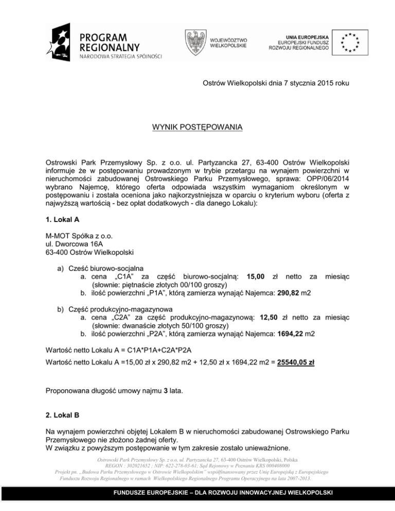 Ostrów Wielkopolski dnia 7 stycznia 2015 roku WYNIK POSTĘPOWANIA Ostrowski Park Przemysłowy Sp. z o.o. ul. Partyzancka 27, 63-400 Ostrów Wielkopolski informuje że w postępowaniu prowadzonym w trybie przetargu na wynajem powierzchni w nieruchomości zabudowanej Ostrowskiego Parku Przemysłowego, sprawa: OPP/06/2014 wybrano Najemcę, którego oferta odpowiada wszystkim wymaganiom określonym w postępowaniu i została oceniona jako najkorzystniejsza w oparciu o kryterium wyboru (oferta z najwyższą wartością - bez opłat dodatkowych - dla danego Lokalu): 1. Lokal A M-MOT Spółka z o.o. ul. Dworcowa 16A 63-400 Ostrów Wielkopolski a) Cześć biurowo-socjalna a. cena „C1A” za część biurowo-socjalną: 15,00 zł netto za (słownie: piętnaście złotych 00/100 groszy) b. ilość powierzchni „P1A”, którą zamierza wynająć Najemca: 290,82 m2 miesiąc b) Część produkcyjno-magazynowa a. cena „C2A” za część produkcyjno-magazynową: 12,50 zł netto za miesiąc (słownie: dwanaście złotych 50/100 groszy) b. ilość powierzchni „P2A”, którą zamierza wynająć Najemca: 1694,22 m2 Wartość netto Lokalu A = C1A*P1A+C2A*P2A Wartość netto Lokalu A =15,00 zł x 290,82 m2 + 12,50 zł x 1694,22 m2 = 25540,05 zł Proponowana długość umowy najmu 3 lata. 2. Lokal B Na wynajem powierzchni objętej Lokalem B w nieruchomości zabudowanej Ostrowskiego Parku Przemysłowego nie złożono żadnej oferty. W związku z powyższym postępowanie w tym zakresie zostało unieważnione. Ostrowski Park Przemysłowy Sp. z o.o, ul. Partyzancka 27, 63-400 Ostrów Wielkopolski, Polska REGON : 302021652 ; NIP: 622-278-03-61; Sąd Rejonowy w Poznaniu KRS 000408000 Projekt pn. „Budowa Parku Przemysłowego w Ostrowie Wielkopolskim” współfinansowany przez Unię Europejską z Europejskiego Funduszu Rozwoju Regionalnego w ramach Wielkopolskiego Regionalnego Programu Operacyjnego na lata 2007-2013.DLA ROZWOJU INNOWACYJNEJ WIELKOPOLSKI FUNDUSZE EUROPEJSKIE – DLA ROZWOJU INNOWACYJNEJ WIELKOPOLSKI W postępowaniu złożono 1 ofertę: Numer oferty Nazwa Firmy 1 M-MOT Spółka z o.o. ul. Dworcowa 16A 63-400 Ostrów Wielkopolski Lokal A Cena netto i inne istotne informacje dotyczące złożonej oferty Cześć biurowo-socjalna - cena za część biurowo-socjalną: 15,00 zł netto za miesiąc - ilość powierzchni którą zamierza wynająć Najemca: 290,82 m2 Lokal B Cena netto i inne istotne informacje dotyczące złożonej oferty Nie złożono żadnej oferty Część produkcyjno-magazynowa - cena za część produkcyjnomagazynową: 12,50 zł netto za miesiąc - ilość powierzchni którą zamierza wynająć Najemca: 1694,22 m2 Proponowana długość umowy najmu: 3 lata. Ostrowski Park Przemysłowy Sp. z o.o, ul. Partyzancka 27, 63-400 Ostrów Wielkopolski, Polska REGON : 302021652 ; NIP: 622-278-03-61; Sąd Rejonowy w Poznaniu KRS 000408000 Projekt pn. „Budowa Parku Przemysłowego w Ostrowie Wielkopolskim” współfinansowany przez Unię Europejską z Europejskiego Funduszu Rozwoju Regionalnego w ramach Wielkopolskiego Regionalnego Programu Operacyjnego na lata 2007-2013.DLA ROZWOJU INNOWACYJNEJ WIELKOPOLSKI FUNDUSZE EUROPEJSKIE – DLA ROZWOJU INNOWACYJNEJ WIELKOPOLSKI 2