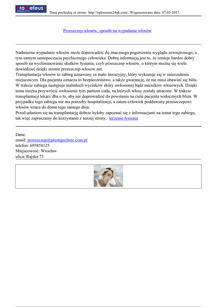 Dane pochodzą ze strony: http://ogloszenia24uk.com/. Wygenerowano dnia: 07-03-2017. Przeszczep włosów, sposób na wypadanie włosów Nadmierne wypadanie włosów może doprowadzić do znacznego pogorszenia wyglądu zewnętrznego, a tym samym samopoczucia psychicznego człowieka. Dobrą informacją jest to, że istnieje bardzo dobry sposób na wyeliminowanie skutków łysienia, czyli przeszczep włosów, o którym można się wiele dowiedzieć dzięki stronie przeszczep-wlosow.net. Transplantacja włosów to zabieg uznawany za mało inwazyjny, który wykonuje się w znieczuleniu miejscowym. Dla pacjenta oznacza to bezpieczeństwo, a także gwarancję, że nie musi obawiać się bólu. W trakcie zabiegu następuje malutkich wycinków skóry owłosionej bądź mieszków włosowych. Dzięki temu można przywrócić owłosienie tym partiom ciała, na których włosy zostały utracone. W trakcie transplantacji lekarz dba o to, aby nie doprowadzić do powstania na ciele pacjenta widocznych blizn. W przypadku tego zabiegu nie ma potrzeby hospitalizacji, a zatem człowiek poddawany przeszczepowi włosów wraca do domu tego samego dnia. Przed udaniem się na transplantację dobrze byłoby zapoznać się z informacjami na temat tego zabiegu, tak więc zapraszamy do korzystania z naszej strony. leczenie łysienia Dane: email: [email protected] telefon: 695858125 Miejscowość: Wrocław ulica: Rajska 73
