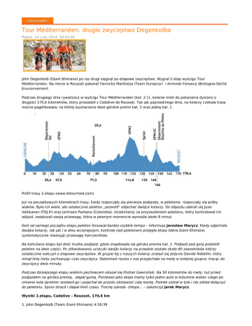 Tour Méditerranéen: drugie zwycięstwo Degenkolba Piątek, 14 Luty 2014, 20:43:59 John Degenkolb (Giant-Shimano) po raz drugi sięgnął po etapowe zwycięstwo. Wygrał 2.etap wyścigu Tour Méditerranéen. Na mecie w Rousset pokonał Yannicka Martineza (Team Europcar) i Armindo Fonsecę (Bretagne-Séché Environnement. Podczas drugiego dnia rywalizacji w wyścigu Tour Méditerranéen (kat. 2.1), kolarze mieli do pokonania dystans o długości 170,6 kilometrów, który prowadził z Cadolive do Rousset. Tak jak poprzedniego dnia, na kolarzy czekała trasa mocno pagórkowata, na której wyznaczono dwie górskie premii kat. 2 oraz jedną kat. 1. Profil trasy 2.etapu (www.letourmed.com). Już na początkowych kilometrach trasy, kiedy rozpoczęły się pierwsze podjazdy, w peletonie rozpoczęły się próby ataków. Było ich wiele, ale ostatecznie peleton „zezwolił” odjechać dwójce kolarzy. Do odjazdu zabrali się Jussi Veikkanen (FDJ.fr) oraz Jarlinson Pantano (Colombia). Uciekinierzy za przyzwoleniem peletonu, który kontrolował ich odjazd, zwiększali swoja przewagę, która w pewnym momencie wynosiła około 8 minut. Dziś od samego początku etapu peleton forsował bardzo szybkie tempo – informuje Jarosław Marycz. Kiedy odjechała dwójka kolarzy, tak jak i w dniu wczorajszym, kontrolę nad peletonem przejęła ekipa lidera Giant-Shimano, systematycznie niwelując przewagę harcowników. Na końcówce etapu był dość trudny podjazd, gdzie znajdowała się górska premia kat. 1. Podjazd pod gorę podzielił peleton na dwie części. Po zlikwidowaniu ucieczki dwójki kolarzy na przedzie zostało około 60 zawodników którzy ostatecznie walczyli o etapowe zwycięstwo. W grupie tej z naszych kolarzy znalazł się jedynie Davide Rebellin, który minął linię mety zachowując czas zwycięzcy. Natomiast reszta z nas przyjechała na metę w kolejnej grupce, tracąc do zwycięzcy dwie minuty. Podczas dzisiejszego etapu wielkim pechowcem okazał się Piotrek Gawroński. Na 50 kilometrów do mety, tuż przed podjazdem na górska premię, złapał gumę. Ponieważ jako ekipa mamy tylko jedno auto w kolumnie wobec czego po zmianie koła dyrektor zostawił go i pojechał do przodu obstawiać całą resztę. Piotrek został w tyle i nie zdołał dołączyć do peletonu. Sporo stracił i złapał limit czasu. Trochę szkoda chłopa... – zakończył Jarek Marycz. Wyniki 2.etapu, Cadolive – Rousset, 170,6 km 1. John Degenkolb (Team Giant-Shimano) 4:16:39 2. Yannick Martinez (Team Europcar) 3. Armindo Fonseca (Bretagne - Seche Environnement) 43. Davide Rebellin 68. Grzegorz Stępniak 02:11 70. Jarosław Marycz 71. Tomasz Kiendyś 82. Bartłomiej Matysiak 91. Marek Rutkiewicz 111. Nikolay Mihaylov 05:58 Piotr Gawroński – limit czasu W dniu jutrzejszym zostaną rozegrane dwa etapy. W godzinach dopołudniowych kolarze zmierza się z krótkim odcinkiem długości 63 kilometrów z Lambesc do Saint Rémy de Provence, a po południu zostanie rozegrana jazda indywidualna na czas na dystansie 18,2 kilometra. info: A.Dyszyński
