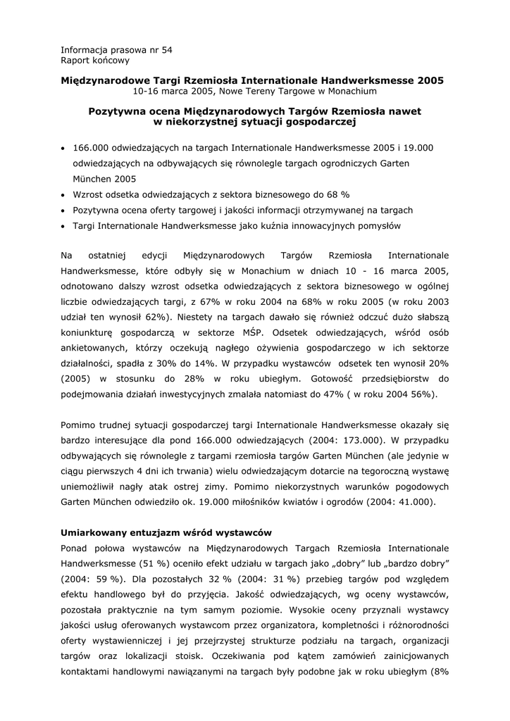 Informacja prasowa nr 54 Raport końcowy Międzynarodowe Targi Rzemiosła Internationale Handwerksmesse 2005 10-16 marca 2005, Nowe Tereny Targowe w Monachium Pozytywna ocena Międzynarodowych Targów Rzemiosła nawet w niekorzystnej sytuacji gospodarczej • 166.000 odwiedzających na targach Internationale Handwerksmesse 2005 i 19.000 odwiedzających na odbywających się równolegle targach ogrodniczych Garten München 2005 • Wzrost odsetka odwiedzających z sektora biznesowego do 68 % • Pozytywna ocena oferty targowej i jakości informacji otrzymywanej na targach • Targi Internationale Handwerksmesse jako kuźnia innowacyjnych pomysłów Na ostatniej edycji Międzynarodowych Targów Rzemiosła Internationale Handwerksmesse, które odbyły się w Monachium w dniach 10 - 16 marca 2005, odnotowano dalszy wzrost odsetka odwiedzających z sektora biznesowego w ogólnej liczbie odwiedzających targi, z 67% w roku 2004 na 68% w roku 2005 (w roku 2003 udział ten wynosił 62%). Niestety na targach dawało się również odczuć dużo słabszą koniunkturę gospodarczą w sektorze MŚP. Odsetek odwiedzających, wśród osób ankietowanych, którzy oczekują nagłego ożywienia gospodarczego w ich sektorze działalności, spadła z 30% do 14%. W przypadku wystawców odsetek ten wynosił 20% (2005) w stosunku do 28% w roku ubiegłym. Gotowość przedsiębiorstw do podejmowania działań inwestycyjnych zmalała natomiast do 47% ( w roku 2004 56%). Pomimo trudnej sytuacji gospodarczej targi Internationale Handwerksmesse okazały się bardzo interesujące dla pond 166.000 odwiedzających (2004: 173.000). W przypadku odbywających się równolegle z targami rzemiosła targów Garten München (ale jedynie w ciągu pierwszych 4 dni ich trwania) wielu odwiedzającym dotarcie na tegoroczną wystawę uniemożliwił nagły atak ostrej zimy. Pomimo niekorzystnych warunków pogodowych Garten München odwiedziło ok. 19.000 miłośników kwiatów i ogrodów (2004: 41.000). Umiarkowany entuzjazm wśród wystawców Ponad połowa wystawców na Międzynarodowych Targach Rzemiosła Internationale Handwerksmesse (51 %) oceniło efekt udziału w targach jako „dobry” lub „bardzo dobry” (2004: 59 %). Dla pozostałych 32 % (2004: 31 %) przebieg targów pod względem efektu handlowego był do przyjęcia. Jakość odwiedzających, wg oceny wystawców, pozostała praktycznie na tym samym poziomie. Wysokie oceny przyznali wystawcy jakości usług oferowanych wystawcom przez organizatora, kompletności i różnorodności oferty wystawienniczej i jej przejrzystej strukturze podziału na targach, organizacji targów oraz lokalizacji stoisk. Oczekiwania pod kątem zamówień zainicjowanych kontaktami handlowymi nawiązanymi na targach były podobne jak w roku ubiegłym (8% wystawców oceniło „bardzo dobrze” ilość nawiązanych kontaktów handlowych; 2004: 10% ocen „bardzo dobrych”; 33% wystawców oceniło „dobrze” prognozy na kontynuację współpracy handlowej po targach; 2004: 37%). Z drugiej strony 67% wystawców zadeklarowało realizację transakcji podczas targów (2004: 66%). Zadowoleni odwiedzający Oprócz wzrostu odsetka odwiedzających z sektora biznesowego należy wspomnieć także o jeszcze pozytywniejszej, w porównaniu z rokiem ubiegłym, ocenie targów Internationale Handwerksmesse wśród odwiedzających z tego sektora: 29 % (2004: 23 %) oceniło targi jako „doskonałe“ i „bardzo dobre“, 55 % (2004: 55 %) jako „dobre“. W oparciu o te dane można stwierdzić, że 69 % (2004: 63 %) odwiedzających odwiedzi „na pewno” lub „najprawdopodobniej” przyszłoroczne targi Internationale Handwerksmesse 2006. Odwiedzający podobnie jak wystawcy bardzo dobrze ocenili kompletność i różnorodność oferty wystawienniczej, jakość informacji, informacje na temat nowości. Podobnie zostały ocenione prezentacje specjalne, które odwiedziło ok. 52% odwiedzających. Uwagę zwraca także fakt, że odsetek odwiedzających, którzy przyjechali w celu wzięcia udziału w imprezach specjalistycznych towarzyszących targom wzrósł z 5 % na 10% w roku 2005. Biorąc pod uwagę kryterium sektora działalności można stwierdzić, że 65% odwiedzających reprezentowało rzemiosło (2004: 67%), natomiast 13% przemysł (2004: 7%). Na ostatniej edycji targów więcej niż w roku ubiegłym było odwiedzających o kompetencjach decyzyjnych (84% w por. do 2004: 82%), podobnie więcej było odwiedzających z małych i średnich przedsiębiorstw (35% w por. do 2004: 28%). Zadowolenie odwiedzających z sektora biznesowego odzwierciedlało się także w tym, że 69% z nich zadeklarowało, iż planuje odwiedzić kolejną edycję targów w roku 2006 (2004: 63%). Także konsumenci ostateczni odwiedzający targi Internationale Handwerksmesse 2005 wyżej niż w roku ubiegłym ocenili ostatnią edycję targów (38 % oceniło targi jako „doskonałe“ i „bardzo dobre“, w roku 2004: 36 %). 63 % z nich deklaruje wizytę na następnej edycji targów w roku 2006. Interesujące prezentacje specjalne Również w tym roku ponad połowa odwiedzających była gościem jednej lub kilku prezentacji specjalnych przygotowanych przez organizatora targów. Największą popularnością cieszyły się wystawy „Toskana“, „Schmuck“ (biżuteria) oraz „Erlebnis Schreinerhandwerk“ (warsztat pracy stolarza). Dużym zainteresowaniem cieszyły się jednak także prezentacje EXEMPLA („Wszechświat Metali“),„Talente“, „YoungGeneration“ i wystawy praktyczne pokazujące warsztaty pracy, zorganizowane przez producentów maszyn dla przemysłu mięsnego oraz cukierniczego. Odwiedzający byli także bardzo zainteresowani udziałem w specjalistycznym programie ramowym towarzyszącym targom, na który składały się specjalistyczne seminaria na temat innowacji i ich finansowania. Poza tym targi Internationale Handwerksmesse były jak co roku areną licznych imprez organizowanych przez różne stowarzyszeni