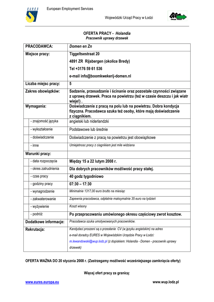 European Employment Services Wojewódzki Urząd Pracy w Łodzi OFERTA PRACY - Holandia Pracownik uprawy drzewek PRACODAWCA: Domen en Zn Miejsce pracy: Tiggeltsestraat 20 4891 ZR Rijsbergen (okolice Bredy) Tel +3176 59 61 536 e-mail [email protected] Liczba miejsc pracy: 5 Zakres obowiązków: - znajomość języka Sadzenie, przesadzanie i ścinanie oraz pozostałe czynności związane z uprawą drzewek. Praca na powietrzu (teŜ w czasie deszczu i jak wiatr wieje!) . Doświadczenie z pracą na polu lub na powietrzu. Dobra kondycja fizyczna. Pracodawca szuka teŜ osoby, które mają doświadczenie z ciągnikiem. angielski lub niderlandzki - wykształcenie Podstawowe lub średnie - doświadczenie Doświadczenie z pracą na powietrzu jest obowiązkowe - inne Umiejetnosc pracy z ciagnikiem jest mile widziana Wymagania: Warunki pracy: - data rozpoczęcia Między 15 a 22 lutym 2008 r. - okres zatrudnienia Dla dobrych pracowników moŜliwość pracy stałej. - czas pracy 40 godz tygodniowo - godziny pracy 07:30 – 17:30 - wynagrodzenie Minimalnie 1317,00 euro brutto na miesiąc - zakwaterowanie Zapewnia pracodawca, odpłatnie maksymalnie 35 euro na tydzień - wyŜywienie Koszt wlasny - podróŜ Po przepracowaniu umówionego okresu częściowy zwrot kosztow. Dodatkowe informacje: Pracodawca szuka umotywowanych pracowników. Rekrutacja: Kandydaci proszeni są o przesłanie CV (w języku angielskim) na adres e-mail doradcy EURES w Wojewódzkim Urzędzie Pracy w Łodzi: [email protected] (z dopiskiem: Holandia - Domen - pracownik uprawy drzewek) OFERTA WAśNA DO 20 stycznia 2008 r. (Zastrzegamy moŜliwość wcześniejszego zamknięcia oferty) Więcej ofert pracy za granicą: www.eures.europa.eu www.wup.lodz.pl