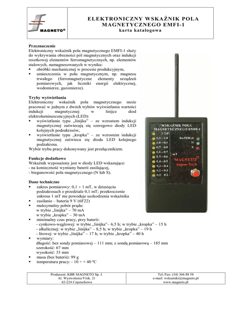 ELEKTRONICZNY WSKAŹNIK POLA MAGNETYCZNEGO EMFI-1 karta katalogowa Przeznaczenie Elektroniczny wskaźnik pola magnetycznego EMFI-1 służy do wykrywania obecności pól magnetycznych oraz indukcji resztkowej elementów ferromagnetycznych, np. elementów stalowych, namagnesowanych w wyniku: § obróbki mechanicznej w procesie produkcyjnym, § umieszczenia w polu magnetycznym, np. magnesu trwałego (ferromagnetyczne elementy urządzeń pomiarowych, jak liczniki energii elektrycznej, wodomierze, gazomierze). Tryby wyświetlania Elektroniczny wskaźnik pola magnetycznego może pracować w jednym z dwóch trybów wyświetlania wartości indukcji magnetycznej w linijce diod elektroluminescencyjnych (LED): § wyświetlanie typu „linijka” – ze wzrostem indukcji magnetycznej zaświecają się szeregowo diody LED kolejnych podzakresów, § wyświetlanie typu „kropka” – ze wzrostem indukcji magnetycznej zaświeca się dioda LED kolejnego podzakresu. Wybór trybu pracy dokonywany jest przełącznikiem. Funkcje dodatkowe Wskaźnik wyposażony jest w diody LED wskazujące: - na konieczność wymiany baterii zasilającej, - biegunowość pola magnetycznego (N lub S). Dane techniczne § zakres pomiarowy: 0,1 ¸ 1 mT, w dziesięciu podzakresach o przedziale 0,1 mT; przekroczenie zakresu 1 mT nie powoduje uszkodzenia wskaźnika § zasilanie – bateria 9 V (6F22) § maksymalny pobór prądu: w trybie „linijka” – 70 mA w trybie „kropka” – 30 mA § minimalny czas pracy, przy baterii: - cynkowo-węglowej: w trybie „linijka”– 6,5 h; w trybie „kropka” – 15 h - alkalicznej: w trybie „linijka” – 8,5 h; w trybie „kropka” – 19 h - litowej: w trybie „linijka” – 17 h; w trybie „kropka” – 40 h § wymiary: długość: bez sondy pomiarowej – 111 mm; z sondą pomiarową – 185 mm szerokość: 67 mm wysokość: 33 mm § masa (bez baterii): 99 g § temperatura pracy: - 10 ÷ + 40 ºC Producent: KBR MAGNETO Sp. J. Al. Wyzwolenia 9 lok. 21 42-224 Częstochowa Tel./Fax: (34) 366 88 58 e-mail: [email protected] www.magneto.pl