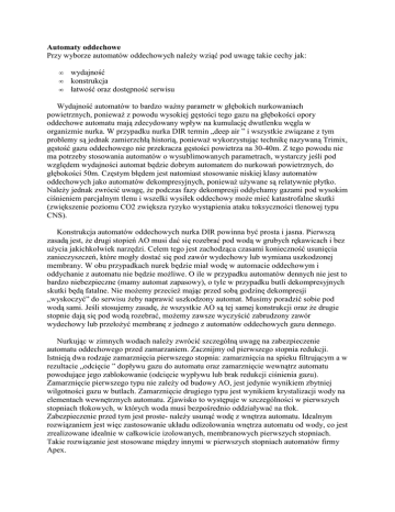 Automaty oddechowe Przy wyborze automatów oddechowych należy wziąć pod uwagę takie cechy jak: • • • wydajność konstrukcja łatwość oraz dostępność serwisu Wydajność automatów to bardzo ważny parametr w głębokich nurkowaniach powietrznych, ponieważ z powodu wysokiej gęstości tego gazu na głębokości opory oddechowe automatu mają zdecydowany wpływ na kumulację dwutlenku węgla w organizmie nurka. W przypadku nurka DIR termin „deep air ” i wszystkie związane z tym problemy są jednak zamierzchłą historią, ponieważ wykorzystując technikę nazywaną Trimix, gęstość gazu oddechowego nie przekracza gęstości powietrza na 30-40m. Z tego powodu nie ma potrzeby stosowania automatów o wysublimowanych parametrach, wystarczy jeśli pod względem wydajności automat będzie dobrym automatem do nurkowań powietrznych, do głębokości 50m. Częstym błędem jest natomiast stosowanie niskiej klasy automatów oddechowych jako automatów dekompresyjnych, ponieważ używane są relatywnie płytko. Należy jednak zwrócić uwagę, że podczas fazy dekompresji oddychamy gazami pod wysokim ciśnieniem parcjalnym tlenu i wszelki wysiłek oddechowy może mieć katastrofalne skutki (zwiększenie poziomu CO2 zwiększa ryzyko wystąpienia ataku toksyczności tlenowej typu CNS). Konstrukcja automatów oddechowych nurka DIR powinna być prosta i jasna. Pierwszą zasadą jest, że drugi stopień AO musi dać się rozebrać pod wodą w grubych rękawicach i bez użycia jakichkolwiek narzędzi. Celem tego jest zachodząca czasami konieczność usunięcia zanieczyszczeń, które mogły dostać się pod zawór wydechowy lub wymiana uszkodzonej membrany. W obu przypadkach nurek będzie miał wodę w automacie oddechowym i oddychanie z automatu nie będzie możliwe. O ile w przypadku automatów dennych nie jest to bardzo niebezpieczne (mamy automat zapasowy), o tyle w przypadku butli dekompresyjnych skutki będą fatalne. Nie możemy przecież mając przed sobą godzinę dekompresji „wyskoczyć” do serwisu żeby naprawić uszkodzony automat. Musimy poradzić sobie pod wodą sami. Jeśli stosujemy zasadę, że wszystkie AO są tej samej konstrukcji oraz że drugie stopnie dają się pod wodą rozebrać, możemy zawsze wyczyścić zabrudzony zawór wydechowy lub przełożyć membranę z jednego z automatów oddechowych gazu dennego. Nurkując w zimnych wodach należy zwrócić szczególną uwagę na zabezpieczenie automatu oddechowego przed zamarzaniem. Zacznijmy od pierwszego stopnia redukcji. Istnieją dwa rodzaje zamarznięcia pierwszego stopnia: zamarznięcia na spieku filtrującym a w rezultacie „odcięcie ” dopływu gazu do automatu oraz zamarznięcie wewnątrz automatu powodujące jego zablokowanie (odcięcie wypływu lub brak redukcji ciśnienia gazu). Zamarznięcie pierwszego typu nie zależy od budowy AO, jest jedynie wynikiem zbytniej wilgotności gazu w butlach. Zamarznięcie drugiego typu jest wynikiem krystalizacji wody na elementach wewnętrznych automatu. Zjawisko to występuje w szczególności w pierwszych stopniach tłokowych, w których woda musi bezpośrednio oddziaływać na tłok. Zabezpieczenie przed tym jest proste- należy usunąć wodę z wnętrza automatu. Idealnym rozwiązaniem jest więc zastosowanie układu odizolowania wnętrza automatu od wody, co jest zrealizowane idealnie w całkowicie izolowanych, membranowych pierwszych stopniach. Takie rozwiązanie jest stosowane między innymi w pierwszych stopniach automatów firmy Apex. Można natomiast powiedzieć, że konstrukcja tłokowa jest bardziej odporna na całkowite zalanie wodą. Może się to zdarzyć w przypadku automatów do butli dekompresyjnych. Butle te są zakręcone podczas nurkowania a automaty pozostawione pod ciśnieniem dla ochrony przed odkręceniem i zalaniem. Zalanie może nastąpić, jeżeli nurek niechcący odpowietrzy automat. Zalanie może wystąpić również w przypadku zamiany pod wodą automatów na dwóch butlach dekompresyjnych w przypadku awarii jednego z nich. Tak więc w przypadku butli dekompresyjnych pierwszy stopień tłokowy może być równie dobrą alternatywą. Zamarzanie drugiego stopnia redukcji jest efektem krystalizacji wody z wydychanej przez nurka pary wodnej, na układzie grzybek-gniazdo i przyblokowanie go uniemożliwiając pełne zamknięcie. Idealnym rozwiązaniem jest więc całkowite odizolowanie gniazda grzybka od wydychanego powietrza. Takie rozwiązanie jest spotykane na przykłada w konstrukcji automatu maski pełnotwarzowej AGA, w której komora wydechowa i komora gniazda grzybka są odseparowane za pomocą zawory jednokierunkowego. Innym bardzo dobrym rozwiązaniem jest zastosowanie takiej konstrukcji drugiego stopnia, w której wydychany gaz nie dochodzi bezpośrednio do układu gniazdo-grzybek a droga jaką musi przebyć jest jak najdłuższa, najlepiej w otoczeniu ciepłego metalu, na którym znaczna część pary wodnej ulega wykropleniu. Takie rozwiązanie jest stosowane między innymi we wszystkich drugich stopniach automatów firmy Apex. Konstrukcja automatów musi być prosta. Automat składający się z wielu elementów, szczególnie plastikowych, będzie bardziej awaryjny. Automat o prostej budowie będzie łatwiejszy w serwisie a jego serwis będzie tańszy i bardziej dostępny. Należy zwrócić uwagę, że jeśli posiadamy wiele automatów jednego producenta i jeśli konstrukcja tych automatów nie będzie skomplikowana, drobne naprawy serwisowe możemy wykonać sami posiadając jeden kit serwisowy. Sytuacja drobnej awarii automatu jest szczególnie nieprzyjemna podczas dłuższych wyjazdów, szczególnie jeśli wydarzy się na samym początku wyjazdu nurkowego. Stosując wyżej wymienione zasady możemy do takiej sytuacji nie dopuścić. W przypadku grupy DIR stosującej się do zasady unifikacji sprzętu, sprawa staje się jeszcze prostsza. Podsumowując powyższe oraz wykonując przegląd rynku stajemy przed wyborem ko