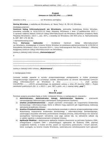 Wdrożenie aplikacji mobilnej - CUI/...../....../......./2015 Projekt Umowa nr CUI/ZP/PN/........./2015 zawarta w dniu .................... we Wrocławiu pomiędzy: Gminą Wrocław, z siedzibą we Wrocławiu, pl. Nowy Targ 1-8, 50-141 Wrocław, działającą poprzez: Centrum Usług Informatycznych we Wrocławiu, jednostkę budżetową Gminy Wrocław, powołaną uchwałą nr XLIX/1221/13 Rady Miejskiej Wrocławia z dnia 17 października 2013 r. w sprawie nadania statutu Centrum Usług Informatycznych we Wrocławiu (Biuletyn Urzędowy Rady Miejskiej Wrocławia z 2013 r., poz. 407), z siedzibą we Wrocławiu (50-304) przy ul. Namysłowskiej 8, NIP: 897-179-38-46, i reprezentowaną przez: Pana Dariusza Jędryczka – Dyrektora Centrum Usług Informatycznych we Wrocławiu, działającego w imieniu Gminy Wrocław na podstawie pełnomocnictwa Nr 2/III/JO/14 Prezydenta Wrocławia z dnia 2 stycznia 2014 r. i przy kontrasygnacie Pani Ewy Koleszko – Głównej Księgowej Centrum Usług Informatycznych we Wrocławiu, zwaną w dalszej treści Umowy „Zamawiającym” a ........................................................................................................................................... ..................................................... ................................................................................................................ .............................................................................................................., zwaną w dalszej treści Umowy „Wykonawcą”, o następującej treści: [umowa zostaje zawarta w wyniku przeprowadzonego postępowania w trybie przetargu nieograniczonego (ogłoszenie o przetargu zostało zamieszczone na stronie internetowej Centrum Usług Informatycznych we Wrocławiu w dniu .......................... r., znak sprawy CUI/ZP/PN/........../2015) prowadzonego na podstawie ustawy z dnia 29 stycznia 2004 r. Prawo zamówień publicznych (Dz. U. z 2013 r., poz. 907 z późn. zm.), zwanej dalej „pzp”] §1 Słownik pojęć Poniższe pojęcia powołane będą w treści niniejszej Umowy w następującym znaczeniu: 1) Administrator, Administrator Usługi, Administrator Systemu – pracownik zamawiającego administrujący elementami funkcjonalnymi Systemu; 2) analiza przedwdrożeniowa – zespół czynności zmierzający do rozpoznania środowiska biznesowego i informatycznego, które w efekcie mają zapewnić jak najpełniejszą realizację wdrożenia przedmiotu Umowy; 3) Analiza Przedwdrożeniowa – dokumentacja powstała w efekcie przeprowadzonego przez Wykonawcę rozpoznania środowiska biznesowego i informatycznego Zamawiającego, zawierająca wszystkie elementy przewidziane niniejszą Umową. Dokumentacja ma zawierać szczegółowy harmonogram wdrożenia oraz jego zakres tak, by wdrożenie odbyło się w całości zgodnie z postanowieniami niniejszej Umowy; 4) Aplikacja Mobilna - dedykowana aplikacja mobilna stworzona na potrzeby Systemu CRM, zintegrowana z System CRM i umożliwiająca: zgłaszanie do Systemu CRM, poprzez urządzenia mobilne, w trybie on-line, awarii (w rozumieniu potocznym) i innych zdarzeń, które wystąpiły na terenie miasta Wrocławia, automatyczne odnotowywanie tych zgłoszeń Strona 1 Wdrożenie aplikacji mobilnej - CUI/...../....../......./2015 5) 6) 7) 8) 9) 10) 11) 12) 13) 14) 15) 16) 17) 18) 19) 20) 21) w Systemie CRM w celu podjęcia przez Zamawiającego i inne podmioty stosownych działań, oraz komunikację Zamawiającego i innych podmiotów z użytkownikiem poprzez System, awaria – Awaria Krytyczna lub Awaria Niekrytyczna; Awaria Krytyczna – wada Systemu skutkująca w utracie przez System głównych funkcjonalności, będących Wymaganiami Funkcjonalnymi; Awaria Niekrytyczna – każda wada Systemu niebędąca Awarią Krytyczną, w szczególności stan, w którym System realizuje podstawowe funkcjonalności, lecz może pracować z mniejszą wydajnością, z wykorzystaniem rozwiązań zastępczych zaproponowanych przez Wykonawcę; całkowite wynagrodzenie brutto Wykonawcy – wynagrodzenie, o którym mowa w § 20 ust. 1 zd. 1; CUI – Centrum Usług Informatycznych we Wrocławiu, jednostka budżetowa Gminy Wrocław, powołana uchwałą nr XLIX/1221/13 Rady Miejskiej Wrocławia z dnia 17 października 2013 r. w sprawie nadania statutu Centrum Usług Informatycznych we Wrocławiu (Biuletyn Urzędowy Rady Miejskiej Wrocławia z 2013 r., poz. 407), z siedzibą we Wrocławiu, której kierownik oraz wybrani pracownicy będą reprezentować Gminę Wrocław w zakresie realizacji Umowy, w związku z faktem, iż przedmiot Umowy mieści się zakresie statutowym zadań ww. jednostki; dzień roboczy – dzień tygodnia od poniedziałku do piątku, z wyłączeniem dni ustawowo wolnych od pracy zgodnie z ustawą z dnia 18 stycznia 1951 roku o dniach wolnych od pracy (Dz.U. Nr 4, poz. 28 z późn. zm.) lub innej regulacji mającej charakter powszechnie obowiązującego prawa, która zastąpi ww. ustawę; Ekosystem sp. z o.o. – Ekosystem sp. z o.o. z siedzibą we Wrocławiu, KRS: 0000426169, NIP: 899-273-64-47; HelpDesk – system informatyczny działający u Zamawiającego, za pośrednictwem którego Zamawiający będzie zgłaszał wszystkie wady i uwagi do działania Systemu po jego odbiorze. Wykonawca będzie miał wgląd do systemu HelpDesk i będzie realizował zadania w nim zgłoszone; jednostki organizacyjne Gminy Wrocław – Urząd Miejski Wrocławia, CUI oraz inne jednostki utworzone przez Gminę Wrocław, w szczególności jednostki sektora finansów publicznych np. jednostki budżetowe (np. ZDiUM), zakłady budżetowe oraz spółki z udziałem Gminy Wrocław (np. Ekosystem sp. z o. o.); Okres Rozliczeniowy – kwartał roku kalendarzowego (pierwszym dniem pierwszego kwartału jest pierwszy dzień roku kalendarzowego); protokół odbioru – protokół, który po podpisaniu przez upoważnionych przedstawicieli obu Stron, stanowi potwierdzenie wykonania prac w nim określon