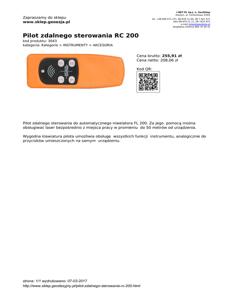 I-NET.PL Sp.J. o. GeoSklep Olsztyn, ul. Cementowa 3/301 Zapraszamy do sklepu www.sklep.geoezja.pl tel. +48 609 571 271, 89 670 11 00, 58 7 421 571 faks 89 670 11 11, 58 7421 871 e-mail [email protected] bezpłatna infolinia 800 70 30 31 Pilot zdalnego sterowania RC 200 kod produktu: 3043 kategoria: Kategorie > INSTRUMENTY > AKCESORIA Cena brutto: 255,91 zł Cena netto: 208,06 zł Kod QR: Pilot zdalnego sterowania do automatycznego niwelatora FL 200. Za jego pomocą można obsługiwać laser bezpośrednio z miejsca pracy w promieniu do 50 metrów od urządzenia. Wygodna klawiatura pilota umożliwia obsługę wszystkich funkcji instrumentu, analogicznie do przycisków umieszczonych na samym urządzeniu. strona: 1/1 wydrukowano: 07-03-2017 http://www.sklep.geodezyjny.pl/pilot-zdalnego-sterowania-rc-200.html