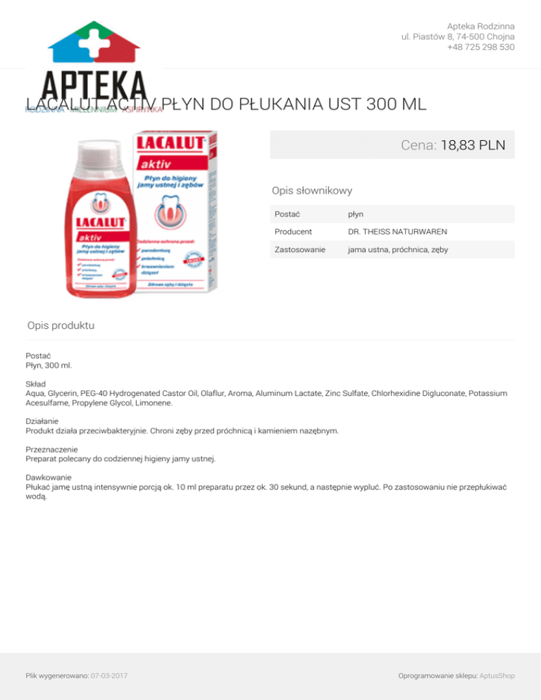 Apteka Rodzinna ul. Piastów 8, 74-500 Chojna +48 725 298 530 LACALUT ACTIV PŁYN DO PŁUKANIA UST 300 ML Cena: 18,83 PLN Opis słownikowy Postać płyn Producent DR. THEISS NATURWAREN Zastosowanie jama ustna, próchnica, zęby Opis produktu Postać Płyn, 300 ml. Skład Aqua, Glycerin, PEG-40 Hydrogenated Castor Oil, Olaflur, Aroma, Aluminum Lactate, Zinc Sulfate, Chlorhexidine Digluconate, Potassium Acesulfame, Propylene Glycol, Limonene. Działanie Produkt działa przeciwbakteryjnie. Chroni zęby przed próchnicą i kamieniem nazębnym. Przeznaczenie Preparat polecany do codziennej higieny jamy ustnej. Dawkowanie Płukać jamę ustną intensywnie porcją ok. 10 ml preparatu przez ok. 30 sekund, a następnie wypluć. Po zastosowaniu nie przepłukiwać wodą. Plik wygenerowano: 07-03-2017 Powered by TCPDF (www.tcpdf.org) Oprogramowanie sklepu: AptusShop