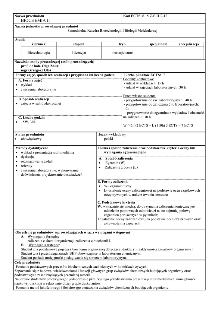 Kod ECTS: 6.15.Z-BCH2-12 Nazwa przedmiotu BIOCHEMIA II Nazwa jednostki prowadzącej przedmiot Samodzielna Katedra Biotechnologii I Biologii Molekularnej Studia kierunek stopień tryb Biotechnologia I licencjat niestacjonarne Nazwisko osoby prowadzącej (osób prowadzących) prof. dr hab. Olga Zhuk mgr Grzegorz Oloś Formy zajęć, sposób ich realizacji i przypisana im liczba godzin A. Formy zajęć • wykład • ćwiczenia laboratoryjne B. Sposób realizacji • zajęcia w sali dydaktycznej C. Liczba godzin • 15W, 30L specjalność specjalizacja Liczba punktów ECTS: 7 Godziny kontaktowe - udział w wykładach: 15 h - udział w zajęciach laboratoryjnych: 30 h Praca własna studenta - przygotowanie do ćw. laboratoryjnych: 40 h - przygotowanie do zaliczenia ćw. laboratoryjnych: 40h - przygotowanie do egzaminu z wykładów i obecność na zaliczeniu: 30 h W (45h) 2 ECTS + L (110h) 5 ECTS = 7 ECTS Status przedmiotu • obowiązkowy Język wykładowy polski Metody dydaktyczne • wykład z prezentacją multimedialną • dyskusja, • rozwiązywanie zadań, • referaty • ćwiczenia laboratoryjne: wykonywanie doświadczeń, projektowanie doświadczeń Forma i sposób zaliczenia oraz podstawowe kryteria oceny lub wymagania egzaminacyjne A. Sposób zaliczenia • Egzamin (W) • Zaliczenie z oceną (L) B. Formy zaliczenia: • W– egzamin ustny • L- ustalenie oceny zaliczeniowej na podstawie ocen cząstkowych otrzymywanych w trakcie trwania semestru C. Podstawowe kryteria W: wykazanie się wiedzą: do otrzymania zaliczenia konieczne jest udzielenie poprawnych odpowiedzi na co najmniej połowę zagadnień poruszonych w pytaniach; L: ustalenie oceny zaliczeniowej na podstawie ocen cząstkowych oraz aktywności na zajęciach. Określenie przedmiotów wprowadzających wraz z wymogami wstępnymi A. Wymagania formalne zaliczenie z chemii organicznej, zaliczenia z biochemii I. B. Wymagania wstępne: Student zna podstawowe pojęcia z biochemii organicznej dotyczące struktury i reaktywności związków organicznych. Student zna i przestrzega zasady BHP obowiązujące w laboratorium chemicznym. Student posiada umiejętność posługiwania się sprzętem laboratoryjnym. Cele przedmiotu Poznanie podstawowych procesów biochemicznych zachodzących w komórkach żywych. Zapoznanie się z budową, właściwościami i funkcji głównych grup związków chemicznych budujących organizmy oraz podstawowych zasad rządzących przemianą materii. Nauczenie studentów precyzyjnego i jednocześnie przejrzystego przedstawiania prezentacji multimedialnych, umiejętności naukowej dyskusji w relatywnie dużej grupie dyskutantów. Poznanie metod jakościowego i ilościowego oznaczania związków chemicznych budujących organizmy. Efekty kształcenia Treści programowe A. Wykład Sygnalizacja międzykomórkowa i wewnątrzkomórkowa. Nukleotydy i deoksynukleotydy jako prekursory kwasów nukleinowych i wolnych nukleotydów. Budowa i rola DNA i RNA. Typy RNA. Translacja. Ogólny schemat metabolizmu: katabolizm i anabolizm. Trawienie pokarmów. Enzymy trawienia białek, tłuszczów, węglowodanów i mechanizmy wchłaniania. Metabolizm węglowodanów: glikoliza, glukoneogeneza i cykl pentozofosforanowy. Rozkład i synteza glikogenu. Metabolizm lipidów: β-oksydacja i biosynteza kwasów tłuszczowych nasyczonych i nienasyconych. Metabolizm białek, aminokwasów i nukleotydów, deaminacja, cykl mocznikowy. Utlenianie biologiczne: oksydacyjna i nieoksydacyjna dekarboksylacja pirogronianu, cykl Krebsa i łańcuch oddechowy. Mechanizmy regulacji procesów metabolizmu. B. Laboratorium. Homeostaza, a właściwości buforowe płynów ustrojowych. Badanie właściwości amylazy trzustkowej, trypsyny i lipazy, drogi trawienia podstawowych składników organicznych (badania aktywności enzymów trawiennych w różnych warunkach). Hydroliza sacharozy przez drożdżową inwertazę. Izolowanie i wykrywanie steroidów. Oznaczanie aktywności trypsyny metodą Sorensena.. Barwniki antocyjanowe. Wykrywanie krwi w materiale badawczym. Oznaczanie zawartości chlorofilu w ekstraktach z liści. Wybrane metody badania składników kwasów nukleinowych. Wykaz literatury A. Literatura wymagana do ostatecznego zaliczenia zajęć (zdania egzaminu): • Hames B. D., Hooper N. M. - Biochemia. Krótkie Wykłady. Wydaw. Naukowe PWN, Warszawa 2005. • Murray R. i współpr. - Biochemia Harpera. Wydaw. Lekarskie PZWL, Warszawa 2006. • Stryer L. (red. Jan Michejda) - Biochemia; Wydaw. Naukowe PWN, Warszawa 2003. • Kączkowski J. - Podstawy biochemii. Wydawnictwa Naukowo-Techniczne, Warszawa 2004. B. Literatura uzupełniająca • Karlson P. – Zarys biochemii. Cz. 1-2, PWN, Warszawa 1987. • Kączkowski J. – Biochemia roślin. PWN, Warszawa 1997. • Kłyszejko-Stefanowicz L. – Cytobiochemia. PWN, Warszawa 2002. • Kołodziejczyk A. – Naturalne związki organiczne. PWN, Warszawa 2004. • Minakowski W., Weidner S. – Biochemia kręgowców. PWN, Warszawa 2005 • Kędryna T. i współpr.- Wybrane zagadnienia z biochemii ogólnej z ćwiczeniami. Wydawnictwo UJ, Kraków 2001. Wiedza W1 objaśnia współzależności pomiędzy strukturami składników komórki i ich funkcjami W2 zna i może scharakteryzować najważniejsze drogi metaboliczny aminokwasów, białka, węglowodanówy, enzymów, lipidówy, kwasów nukleinowych. W3 wymienia nowoczesne metody oznaczania budowy i właściwości związków chemicznych budujących organizmy Umiejętności U1 korzysta z naukowej literatury U2 wykonuje proste obliczenia biochemiczne U3 planuje i wykonuje proste doświadczenie U4 zaprezentuje i dyskutuje wyniki doświadczeń U5 sporządza wykresy zależności w oparciu o dane źródłowe lub uzyskane podczas wykonywania doświadczeń U6 wnioskuje na podstawie danych z różnych źródeł, w tym uzyskanych podczas wykonywania doświadczeń na zajęciach laboratoryjnych Kompetencje społeczne (postawy) K1 wykazuje otwartość na aktualizowanie wiedzy