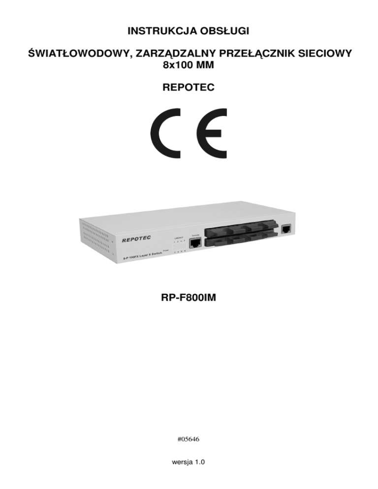 INSTRUKCJA OBSŁUGI ŚWIATŁOWODOWY, ZARZĄDZALNY PRZEŁĄCZNIK SIECIOWY 8x100 MM REPOTEC RP-F800IM #05646 wersja 1.0 Wstęp Inteligentny światłowodowy przełącznik firmy REPOTEC RP-F800IM jest zarządzalnym, wysoko wydajnym urządzeniem sieciowym wyposażonym w 8 portów 100 Mbps. Przeznaczony jest głównie dla małych i średnich sieci LAN. Urządzenie spełnia wymagania standardów IEEE802.3/u, 802.1d/p/q/x dla przełączników Fast Ethernet. Funkcja Store&Forward zapewnia efektywne wykorzystanie przepustowości każdego portu oraz zabezpiecza przed utratą pakietów podczas transmisji i odbioru danych. Zarządzanie odbywa się za pomocą www, telnetem, SNMP oraz konsoli (CLI). Urządzenie zostało wyposażone w zaawansowane funkcje: QoS, Spanning Tree, Port mirroring, IGMP snooping itp. Administracja obejmuje m.in. kontrolę przepustowości, statystyki, funkcje zapewniania jakości transmisji QoS, limitowanie dostępu do portów, obsługę protokołu Spanning Tree, opcje Port Trunking, Port Mirroring, IGMP Snooping itp. Ostrzeżenie Należy zapewnić bezpieczne warunki pracy urządzenia. Dokonanie przez użytkownika jakichkolwiek własnych zmian w urządzeniu może spowodować utratę możliwości jego legalnego użytkowania. Bezpieczeństwo użytkowania Urządzenie zostało zaprojektowane i wyprodukowane z najwyższą starannością o bezpieczeństwo osób instalujących i użytkujących. Dla zapewnienia bezpieczeństwa pracy, należy stosować się do wszelkich wskazań zawartych w tej instrukcji jak i instrukcjach obsługi urządzeń towarzyszących (np. komputera PC). 1. Zawartość opakowania: - inteligentny przełącznik RP-F800IM, - kabel zasilający, - kabel konsolowy, - niniejsza instrukcja obsługi. Podczas dostawy należy upewnić się, że opakowanie nie jest uszkodzone. W przypadku stwierdzonych uszkodzeń należy niezwłocznie skontaktować się z dostawcą. Prosimy również o sprawdzenie zgodności zawartości opakowania z powyżej zamieszczoną listą. 2. Zawartość instrukcji Instrukcja ta zawiera opis przełącznika sieciowego RP-F800IM z odpowiednimi procedurami instalacji, konfiguracji i użytkowania. Przed przystąpieniem do instalacji urządzenia należy dokładnie przeczytać całość tej instrukcji, w szczególności zaś punkty poświęcone bezpieczeństwu. 3. Zasady bezpieczeństwa Przełącznik sieciowy RP-F800IM jest zgodny z przepisami w zakresie bezpieczeństwa użytkowania urządzeń elektrycznych. - gniazdo sieciowe musi być uziemione zgodnie z obowiązującymi przepisami, - przed przeniesieniem lub wykonywaniem innych operacji technicznych urządzenie należy odłączyć od zasilania, - nie stosować uszkodzonych lub zużytych przewodów zasilania, gdyż powodują one znaczne zagrożenie dla bezpieczeństwa użytkownika, - prace instalacyjne muszą być wykonywane przez odpowiednio przeszkolony personel techniczny, - nie stosować urządzenia w miejscach występowania substancji łatwopalnych, - zabezpieczyć urządzenie przed dostępem dzieci lub osób niepowołanych, - upewnić się, że urządzenie zostało odpowiednio zamocowane, - urządzenie traktowane jest jako wyłączone dopiero po odłączeniu przewodów zasilania oraz przewodów łączących je z innymi urządzeniami, - jeśli urządzenie zostanie przeniesione z miejsca chłodnego do ciepłego, w jego wnętrzu może skroplić się para wodna uniemożliwiając prawidłowe funkcjonowanie. Należy wówczas odczekać, aż wilgoć odparuje. Uwaga! Nadajniki optyczne korzystają z lasera o dużej mocy. Skierowanie go w kierunku oczu może spowodować uszkodzenie wzroku. Nie należy dotykać styków gniazd znajdujących się na obudowie urządzenia. Wyładowanie elektrostatyczne może spowodować trwałe uszkodzenie urządzenia. 2 4. Instalacja sprzętu 4.1. Zasilanie Przełącznik sieciowy RP-F800IM jest zasilany z wbudowanego zasilacza. Przy pomocy załączonego przewodu zasilania należy podłączyć urządzenie do sieci 230V. Zamontowanie przełącznika Sposoby podłączenia innych urządzeń sieciowych do przełącznika: Sposoby podłączenia urządzeń sieciowych do przełącznika: 3 4.2. Oprogramowanie Do prawidłowego oprogramowania. funkcjonowania przełącznika nie jest wymagane instalowanie dodatkowego 4.3. Środowisko pracy Należy zadbać, aby urządzenie umieszczone było w sposób zapewniający dobry przepływ powietrza i łatwy dostęp do portów. Powietrze powinno być wolne od zanieczyszczeń, a urządzenie nie powinno znajdować się w bezpośredniej bliskości źródeł ciepła (piece, grzejniki, bezpośrednie nasłonecznienie) bądź urządzeń generujących zakłócenia elektromagnetyczne (silniki, telewizory itp.). 4.4. Wskaźniki LED Przełącznik sieciowy RP-F800IM należy umieścić w taki sposób, by było widać diody kontrolne umieszczone na przednim panelu urządzenia. Opis diod LED (w niektórych wersjach urządzeń nie występują wszystkie wymienione wskaźniki LED): POWER Świecenie ciągłe diody oznacza włączone zasilanie. LINK/ACT Świecenie ciągłe diody oznacza poprawne podłączenie innego urządzenia do portu, świecenie pulsacyjne oznacza przesyłanie pakietów przez port. 5. Instalacja okablowania Dla połączenia przełącznika sieciowego z innymi urządzeniami sieciowymi zaleca się stosowanie przyłączy odpowiednich dla typu wbudowanych weń portów. Specyfikacja przyłączy: - maksymalna długość zastosowanego przyłącza: A) światłowód wielomodowy do 2 kilometrów B) światłowód jednomodowy do 20 kilometrów, - porty obsługują jeden typy mediów: moduły optyczne. Aby poprawnie zainstalować moduły światłowodowe należy: - sprawdzić czy moduł optyczny jest odpowiedniego typu i czy jest przystosowany do obudowy, - wpiąć moduł światłowodowy do przełącznika sieciowego, - zainstalować przyłącze światłowodowe w module, - powtórzyć powyższe kroki dla innych modułów. 6. Praca z przełącznikiem sieciowym Dostęp do