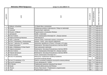 Biblioteka WSInf Bydgoszcz liczba egzemplarzy data włączenia do księgozbioru 1 A.Pelikant, G.Zwoliński 3 D Studio Max w ćwiczeniach 1999 10 2005-08-15 2 R.Pawlak Podstawowe problemy matematyczne. Wstęp do matematyki 2000 10 2005-08-15 3 J.Czerbniak Elementy fizyki i elektroniki 2000 10 2005-08-15 4 Z.Gmyrek, A.Pelikant Programowanie w środowisku Windows 2000 10 2005-08-15 5 J.Jędrzejewski Notatki z matematyki 2001 10 2005-08-15 6 Pod red. K.Dems Teoria i Zastosowanie Informatyki Nr 1, Zeszyty naukowe 2001 10 2005-08-15 7 II Krajowa Konferencja Naukowa Telemedycyna II 2001 10 2005-08-15 8 E.Kącki, L.Siewirski Wybrane działy z matematyki wyższej z ćwiczeniami 2002 10 2005-08-15 tytuł autor sygnatura rok wydania wersja 12 z dnia 2008-01-16 9 Pod red. T.Rostowskiej, J.Rostowskiego Rodzina - rozwój - praca wybrane zagadnienia 2002 10 2005-08-15 10 Pod red. T.Jałmużny, W. Leżańskiej Szkolnictwo niepubliczne w Polsce i w Europie w XX wieku 2002 10 2005-08-15 11 I Krajowe Sympozjum Modelowanie i Symulacja Komputerowa w technice MiS'02 2002 10 2005-08-15 12 E.Kącki, A.Małolepszy, N.Xuan Quynh Świat zastosowań matematyki 2003 10 2005-08-15 13 II Krajowe sympozjum Modelowanie i Symulacja Komputerowa w technice MiS'03 2003 10 2005-08-15 14 Pod red. K.Dems Teoria i Zastosowania Informatyki Nr 2, Zeszyty naukowe 2003 10 2005-08-15 15 III Krajowe Sympozjum Modelowanie i Symulacja Komputerowa w technice MiS'04 2004 10 2005-08-15 16 Pod red. K.Dems Teoria i Zastosowania Informatyki Nr 3 2004 10 2005-08-15 17 Pod red. W.Leżańsakiej Historyczne i współczesne konteksty kształcenia 2004 10 2005-08-15 nauczycieli wczesnej edukacji 2005-08-15 18 Pod red. W.Leżańskiej, A.Tyl Pytania o przyszłość kształcenia nauczycieli wczesnej edukacji 2004 10 2005-08-15 19 Pod red W.Leżańskiej Forum edukacyjne Nr 1 (2004) 2001 10 2005-08-15 20 R.M. Riordan Projektowanie systemów relacyjnych baz danych 2000 1 2005-11-21 21 A.Nowak Tworzenie plików pomocy dla Windows 1999 1 2005-11-21 22 S. Roman Access. Baza danych - Projektowanie i programowanie 2001 1 2005-11-21 23 J. Kniat Programowanie w języku C++ 1999 1 2005-11-21 24 P.Davis GIMP 2000 1 2005-11-21 25 H.F. Ledgard Mała księga programowania obiektowego 1998 1 2005-11-21 26 I. Durlik Inżynieria zarządzania cz.I 1993 1 2005-11-21 27 I. Durlik Inżynieria zarządzania cz.II 1996 1 2005-11-21 28 R.J. Yarger, G.Reese, T.King MySQL i mSQL 2001 1 2005-11-21 29 P.Wróblewski Programowanie w Windows dla praktyków 1997 1 2005-11-21 30 A.R. Neibauer Języki C i C++. Twój pierwszy program 1995 1 2005-11-21 31 P.Adamczewski Zintegrowane systemy informatyczne w praktyce. 2003 1 2005-11-21 32 J.Dyche CRM. Relacje z klientami. 2002 1 2005-11-21 33 W. Borowik, B. Borowik Meandry języka C++. 2001 1 2005-11-21 34 W.Freeze Visual Basic 6. Programowanie baz danych. 2001 1 2005-11-21 35 Stanisław Bolkowski Elektrotechnika 4 1993 1 2005-11-21 36 Pod red. L.Drelichowski i inn. Zastosowanie technik informacyjnych w gospodarce i zarządzanie wiedzą 2003 1 2005-11-21 37 J.C Armstrong, D.Taylor Unix dla każdego 1999 1 2005-11-21 38 A. Januszewski Informatyka w przedsiębiorstwie 2001 1 2005-11-21 39 A. Simmons Wprowadzenie do transmisji danych 1999 1 2005-11-21 40 R. Tidrow Rejestr Windows '95 1997 1 2005-11-21 41 W. Krysicki, L Włodarska Analiza matematyczna w zadaniach, cz.I 2000 1 2005-11-21 42 W. Krysicki, L Włodarska Analiza matematyczna w zadaniach, cz.II 2000 1 2005-11-21 43 N. Wirth Algorytmy + struktury danych = programy 2001 1 2005-11-21 44 W.T. Bielecki Informatyzacja zarządzania 2000 1 2005-11-21 45 B.W. Kernigham, D.M. Ritchie Język ANSI C 2001 1 2005-11-21 46 G.M. Fichtenholz Rachunek różniczkowy i całkowity 1999 1 2005-11-21 47 S. Forte Access 2000. Księga eksperta. 2001 1 2005-11-21 48 P.Metzger, A. Jełowicki Anatomia PC 1999 1 2005-11-21 49 L. Drelichowski Elementy teorii i praktyki zarządzania z technikami informacyjnymi w przedsiębiorstwie 2000 2 2005-11-21 50 M.Strebe, C.Perkins Firewalls ściany ogniowe 2000 1 2005-12-02 51 M.Hernadez, J.Viescas Zapytania SQL 2001 1 2005-12-02 52 R.Bowen, D.Ridruejo, A.Liska Apache. Podręcznik Administratora 2002 1 2005-12-02 53 M.Strebe Windows 2000. Server 2002 1 2005-12-02 54 M.Doman, M.Matłoka, B. Wojcieszyn Matematyka dla zaocznych studiów ekonomicznych 1997 1 2005-12-02 55 Pod red. K.Dems Teoria i Zastosowania Informatyki Nr 2, Zeszyty naukowe 2003 2 2005-12-02 56 Pod red W.Leżańsakiej Forum edukacyjne Nr 1 (2004) 2001 2 2005-12-02 57 Zieleniewski J. Organizacja i zarządzanie 1981 1 2005-12-02 58 Skórzyńska Z. Psychologia dla rodziców 1975 1 2006-01-20 59 Wroczyński R. Wychowanie poza szkołą 1968 1 2006-01-20 60 Meili R. Podręcznik diagnostyki psychologicznej 1969 1 2006-01-20 61 Szewczuk W. Atlas psychologiczny 1976 1 2006-01-20 62 Pod red. Żebrowska M Psychologia rozwoju dzieci i młodzieży 1975 1 2006-01-20 63 Przetacznikowa M. Włodarski Z. Psychologia wychowawcza 1986 1 2006-01-20 64 Pieter J. Historia psychologii 1974 1 2006-01-20 65 Pod red. Kowaliszyn K. Mam 6 lat. Przewodnik dla nauczyciela. 1988 1 2006-01-20 66 Pod red. Wołoszynowskiej Metody badań psychologicznych 1973 1 2006-01-20 67 Zaczyński W. Praca badawcza nauczyciela 1968 1 2006-01-20 68 Słyszowa S. Dziecko rozpoczyna naukę 1975 1 2006-01-20 69 Jakubowska U. Czynności badawcze w psychologii i pedagogice 1993 1 2006-01-20 70 Franus E. Sprawdziany rozwoju dziecka 1975 1 2006-01-20 71 Franus E. Rozwój dziecka w wieku przedszkolnym 1975 1 2006-01-20 72 Frątczak J. Pedagogika porównawcza 1994 1 2006-01-20 73 Bobrowska Ł. Plastyka w klasach początkujących 1975 1 2006-01-20 74 Rosińska Z. i inn Kierunki współczesnej psychologii. Ich rozwój i geneza 1987 1 2006-01-20 75 Siemaszko A. Granice tolerancji. O teoriach zachowań dewiacyjnych 1993 1 2006-01-20 76 Chłopkiewicz M. Osobowość dzieci i młodzieży. Rozwój i patologia 1987 1 2006-01-20 77 Lewin A. Tryptyk pedagogiczny 1986 1 2006-01-2