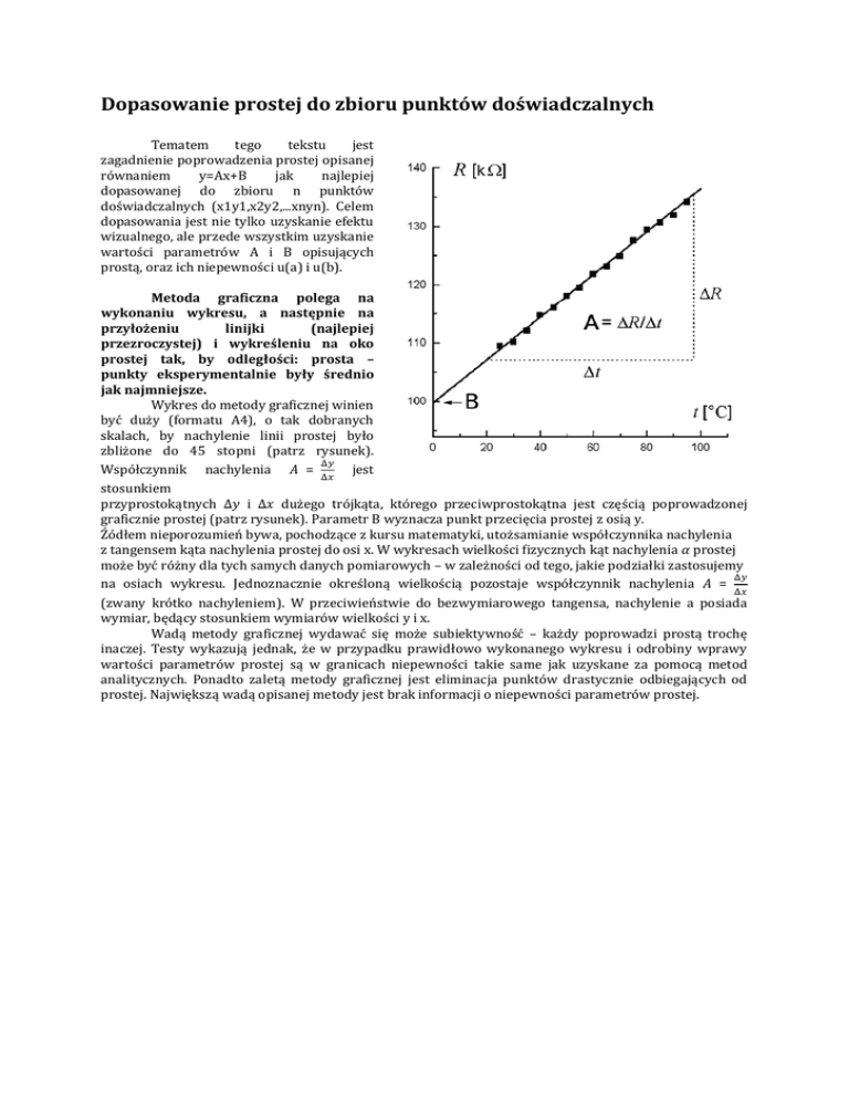 Dopasowanie prostej do zbioru punktów doświadczalnych Tematem tego tekstu jest zagadnienie poprowadzenia prostej opisanej równaniem y=Ax+B jak najlepiej dopasowanej do zbioru n punktów doświadczalnych (x1y1,x2y2,...xnyn). Celem dopasowania jest nie tylko uzyskanie efektu wizualnego, ale przede wszystkim uzyskanie wartości parametrów A i B opisujących prostą, oraz ich niepewności u(a) i u(b). Metoda graficzna polega na wykonaniu wykresu, a następnie na przyłożeniu linijki (najlepiej przezroczystej) i wykreśleniu na oko prostej tak, by odległości: prosta – punkty eksperymentalnie były średnio jak najmniejsze. Wykres do metody graficznej winien być duży (formatu A4), o tak dobranych skalach, by nachylenie linii prostej było zbliżone do 45 stopni (patrz rysunek). Współczynnik nachylenia jest stosunkiem przyprostokątnych i dużego trójkąta, którego przeciwprostokątna jest częścią poprowadzonej graficznie prostej (patrz rysunek). Parametr B wyznacza punkt przecięcia prostej z osią y. Źódłem nieporozumień bywa, pochodzące z kursu matematyki, utożsamianie współczynnika nachylenia z tangensem kąta nachylenia prostej do osi x. W wykresach wielkości fizycznych kąt nachylenia prostej może być różny dla tych samych danych pomiarowych – w zależności od tego, jakie podziałki zastosujemy na osiach wykresu. Jednoznacznie określoną wielkością pozostaje współczynnik nachylenia (zwany krótko nachyleniem). W przeciwieństwie do bezwymiarowego tangensa, nachylenie a posiada wymiar, będący stosunkiem wymiarów wielkości y i x. Wadą metody graficznej wydawać się może subiektywność – każdy poprowadzi prostą trochę inaczej. Testy wykazują jednak, że w przypadku prawidłowo wykonanego wykresu i odrobiny wprawy wartości parametrów prostej są w granicach niepewności takie same jak uzyskane za pomocą metod analitycznych. Ponadto zaletą metody graficznej jest eliminacja punktów drastycznie odbiegających od prostej. Największą wadą opisanej metody jest brak informacji o niepewności parametrów prostej.
