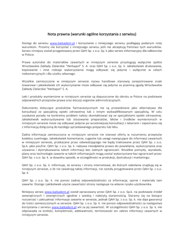 Nota prawna (warunki ogólne korzystania z serwisu) Dostęp do serwisu www.baikadent.pl i korzystanie z niniejszego serwisu podlegają podanym niżej warunkom. Prosimy nie korzystać z niniejszego serwisu jeśli nie akceptują Państwo tych warunków. Serwis niniejszy został przygotowany przez QAH Sp. z o.o. Sp. k jako serwis informacyjny dla odbiorców w Polsce. Prawa autorskie do materiałów zawartych w niniejszym serwisie przysługują wyłącznie spółce Wrocławskie Zakłady Zielarskie "Herbapol" S. A. oraz QAH Sp. z o.o. Sp. k. Jakiekolwiek drukowanie, kopiowanie i inne rodzaje wykorzystania mogą odbywać się jedynie i wyłącznie w celach niekomercyjnych i dla użytku własnego. Wszelkie zamieszczone w niniejszym serwisie nazwy handlowe stanowią zarejestrowane znaki towarowe i jakiekolwiek ich wykorzystanie może odbywać się jedynie za pisemną zgodą Wrocławskie Zakłady Zielarskie "Herbapol" S. A. Leki i produkty wymienione w niniejszym serwisie są dopuszczone do obrotu w Polsce na podstawie odpowiednich przepisów prawa oraz decyzji organów administracyjnych. Dokumenty dotyczące produktów farmaceutycznych nie są przewidziane jako alternatywa dla konsultacji ze specjalistą opieki zdrowotnej lub z innym wykwalifikowanym specjalistą. W celu uzyskania porady na konkretny problem należy skontaktować się ze specjalistami opieki zdrowotnej. Jakiekolwiek wykorzystywanie lub stosowanie preparatów, leków i środków wymienionych w niniejszym serwisie może się odbywać jedynie po wcześniejszej konsultacji z lekarzem i zapoznaniu się z informacją dołączoną do każdego sprzedawanego preparatu lub leku. Żadna informacja zamieszczona w niniejszym serwisie nie stanowi oferty w rozumieniu przepisów kodeksu cywilnego. Jakiekolwiek komentarze, sugestie lub uwagi nawiązujące do informacji zawartych w niniejszym serwisie, przekazane przez odwiedzającego nie będą traktowane przez QAH Sp. z o.o. Sp.k. jako poufne. QAH Sp. z o.o. Sp. k. nabywa nieodpłatne prawo do powielania, wykorzystania oraz używania i dystrybuowania takich informacji bez żadnych ograniczeń. Wszelkie pomysły, wynalazki, plany oraz technologie zawarte w takich informacjach mogą zostać wykorzystane bez ograniczeń przez QAH Sp. z o.o. Sp. k. w dowolny sposób, w szczególności w produkcji, dystrybucji i marketingu. QAH Sp. z o.o. Sp. k. informuje, że serwisy i strony internetowe, do których odesłania znajdują się w niniejszym serwisie, o ile nie zawierają takiej informacji, nie zostały przygotowane przez QAH Sp. z o.o. Sp. k. QAH Sp. z o.o. Sp. k. nie ponosi żadnej odpowiedzialności za informacje, opinie i materiały tam zawarte. Dostęp i jakikolwiek użycie zawartości strony następuje na własne ryzyko użytkownika. Niniejszy serwis www.baikadent.pl został opracowany przez QAH Sp. z o.o. Sp.k. na podstawie źródeł wewnętrznych i zewnętrznych zgodnie z wiedzą i należytą starannością. Staramy się na bieżąco rozszerzać i uaktualniać informacje zawarte w serwisie, jednak QAH Sp. z o.o. Sp. k. nie daje gwarancji do treści zamieszczonych w serwisie. QAH Sp. z o.o. Sp. k. nie ponosi odpowiedzialności za następstwa korzystania z serwisu www.baikadent.pl ani za jej zawartość. W szczególności QAH Sp. z o.o. Sp. k. nie odpowiada za ścisłość, kompletność, adekwatność, terminowość ani zakres informacji zawartych w niniejszym serwisie. QAH Sp. z o.o. Sp. k. zastrzega sobie prawo do wprowadzania dowolnych zmian w treści niniejszej strony internetowej w dowolnym momencie, z dowolnego powodu oraz bez uprzedniego zawiadomienia i nie ponoszą odpowiedzialności za żadne skutki ich wprowadzenia. QAH Sp. z o.o. Sp. k. nie ponosi jakiejkolwiek odpowiedzialności za bezpośrednie, pośrednie, przypadkowe, celowe lub wynikowe szkody, straty, ubytki i inne wypadki spowodowane przez Państwa w wyniku działań związanych z dostępem, użyciem lub pobieraniem materiałów z serwisu i ich dalszą eksploatacją. W szczególności nie ponoszą odpowiedzialności za szkody powstałe wskutek przerwy w dostępie do sieci i serwisu www.baikadent.pl błędów systemu komputerowego spowodowanych z przyczyn niezależnych. QAH Sp. z o.o. Sp. k. przechowuje i przetwarza wszelkie przekazane przez Państwa informacje z zachowaniem odpowiednich środków bezpieczeństwa, spełniających wymagania polskiego prawa. QAH Sp. z o.o. Sp.k. szanuje prywatność osób odwiedzających naszą stronę i gromadzi dane osobowe, takie jak imię i nazwisko, adres, numer telefonu i adres e-mail użytkownika, wyłącznie od osób, które dobrowolnie podają je do naszej wiadomości. Dane te możemy przekazać firmie Wrocławskie Zakłady Zielarskie "Herbapol" S. A., wraz z numerem telefonu komórkowego i adresem email dla celów marketingowych oraz realizacji koordynacji projektów prowadzonych przez QAH Sp. z o.o. Sp. k. Informacje te będziemy wykorzystywać w związku z indywidualnymi zapytaniami, a także odwoływać się do nich w celu lepszego zrozumienia potrzeb naszych klientów oraz wprowadzania usprawnień w naszych usługach. W takim przypadku możemy wykorzystać wspomniane informacje w celu skontaktowania się z użytkownikiem strony przekazanie moich danych osobowych. Nie sprzedajemy ani nie wykorzystujemy takich informacji, ani też nie przekazujemy ich osobom trzecim bez zgody użytkownika.