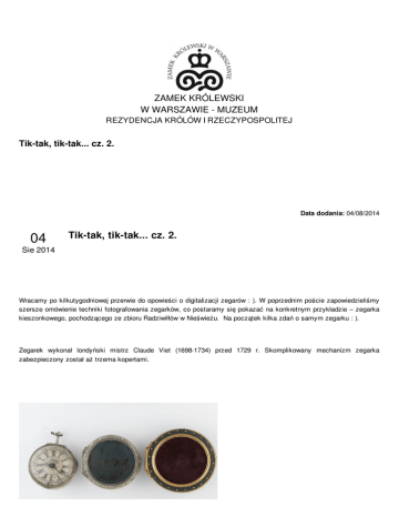 ZAMEK KRÓLEWSKI W WARSZAWIE - MUZEUM REZYDENCJA KRÓLÓW I RZECZYPOSPOLITEJ Tik-tak, tik-tak... cz. 2. Data dodania: 04/08/2014 04 Tik-tak, tik-tak... cz. 2. Sie 2014 Wracamy po kilkutygodniowej przerwie do opowieści o digitalizacji zegarów : ). W poprzednim poście zapowiedzieliśmy szersze omówienie techniki fotografowania zegarków, co postaramy się pokazać na konkretnym przykładzie – zegarka kieszonkowego, pochodzącego ze zbioru Radziwiłłów w Nieświeżu. Na początek kilka zdań o samym zegarku : ). Zegarek wykonał londyński mistrz Claude Viet (1698-1734) przed 1729 r. Skomplikowany mechanizm zegarka zabezpieczony został aż trzema kopertami. Pierwsza, wewnętrzna koperta, srebrna i gładka, mieści mechanizm z grawerowaną tarczą, z emaliowanymi na czarno cyframi rzymskimi godzin połączonymi dekoracyjnymi arkadkami i arabskimi cyframi minut, z napisem: „London”, określającym miejsce wykonania. Drugą kopertę, również srebrną, z otworem przez który widoczna jest tarcza i chroniące ją wypukłe szkło, zdobi pas Drugą kopertę, również srebrną, z otworem przez który widoczna jest tarcza i chroniące ją wypukłe szkło, zdobi pas ornamentu z akantowych liści. Tylną część pokrywa trybowana dekoracja z ornamentów wstęgowo-cęgowych tworzących pola wypełnione wyobrażeniami zwierząt i motywami roślinnymi. Środkowe pole zwieńczone koszem kwiatów mieści grawerowaną tarczę z herbem właściciela zegarka – Trzaska. Zewnętrzna koperta, także z okrągłym otworem umożliwiającym odczyt wskazań zegarka, pokryta jest czarnym szagrynem i ozdobiona wiankiem złotych ćwieczków. Andrzej nazywa takie przypadki "małą tykającą bombą zegarową" : ). A dlaczego? Tak skomplikowany zegarek wymaga Andrzej nazywa takie przypadki "małą tykającą bombą zegarową" : ). A dlaczego? Tak skomplikowany zegarek wymaga szczególnej uwagi ze strony fotografa. Brak pokory może niejednokrotnie zemścić się na fotografie wykonującym zdjęcia katalogowe obiektów zabytkowych. Początkujący fotograf może potraktować taki zabytek bez należytego respektu, a to już tylko krok do tego, aby natknąć się na prawdziwą minę. Jak już wiemy choćby z powyższego opisu zegarek może być zbudowany z różnych materiałów np. metali, szkła (szkiełko ochronne cyferblatu), emalii, kości słoniowej (stanowiącej elementy ozdobne koperty), tkaniny, skóry (wykorzystywanej do dekoracji koperty lub futerału stanowiącego niejednokrotnie integralną część zegarka). Każdy z tych materiałów wymaga odrębnego oświetlenia i tu zaczyna się kłopot. Na jednym zdjęciu musimy oświetlić obiekt tak, aby każdy jego element był czytelny, pozbawiony niepotrzebnych odblasków i niepożądanych odbić, a zdjęcie oddawało kształt i charakter materiału. Jak wyglądają wpadki fotografów, zobrazować możemy często pojawiającym się w sposób niezamierzony na chromowanych lub złotych kopertach wizerunkiem fotografa, wykonującego swoją pracę. Przy tak bogato wykonanym zegarku, jak ten prezentowany powyżej, o podobne potknięcia nietrudno. Jednym z rozwiązań na ten problem jest zastosowanie światła rozproszonego, które penetruje wszystkie zakamarki koperty, pozwalając na dokładny ogląd dekoracji i odczyt ewentualnych napisów i znaków wytwórców. Unikamy w ten sposób nadmiernych odblasków. Minusem tego typu oświetlenia jest zatracanie przez metal swojego charakteru, bywa, że wygląda jak plastik. Poprawić to można rzucając na obiekt trochę światła ukierunkowanego, przepuszczonego przez wielkoformatową płaszczyznę rozpraszającą, najlepiej w kształcie oktoboku. Drugim dobrym sposobem na pozbycie się "wizerunku fotografa" na fotografowanym obiekcie, przy jednoczesnym zachowaniu kształtu i proporcji zegarka jest złamanie osi optycznej za pomocą pokłonów czołówki aparatu (jeżeli mamy aparat miechowy) lub, jeżeli go nie posiadamy, za pomocą obiektywu typu till-shift. Mówiąc bardziej obrazowo ustawiamy się w takiej pozycji, aby nasze odbicie było niewidoczne w fotografowanym przedmiocie, na przykład nie bezpośrednio nad obiektem, ale pod pewnym kątem, a deformacje obiektu powstałe na skutek zniekształceń perspektywicznych korygujemy przesuwem obiektywu. O kolejnych sposobach na pozbycie się niepożądanych efektów i wizerunków opowiemy jednak już w następnej odsłonie zegarkowej historii : ). Wtedy również pokażemy wszystko na fotografiach : ). Oprac. Anna Saratowicz-Dydyńska, Andrzej i Aldona Zdjęcia: Andrzej i Lech Zamek Królewski w Warszawie - Muzeum. Rezydencja Królów i Rzeczypospolitej www.zamek-krolewski.pl