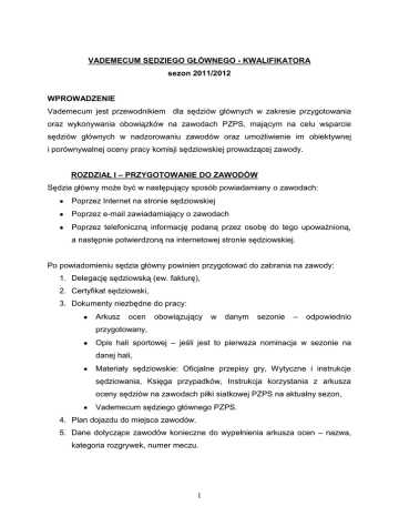 VADEMECUM SĘDZIEGO GŁÓWNEGO - KWALIFIKATORA sezon 2011/2012 WPROWADZENIE Vademecum jest przewodnikiem dla sędziów głównych w zakresie przygotowania oraz wykonywania obowiązków na zawodach PZPS, mającym na celu wsparcie sędziów głównych w nadzorowaniu zawodów oraz umożliwienie im obiektywnej i porównywalnej oceny pracy komisji sędziowskiej prowadzącej zawody. ROZDZIAŁ I – PRZYGOTOWANIE DO ZAWODÓW Sędzia główny może być w następujący sposób powiadamiany o zawodach: Poprzez Internet na stronie sędziowskiej Poprzez e-mail zawiadamiający o zawodach Poprzez telefoniczną informację podaną przez osobę do tego upoważnioną, a następnie potwierdzoną na internetowej stronie sędziowskiej. Po powiadomieniu sędzia główny powinien przygotować do zabrania na zawody: 1. Delegację sędziowską (ew. fakturę), 2. Certyfikat sędziowski, 3. Dokumenty niezbędne do pracy: Arkusz ocen obowiązujący w danym sezonie – odpowiednio przygotowany, Opis hali sportowej – jeśli jest to pierwsza nominacja w sezonie na danej hali, Materiały sędziowskie: Oficjalne przepisy gry, Wytyczne i instrukcje sędziowania, Księga przypadków, Instrukcja korzystania z arkusza oceny sędziów na zawodach piłki siatkowej PZPS na aktualny sezon, Vademecum sędziego głównego PZPS. 4. Plan dojazdu do miejsca zawodów. 5. Dane dotyczące zawodów konieczne do wypełnienia arkusza ocen – nazwa, kategoria rozgrywek, numer meczu. 1 ROZDZIAŁ II – ZAWODY A. Obowiązki podczas zawodów : 1. Weryfikacja przygotowania komisji sędziowskiej do prowadzenia zawodów. Sprawdzenie certyfikatów wszystkich sędziów wyznaczonych na zawody. Należy też zwrócić uwagę na stan psychofizyczny sędziów. Czy są wypoczęci i zdolni do sędziowania zawodów. 2. Nadzór nad weryfikacją przez komisję sędziowską przygotowania do gry obszaru kontrolowanego. Sędziowie prowadzący mają obowiązek sprawdzić stan przygotowania obiektu do zawodów i powinni wykazywać inicjatywę w usuwaniu niezgodności z przepisami, a sędzia główny powinien ich wspierać w razie potrzeby. Brak reakcji sędziów na niedomagania należy odnotować i uwzględnić w ocenie pracy sędziego. 3. Weryfikacja składów zespołów (uprawnień) przed wpisem do protokółu zawodów. Zwraca się uwagę na konieczność sprawdzenia ważności dokumentów przedstawionych do weryfikacji zgodnie z regulaminem danych zawodów. Przy sprawdzaniu ważności badań lekarskich należy pamiętać, że badanie jest ważne maksymalnie przez 6 miesięcy. Po sprawdzeniu wymaganych dokumentów wszystkich członków obu zespołów według listy przedstawionej i podpisanej przez przedstawiciela klubu sędzia główny podpisuje listy i przekazuje je sekretarzowi zawodów. Na zawodach na których jest wyznaczony komisarz, sędzia główny sprawdza zgodność wpisu do protokółu zawodów z listami zweryfikowanymi przez komisarza (ważność badań sprawdza komisarz). 4. Nadzór nad przygotowaniem przez sekretarza protokółu zawodów. Należy sprawdzić czy sekretarz prawidłowo wypełnia protokół zawodów. W szczególności oznaczenie nazwy zawodów, nazwy zespołów, numer meczu oraz wykaz członków zespołów zgodnie z dostarczoną listą, a także obsadę sędziowską meczu. 2 5. Nadzór pracy komisji sędziowskiej na hali, przed rozpoczęciem meczu. Sędziowie mają obowiązek oficjalnie wejść na salę 30 minut przed rozpoczęciem meczu. 6. Nadzór losowania. Kapitanowie drużyn uczestniczący w losowaniu mają obowiązek być ubrani w stroje meczowe. Po dokonaniu losowania i podpisaniu protokołu przez kapitanów, sprawdzana jest poprawność zarządzania oficjalną rozgrzewkę. 7. Weryfikacja składów zespołów biorących udział w rozgrzewce z zapisami w protokóle zawodów. 8. Należy sprawdzić czy w trakcie oficjalnej rozgrzewki, (15 minut przed rozpoczęciem meczu) wszyscy zawodnicy ubrani są w stroje meczowe oraz czy numery zawodników znajdujących się w strefie kontrolowanej są zapisane w protokole zawodów. Od tego momentu w strefie kontrolowanej przez komisję sędziowską mogą przebywać tylko osoby wpisane do protokółu zawodów. Ze względów organizacyjnych można zezwolić kierownikowi zespołu do przebywania za ławką dla zawodników rezerwowych swojego zespołu do czasu zakończenia oficjalnej rozgrzewki. 9. Nadzór nad prawidłową prezentacją zespołów i komisji sędziowskiej. W prezentacji zespołów uczestniczą sędzia I i II. Zawodnicy i sędziowie ustawiają się w linii na środku boiska zgodnie z obowiązującym ceremoniałem zawodów. W prezentacji komisji sędziowskiej na boisku uczestniczą sędzia I i II oraz sędziowie liniowi. Należy zwrócić uwagę, aby przy obrotach podczas prezentacji sędziowie obracali się w stronę siatki. Przed prezentacją szóstek libero oraz pozostali zawodnicy składu wyjściowego powinni siedzieć na ławce a zawodnicy rezerwowi mogą stać przy końcu ławki lub w polu rozgrzewki. 10. Korzystanie z kartek z ustawieniem początkowym. Sędzia drugi ma obowiązek przekazania sędziemu głównemu kopię kartek 3 z ustawieniem początkowym zespołów. Na zawodach PlusLigi i Plusligi kobiet sędzia główny otrzymuje kapię kartek z ustawieniem od komisarza zawodów. 11. Nadzór nad dopuszczaniem do gry uprawnionych zawodników i kontrola pracy komisji sędziowskiej w zakresie rotacji. Sędzia główny ma obowiązek nadzorowania i jeśli potrzeba reagowania , aby na boisku znajdowali się tylko zawodnicy uprawnieni do gry. Ma obowiązek kontrolowania liczby obcokrajowców znajdujących się na boisku. W przypadku stwierdzenia nieprawidłowości ma obowiązek interweniowania. Przed rozpoczęciem każdego seta Sędzia główny ma obowiązek dać znak sędziemu drugiemu w celu potwierdzenia (po sprawdzeniu), że wszyscy zawodnicy znajdujący się na boisku są wpisani na kartkach z ustawieniem początkowym zespołów. 12. Nadzór nad stosowaniem przez komisję s