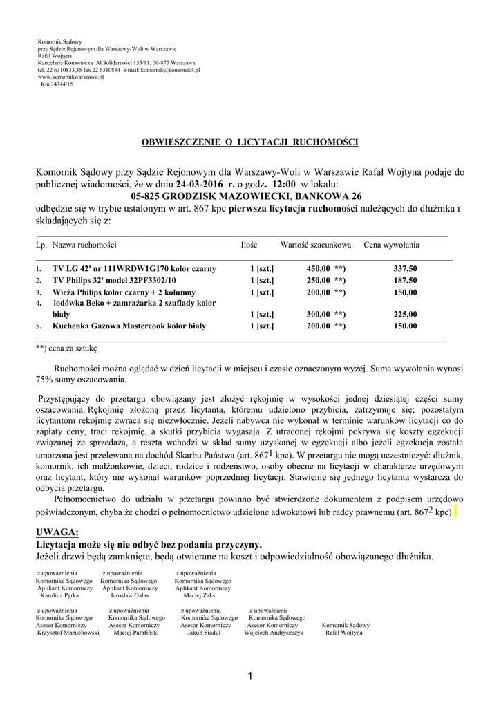 Komornik Sądowy przy Sądzie Rejonowym dla Warszawy-Woli w Warszawie Rafał Wojtyna Kancelaria Komornicza Al.Solidarności 155/11, 00-877 Warszawa tel. 22 6310833,35 fax 22 6310834 e-mail: [email protected] www.komornikwarszawa.pl Km 34344/15 OBWIESZCZENIE O LICYTACJI RUCHOMOŚCI Komornik Sądowy przy Sądzie Rejonowym dla Warszawy-Woli w Warszawie Rafał Wojtyna podaje do publicznej wiadomości, że w dniu 24-03-2016 r. o godz. 12:00 w lokalu: 05-825 GRODZISK MAZOWIECKI, BANKOWA 26 odbędzie się w trybie ustalonym w art. 867 kpc pierwsza licytacja ruchomości należących do dłużnika i składających się z: _______________________________________________________________________________________________________________________ Lp. Nazwa ruchomości Ilość Wartość szacunkowa Cena wywołania _________________________________________________________________________________________________________________________ 1. 2. 3. 4. 5. TV LG 42' nr 111WRDW1G170 kolor czarny TV Philips 32' model 32PF3302/10 Wieża Philips kolor czarny + 2 kolumny lodówka Beko + zamrażarka 2 szuflady kolor biały Kuchenka Gazowa Mastercook kolor biały 1 [szt.] 1 [szt.] 1 [szt.] 450,00 **) 250,00 **) 200,00 **) 337,50 187,50 150,00 1 [szt.] 1 [szt.] 300,00 **) 200,00 **) 225,00 150,00 _______________________________________________________________________________________________________________________ **) cena za sztukę Ruchomości można oglądać w dzień licytacji w miejscu i czasie oznaczonym wyżej. Suma wywołania wynosi 75% sumy oszacowania. Przystępujący do przetargu obowiązany jest złożyć rękojmię w wysokości jednej dziesiątej części sumy oszacowania. Rękojmię złożoną przez licytanta, któremu udzielono przybicia, zatrzymuje się; pozostałym licytantom rękojmię zwraca się niezwłocznie. Jeżeli nabywca nie wykonał w terminie warunków licytacji co do zapłaty ceny, traci rękojmię, a skutki przybicia wygasają. Z utraconej rękojmi pokrywa się koszty egzekucji związanej ze sprzedażą, a reszta wchodzi w skład sumy uzyskanej w egzekucji albo jeżeli egzekucja została umorzona jest przelewana na dochód Skarbu Państwa (art. 8671 kpc). W przetargu nie mogą uczestniczyć: dłużnik, komornik, ich małżonkowie, dzieci, rodzice i rodzeństwo, osoby obecne na licytacji w charakterze urzędowym oraz licytant, który nie wykonał warunków poprzedniej licytacji. Stawienie się jednego licytanta wystarcza do odbycia przetargu. Pełnomocnictwo do udziału w przetargu powinno być stwierdzone dokumentem z podpisem urzędowo poświadczonym, chyba że chodzi o pełnomocnictwo udzielone adwokatowi lub radcy prawnemu (art. 8672 kpc) UWAGA: Licytacja może się nie odbyć bez podania przyczyny. Jeżeli drzwi będą zamknięte, będą otwierane na koszt i odpowiedzialność obowiązanego dłużnika. z upowaznienia Komornika Sądowego Aplikant Komorniczy Karolina Pyrka z upoważnienia Komornika Sądowego Asesor Komorniczy Krzysztof Mazuchowski z upoważnienia Komornika Sądowego Aplikant Komorniczy Jarosław Galas z upoważnienia Komornika Sądowego Asesor Komorniczy Maciej Parafiński z upoważnienia Komornika Sądowego Aplikant Komorniczy Maciej Zaks z upoważnienia z upoważnienia Komornika Sądowego Komornika Sądowego Asesor Komorniczy Asesor Komorniczy Jakub Siadul Wojciech Andryszczyk 1 Komornik Sądowy Rafał Wojtyna