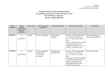 Załącznik do Uchwały Nr IX/177/2016 RIN w Krakowie z dnia 19.12.2016 r. HARMONOGRAM ZAJĘĆ SEMINARYJNYCH dla aplikantów notarialnych z naboru 2013 roku (IV rok) Izby Notarialnej w Krakowie styczeń – czerwiec 2017 roku Termin wykładów Liczba jednostek szkoleniowych [godziny wykładów] 20.01.2017 8 Forma zajęć Zakres tematyczny przedmiotu 4 [9.00-12.00] Tytuły aktów prawnych Wykładowcy wykład Prawo o notariacie Postępowanie skargowe Ustawa z dnia 14 lutego 1991 r. – Prawo o notariacie (t. j. Dz. U. z 2014 r., poz. 164 ze zm.); Ustawa z dnia14 czerwca 1960 r. Kodeks postępowania administracyjnego (t. j. Dz. U. z 2013 r., poz. 267 ze zm.); wykład Prawo o notariacie Kodeks etyki zawodowej notariusza Postępowanie dyscyplinarne Ustawa z dnia 14 lutego 1991 Not. Roman Ozga r. – Prawo o notariacie (t. j. Dz. U. z 2014 r., poz. 164 ze zm.); Uchwała nr VII/21/2011 KRN z dnia 05 marca 2011 roku w sprawie przyjęcia tekstu jednolitego kodeksu etyki zawodowej notariusza. [9.00-15.30 21.01.2017 Tematyka wykładów Not. Jadwiga Krupa, Not. Sylwia Jankiewicz Załącznik do Uchwały Nr IX/177/2016 RIN w Krakowie z dnia 19.12.2016 r. 4 ćwiczenia Prawo cywilne, prawo rolne Rozwiązywanie kazusów z problematyki ustawy o lasach i ustawy o kształtowaniu ustroju rolnego Ustawa z dnia 5 sierpnia 2015 roku o kształtowaniu ustroju rolnego (tj. Dz. U. z 2015 r., poz. 1433 i 2179; Ustawa z dnia 28 września 1991 r. o lasach (t. j. Dz. U. z 2015 r., poz. 2100, z 2016 r., poz. 422, 586, 903, 1020) Not. Krzysztof Maj – Prezes RIN w Krakowie ćwiczenia Prawo podatkowe, Prawo o notariacie Obowiązki notariusza jako płatnika pcc i sd - powtórzenie Ustawa z dnia 28 lipca 1983 r. o podatku od spadków i darowizn (t. j. Dz. U. z dnia 2015, poz. 86 ze zm.); Ustawa z dnia 9 września 2000 r. o podatku od czynności cywilnoprawnych (t. j. Dz. U. z dnia 2015 r, poz. 626 ze zm.); Not. A Urbanik ćwiczenia Prawo cywilne Odmowa czynności notarialnej, zwolnienie z opłat sądowych i notarialnych, protokoły z innych czynności w tym z niedojścia czynności do skutku, loterii i gier losowych Ustawa z dnia 14 lutego 1991 r. Prawo o notariacie (tj. Dz. U. z 2014 r., poz. 164 ze zm.); dr Halina Nowara-Bacz [12.30-15.30] 27.01.2017 4 [9.00-12.00] 4 [12.30-15.30] Załącznik do Uchwały Nr IX/177/2016 RIN w Krakowie z dnia 19.12.2016 r. 28.01.2017 4 wykład Prawo gospodarcze Jednoosobowa działalność gospodarcza. Spółki komandytowe o komandytowoakcyjne i ich przekształcenia Ustawa z dnia 2 lipca 2004 r. o swobodzie działalności gospodarczej (t. j. Dz. U. z 2015 r., poz. 584 ze zm.), Ustawa z dnia 15 września 2000 r. Kodeks spółek handlowych (t. j. Dz. U. z 2013 r., poz. 1030 ze zm.); Not. Radosław Chorabik wykład Prawo o notariacie Problemy młodego notariusza związane z uruchomieniem kancelarii notarialnej Ustawa z dnia 14 lutego 1991 r. – Prawo o notariacie (t. j. Dz. U. z 2014 r., poz. 164 ze zm.); rozporządzenia wykonawcze Not. Roman Wendelski ćwiczenia Prawo spadkowe Rozwiązywanie kazusów z zakresu prawa spadkowego Ustawa z dnia 23 kwietnia 1964 r. Kodeks cywilny (t. j. Dz. U. z 2014 r., poz. 121 ze zm.); dr Jakub Biernat - notariusz ćwiczenia Prawo cywilne Rozwiązywanie kazusów (aktów notarialnych i innych czynności notarialnych) z udziałem cudzoziemców oraz osób Ustawa z dnia 24 marca 1920 r. o nabywaniu nieruchomości przez cudzoziemców (tj. Dz. U. z 2014 r., poz. 1380, z 2015 r., poz. 1433); Ustawa z dnia 23 kwietnia 1964 r. Kodeks cywilny (t. j. Dz. U. z 2014 r., poz. 121 ze Not. Joanna Greguła [9.00-12.00] 4 [12.30-15.30] 03.02.2017 4 [9.00-12.00] 4 [12.30-15.30] Załącznik do Uchwały Nr IX/177/2016 RIN w Krakowie z dnia 19.12.2016 r. 04.02.2017 4 [12.30-15.30] zm.); Ustawa z dnia 14 lutego 1991 r. – Prawo o notariacie (t. j. Dz. U. z 2014 r., poz. 164 ze zm.); wykład Prawo międzynarodowe Międzynarodowe struktury notariatu, omówienie różnic systemowych notariatów europejskich i pozaeuropejskich Ustawa z dnia 4 lutego 2011 r. Not. Tomasz Kot – Prawo prywatne międzynarodowe (t. j. Dz. U. z 2011 r., poz. 432 ze zm.), Rozporządzenie Parlamentu Europejskiego i Rady (UE) nr 650/2012 z dnia 4 lipca 2012 r. w sprawie jurysdykcji, prawa właściwego, uznawania i wykonywania orzeczeń, przyjmowania i wykonywania dokumentów urzędowych dot. dziedziczenia oraz w sprawie ustanowienia europejskiego poświadczenia spadkowego wykład Prawo cywilne Spółki osobowe, „nietypowe osoby prawne” powtórzenie Ustawa z dnia 23 kwietnia 1964 r. Kodeks cywilny (t. j. Dz. U. z 2014 r., poz. 121 ze zm.); Ustawa z dnia 17 lutego 1961 r. o instytutach naukowobadawczych (Dz. U. z 1961 r Nr 12, poz. 60); [9.00-12.00] 4 niepełnosprawnych. Obowiązki notariusza w zakresie czynności z udziałem cudzoziemców Not. Joanna Greguła Załącznik do Uchwały Nr IX/177/2016 RIN w Krakowie z dnia 19.12.2016 r. Ustawa z dnia 26 kwietnia 1984 r. o fundacjach (tj. Dz. U z 2016 r., poz. 40); Ustawa z dnia 7 kwietnia 1989 r. Prawo o stowarzyszeniach (tj. Dz. U. z 2015 r., poz. 1393, 1923); Ustawa z dnia 23 maja 1991 r. o związkach zawodowych (tj. Dz. U. z 2015 r., poz. 1881); Ustawa z dnia 27 czerwca 1997 r. o partiach politycznych (tj. Dz. U. z 2016 r., poz. 1157); Ustawa z dnia 17 maja 1989 r. o stosunku Państwa do Kościoła Katolickiego w RP (tj. Dz. U. z 2013 r., poz. 1169, z 2014 r., poz. 498); Ustawa o gwarancji wolności sumienia i wyznania (tj. z 20105 r., Nr 231,poz., 1965 ze zm.); 17.02.2017 4 wykład Odrębna własność lokali, prawo cywilne Zmiana odrębnej własności lokalu powtórzenie Ustawa z dnia 24 czerwca 1994 r. o własności lokali (tj. Dz. U. z 2015 r., poz. 1892) Not. Krzysztof Maj – Prezes RIN w Krakowie wykład Odrębna własność lokali, prawo cywilne Protokoły wspólnot mieszkaniowych powtórzenie Ustawa z dnia 24 czerwca 1994 r. o własności lokali (tj. Dz. U. z 2015 r., poz. 1892) Not. Krzysztof Maj – Prezes RIN w Krakowie [9.00-12.00] 4 [12.30-15.3