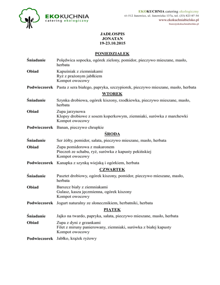 EKOKUCHNIA catering ekologiczny 43 -512 Janowice, ul. Janowicka 137a, tel. (33) 823 07 54 www.ekokuchniabielsko.pl [email protected] JADŁOSPIS JONATAN 19-23.10.2015 PONIEDZIAŁEK Śniadanie Polędwica sopocka, ogórek zielony, pomidor, pieczywo mieszane, masło, herbata Obiad Kapuśniak z ziemniakami Ryż z prażonym jabłkiem Kompot owocowy Podwieczorek Pasta z sera białego, papryka, szczypiorek, pieczywo mieszane, masło, herbata WTOREK Śniadanie Szynka drobiowa, ogórek kiszony, rzodkiewka, pieczywo mieszane, masło, herbata Obiad Zupa jarzynowa Klopsy drobiowe z sosem koperkowym, ziemniaki, surówka z marchewki Kompot owocowy Podwieczorek Banan, pieczywo chrupkie ŚRODA Śniadanie Ser żółty, pomidor, sałata, pieczywo mieszane, masło, herbata Obiad Zupa pomidorowa z makaronem Pieczeń ze schabu, ryż, surówka z kapusty pekińskiej Kompot owocowy Podwieczorek Kanapka z szynką wiejską i ogórkiem, herbata CZWARTEK Śniadanie Pasztet drobiowy, ogórek kiszony, pomidor, pieczywo mieszane, masło, herbata Obiad Barszcz biały z ziemniakami Gulasz, kasza jęczmienna, ogórek kiszony Kompot owocowy Podwieczorek Jogurt naturalny ze słonecznikiem, herbatniki, herbata PIĄTEK Śniadanie Jajko na twardo, papryka, sałata, pieczywo mieszane, masło, herbata Obiad Zupa z dyni z grzankami Filet z miruny panierowany, ziemniaki, surówka z białej kapusty Kompot owocowy Podwieczorek Jabłko, krążek ryżowy