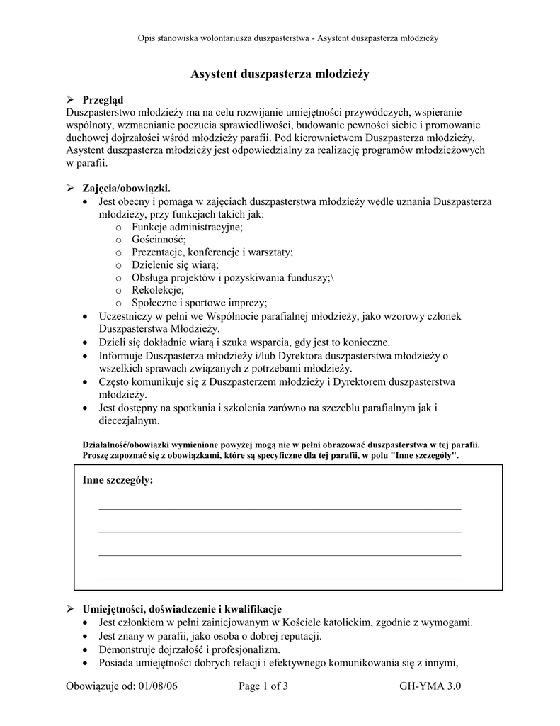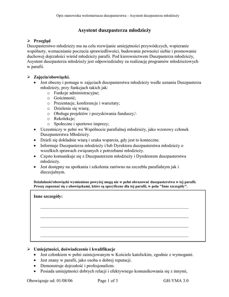 Opis stanowiska wolontariusza duszpasterstwa - Asystent duszpasterza młodzieży Asystent duszpasterza młodzieży Przegląd Duszpasterstwo młodzieży ma na celu rozwijanie umiejętności przywódczych, wspieranie wspólnoty, wzmacnianie poczucia sprawiedliwości, budowanie pewności siebie i promowanie duchowej dojrzałości wśród młodzieży parafii. Pod kierownictwem Duszpasterza młodzieży, Asystent duszpasterza młodzieży jest odpowiedzialny za realizację programów młodzieżowych w parafii. Zajęcia/obowiązki. Jest obecny i pomaga w zajęciach duszpasterstwa młodzieży wedle uznania Duszpasterza młodzieży, przy funkcjach takich jak: o Funkcje administracyjne; o Gościnność; o Prezentacje, konferencje i warsztaty; o Dzielenie się wiarą; o Obsługa projektów i pozyskiwania funduszy;\ o Rekolekcje; o Społeczne i sportowe imprezy; Uczestniczy w pełni we Wspólnocie parafialnej młodzieży, jako wzorowy członek Duszpasterstwa Młodzieży. Dzieli się dokładnie wiarą i szuka wsparcia, gdy jest to konieczne. Informuje Duszpasterza młodzieży i/lub Dyrektora duszpasterstwa młodzieży o wszelkich sprawach związanych z potrzebami młodzieży. Często komunikuje się z Duszpasterzem młodzieży i Dyrektorem duszpasterstwa młodzieży. Jest dostępny na spotkania i szkolenia zarówno na szczeblu parafialnym jak i diecezjalnym. Działalność/obowiązki wymienione powyżej mogą nie w pełni obrazować duszpasterstwa w tej parafii. Proszę zapoznać się z obowiązkami, które są specyficzne dla tej parafii, w polu "Inne szczegóły". Inne szczegóły: ________________________________________________________________________ ________________________________________________________________________ ________________________________________________________________________ ________________________________________________________________________ Umiejętności, doświadczenie i kwalifikacje Jest członkiem w pełni zainicjowanym w Kościele katolickim, zgodnie z wymogami. Jest znany w parafii, jako osoba o dobrej reputacji. Demonstruje dojrzałość i profesjonalizm. Posiada umiejętności dobrych relacji i efektywnego komunikowania się z innymi, Obowiązuje od: 01/08/06 Page 1 of 3 GH-YMA 3.0 Opis stanowiska wolontariusza duszpasterstwa - Asystent duszpasterza młodzieży szczególnie z dziećmi, młodzieżą i ich rodzinami. W nagłych przypadkach wie, z kim się kontaktować i/lub zna procedury. Jest chętny do stałego uczestnictwa w formacji. Osobiste cechy i zalety Pragnie służyć wspólnocie i przeznacza na to czas i talent. Winien być człowiekiem modlitwy. Uczciwy, niezawodny i mogący utrzymywać ścisłą poufność. Posiada wystarczającą dojrzałość by wykonywać tę posługę z właściwą uwagą. Wykazuje się energią, entuzjazmem i troską wobec młodzieży i ich rodzin. Ma łatwość, dzielenia się swoją osobistą wiarą. Nie ma problemu z byciem rozliczanym oraz przestrzega właściwych granic. Orientacja i szkolenia Standardowy program orientacji parafii. Istnieją zasoby i sesje świadczone przez Biuro młodzieży katolickiej w Archidiecezji Toronto. Grupa uczestników Inni Asystenci duszpasterstwa młodzieży, młodzież i ich rodziny. Wsparcie, nadzór i ewaluacja Dyrektor duszpasterstwa młodzieży jest pierwszym poziomem wsparcia, nadzoru i oceny. Długość kadencji Trzy do pięciu lat z możliwością odnowienia. (Ogólne ryzyko) Termin jednego roku z możliwością odnowienia (* Wysokie ryzyko) Korzyści i warunki pracy Bezpośrednio przyczyni się do dobrobytu społecznego wspólnoty parafialnej. Wzbogaci rozwój swojej wiary. Możliwość pracy społecznej i nabrania doświadczenia do wykorzystania w szkole bądź dla awansowania kariery. Jest to pozycja wolontariatu, która wymaga zaangażowania czasu ___ godzin na tydzień / ___ godzin miesięcznie. Musi być w stanie uczestniczyć w regularnie odbywających się zebraniach. Musi być w stanie uczestniczyć w sesji orientacyjnej i szkoleniach, zgodnie z wymaganiami. Zalecenia przy selekcji To jest pozycji ryzyka ogólnego (chyba, że uczestnicy są młodsi niż 16 lat, wtedy jest to stanowisko wysokiego ryzyka *). Wymagane jest wypełnienie formularza Dane wolontariusza. Szkolenie i orientacja są wymagane. Będzie nadzór i okresowe ewaluacje. Obowiązuje od: 01/08/06 Page 2 of 3 GH-YMA 3.0 Opis stanowiska wolontariusza duszpasterstwa - Asystent duszpasterza młodzieży Ten opis stanowiska dokładnie odzwierciedla opis stanowiska Asystent duszpasterswa młodzieży obecnie praktykowane w _________________________________________. (Nazwa parafii) ___________________________________ Parafialny komitet selekcji wolontariuszy ___________________________________ Proboszcz __________________________________ Data Przygotowane przez: Archidiecezja Toronto Obowiązuje od: 01/08/06 Page 3 of 3 GH-YMA 3.0