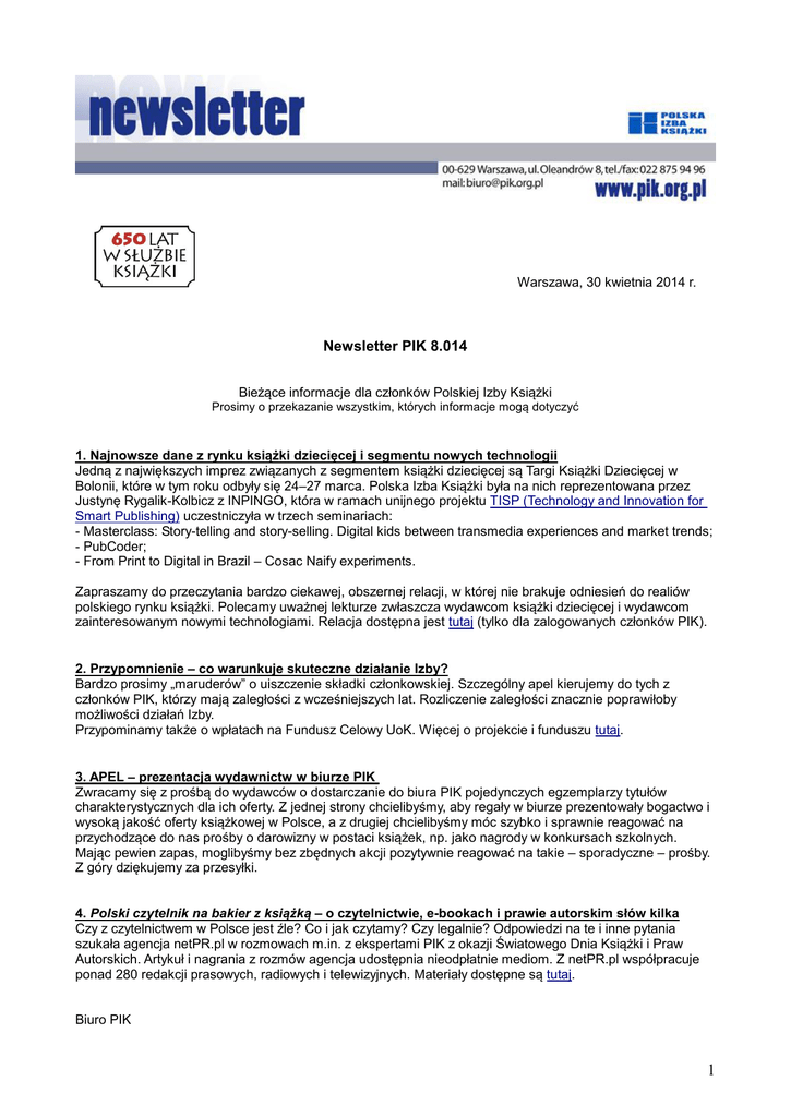 Warszawa, 30 kwietnia 2014 r. Newsletter PIK 8.014 Bieżące informacje dla członków Polskiej Izby Książki Prosimy o przekazanie wszystkim, których informacje mogą dotyczyć 1. Najnowsze dane z rynku książki dziecięcej i segmentu nowych technologii Jedną z największych imprez związanych z segmentem książki dziecięcej są Targi Książki Dziecięcej w Bolonii, które w tym roku odbyły się 24–27 marca. Polska Izba Książki była na nich reprezentowana przez Justynę Rygalik-Kolbicz z INPINGO, która w ramach unijnego projektu TISP (Technology and Innovation for Smart Publishing) uczestniczyła w trzech seminariach: - Masterclass: Story-telling and story-selling. Digital kids between transmedia experiences and market trends; - PubCoder; - From Print to Digital in Brazil – Cosac Naify experiments. Zapraszamy do przeczytania bardzo ciekawej, obszernej relacji, w której nie brakuje odniesień do realiów polskiego rynku książki. Polecamy uważnej lekturze zwłaszcza wydawcom książki dziecięcej i wydawcom zainteresowanym nowymi technologiami. Relacja dostępna jest tutaj (tylko dla zalogowanych członków PIK). 2. Przypomnienie – co warunkuje skuteczne działanie Izby? Bardzo prosimy „maruderów” o uiszczenie składki członkowskiej. Szczególny apel kierujemy do tych z członków PIK, którzy mają zaległości z wcześniejszych lat. Rozliczenie zaległości znacznie poprawiłoby możliwości działań Izby. Przypominamy także o wpłatach na Fundusz Celowy UoK. Więcej o projekcie i funduszu tutaj. 3. APEL – prezentacja wydawnictw w biurze PIK Zwracamy się z prośbą do wydawców o dostarczanie do biura PIK pojedynczych egzemplarzy tytułów charakterystycznych dla ich oferty. Z jednej strony chcielibyśmy, aby regały w biurze prezentowały bogactwo i wysoką jakość oferty książkowej w Polsce, a z drugiej chcielibyśmy móc szybko i sprawnie reagować na przychodzące do nas prośby o darowizny w postaci książek, np. jako nagrody w konkursach szkolnych. Mając pewien zapas, moglibyśmy bez zbędnych akcji pozytywnie reagować na takie – sporadyczne – prośby. Z góry dziękujemy za przesyłki. 4. Polski czytelnik na bakier z książką – o czytelnictwie, e-bookach i prawie autorskim słów kilka Czy z czytelnictwem w Polsce jest źle? Co i jak czytamy? Czy legalnie? Odpowiedzi na te i inne pytania szukała agencja netPR.pl w rozmowach m.in. z ekspertami PIK z okazji Światowego Dnia Książki i Praw Autorskich. Artykuł i nagrania z rozmów agencja udostępnia nieodpłatnie mediom. Z netPR.pl współpracuje ponad 280 redakcji prasowych, radiowych i telewizyjnych. Materiały dostępne są tutaj. Biuro PIK 1