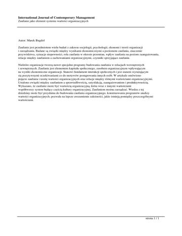 International Journal of Contemporary Management Zaufanie jako element systemu wartości organizacyjnych Autor: Marek Bugdol Zaufanie jest przedmiotem wielu badań z zakresu socjologii, psychologii, ekonomi i teorii organizacji i zarządzania. Badane są związki między wynikami ekonomicznymi a poziomem zaufania, znaczenie przywództwa, sytuacje niepewności, rola zaufania w okresie przemian, wpływ zaufania na poziom zaangażowania, relacje między zaufaniem a zachowaniami organizacyjnymi, czynniki sprzyjające zaufaniu. Niektóre organizacje tworzą nawet specjalne programy budowania zaufania w relacjach wewnętrznych i zewnętrznych. Zaufanie jest elementem kapitału społecznego, zasobem organizacyjnym wpływającym na wyniki ekonomiczne organizacji. Stanowi fundament interakcji społecznych i jest stanem wyrażającym się pozytywnymi oczekiwaniami co do motywów postępowania innych osób. W artykule omówiono pojęcie zaufania i teorię wartości organizacyjnych oraz relacje między różnymi wartościami organizacyjnymi. Ustalono związki między zaufaniem a sprawiedliwością, satysfakcją, zaangażowaniem i produktywnością. Wykazano, że zaufanie może być wartością organizacyjną, która wraz z innymi wartościami współtworzy system będący częścią kultury organizacyjnej. Zaufaniem można zarządzać. Wiedza z tej dziedziny może być przydatna do budowania zaufania organizacyjnego, konstruowania programów analizy wartości organizacyjnych; pozwala na lepsze zrozumienie zależności, jakie istnieją pomiędzy poszczególnymi wartościami. strona 1 / 1